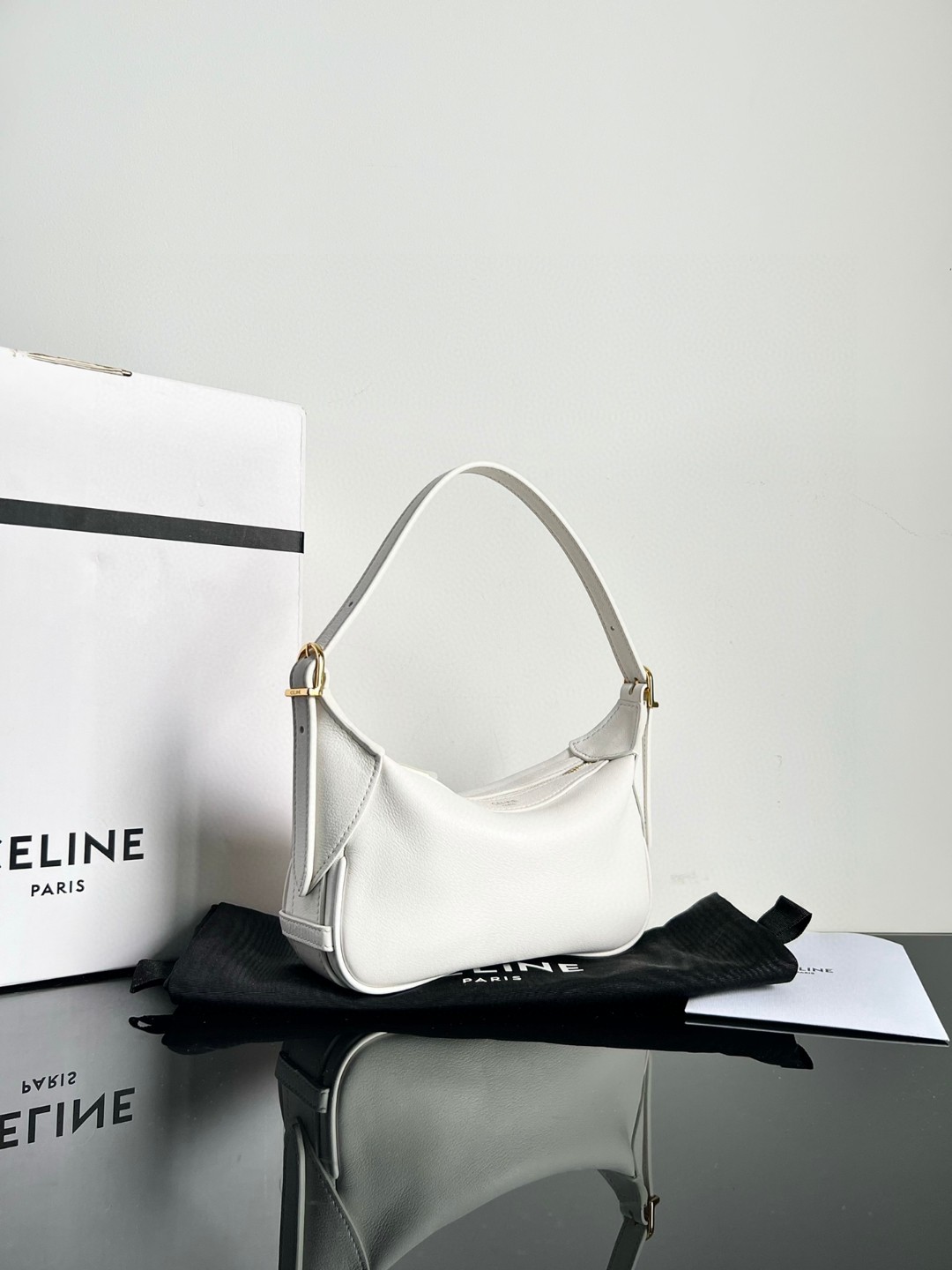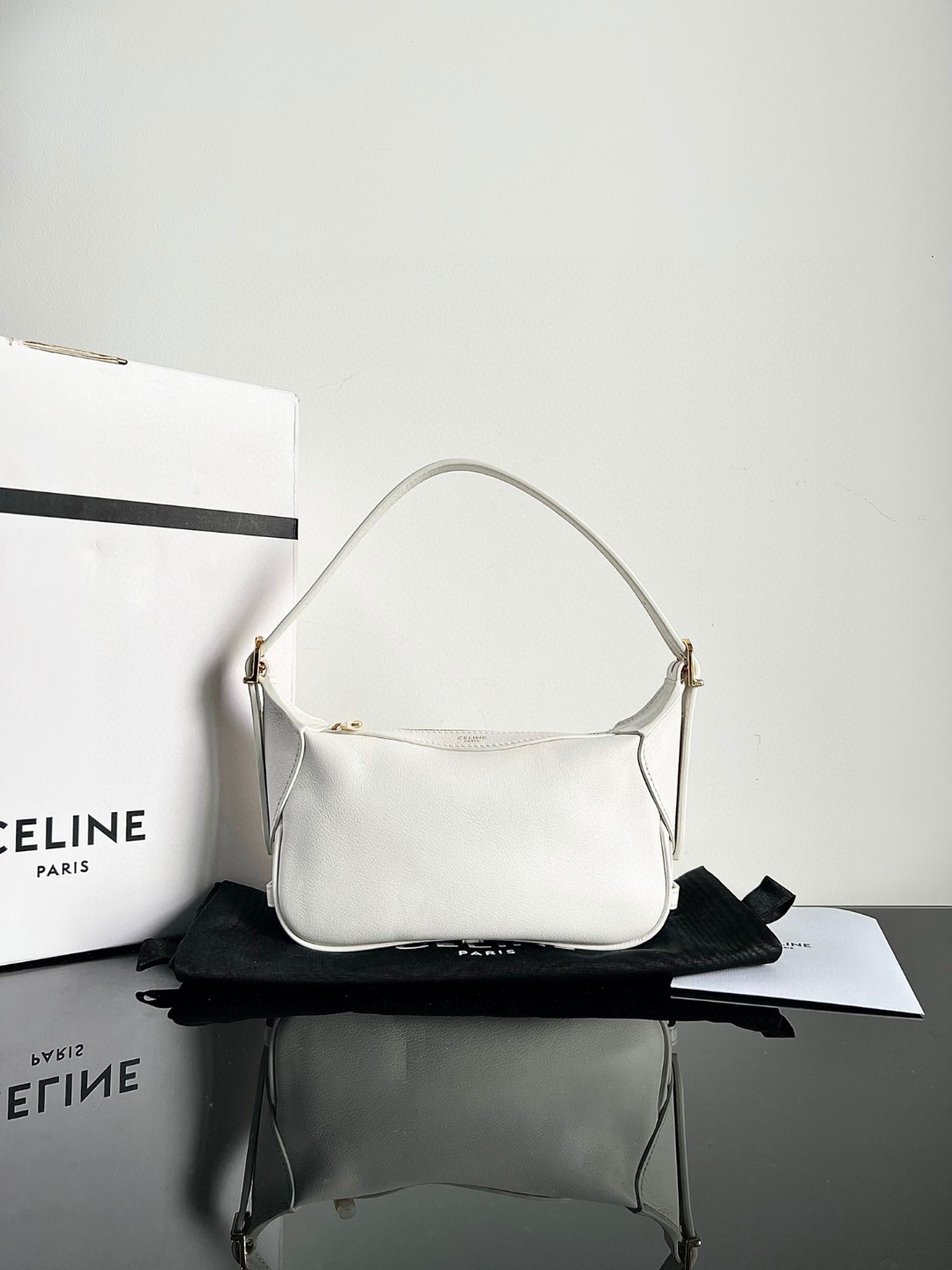 CELINE ROMY Mini Soft Calfskin Handbag [Original Factory Leather, Full Hardware] Dimensions: 19 X 14 X 5cm. This model can fit larger smartphone models like PLUS. Calfskin, calf suede lining, gold finish, shoulder/crossbody wear and hand carry, 1 main zippered compartment, adjustable strap.