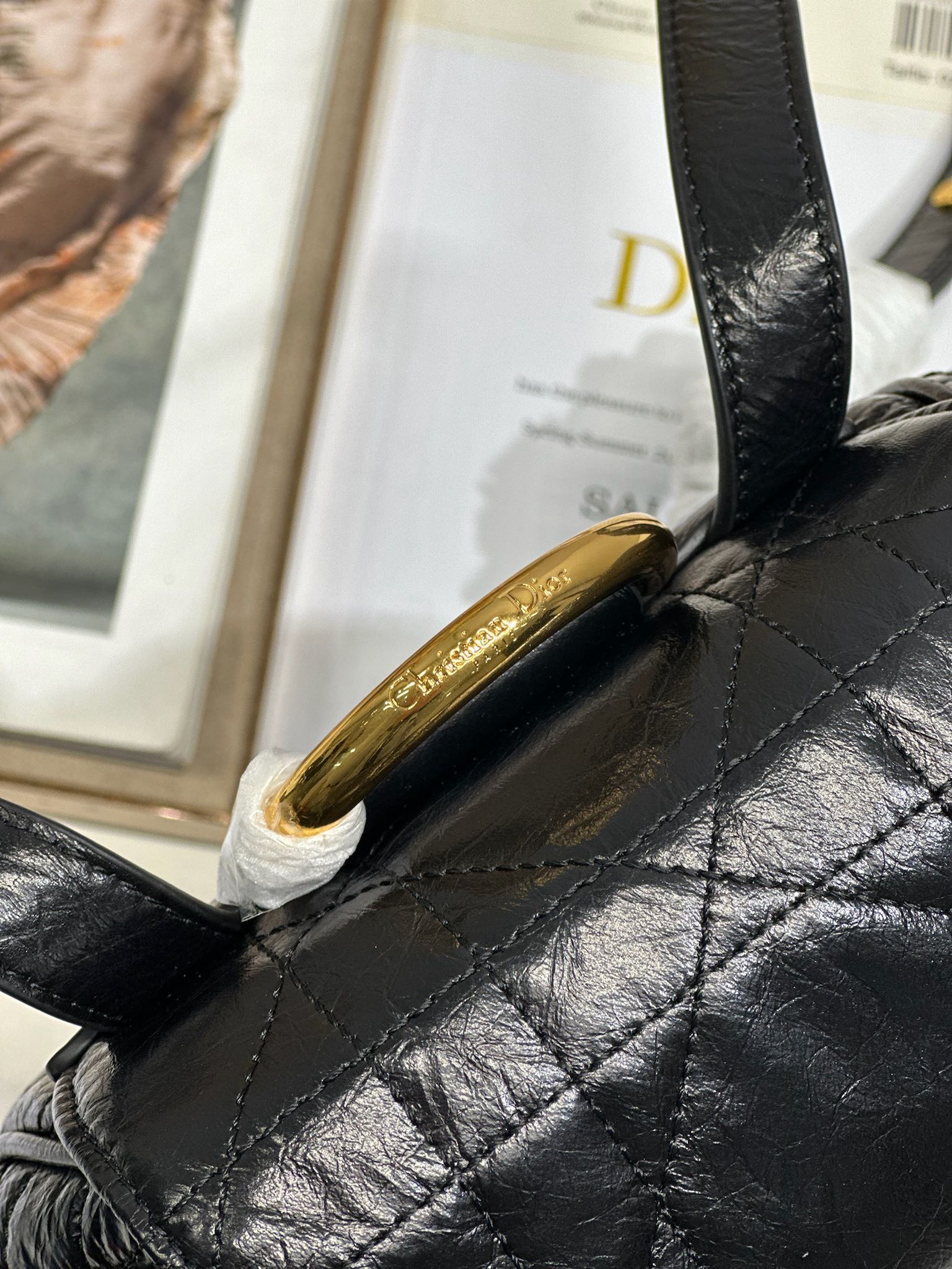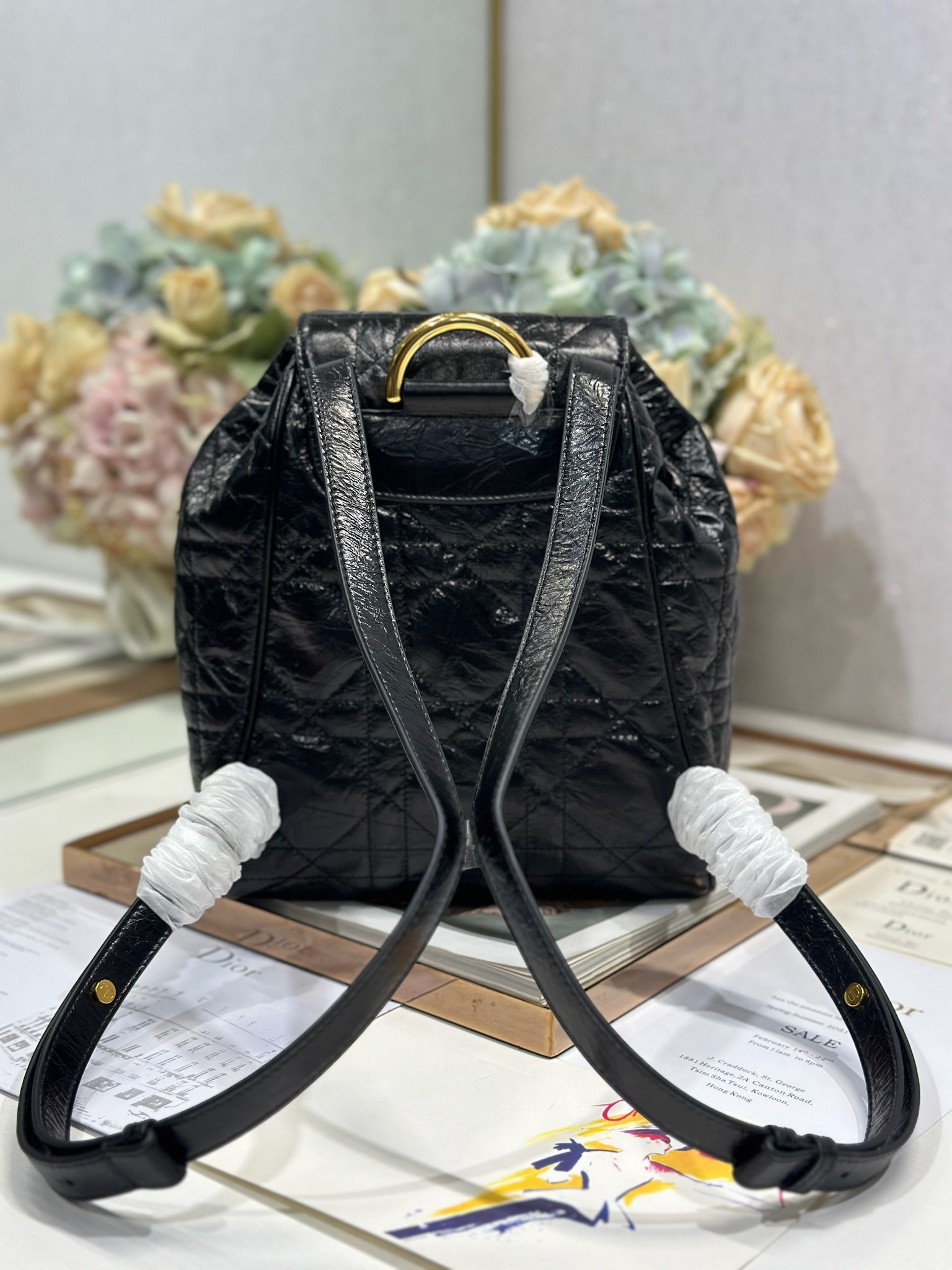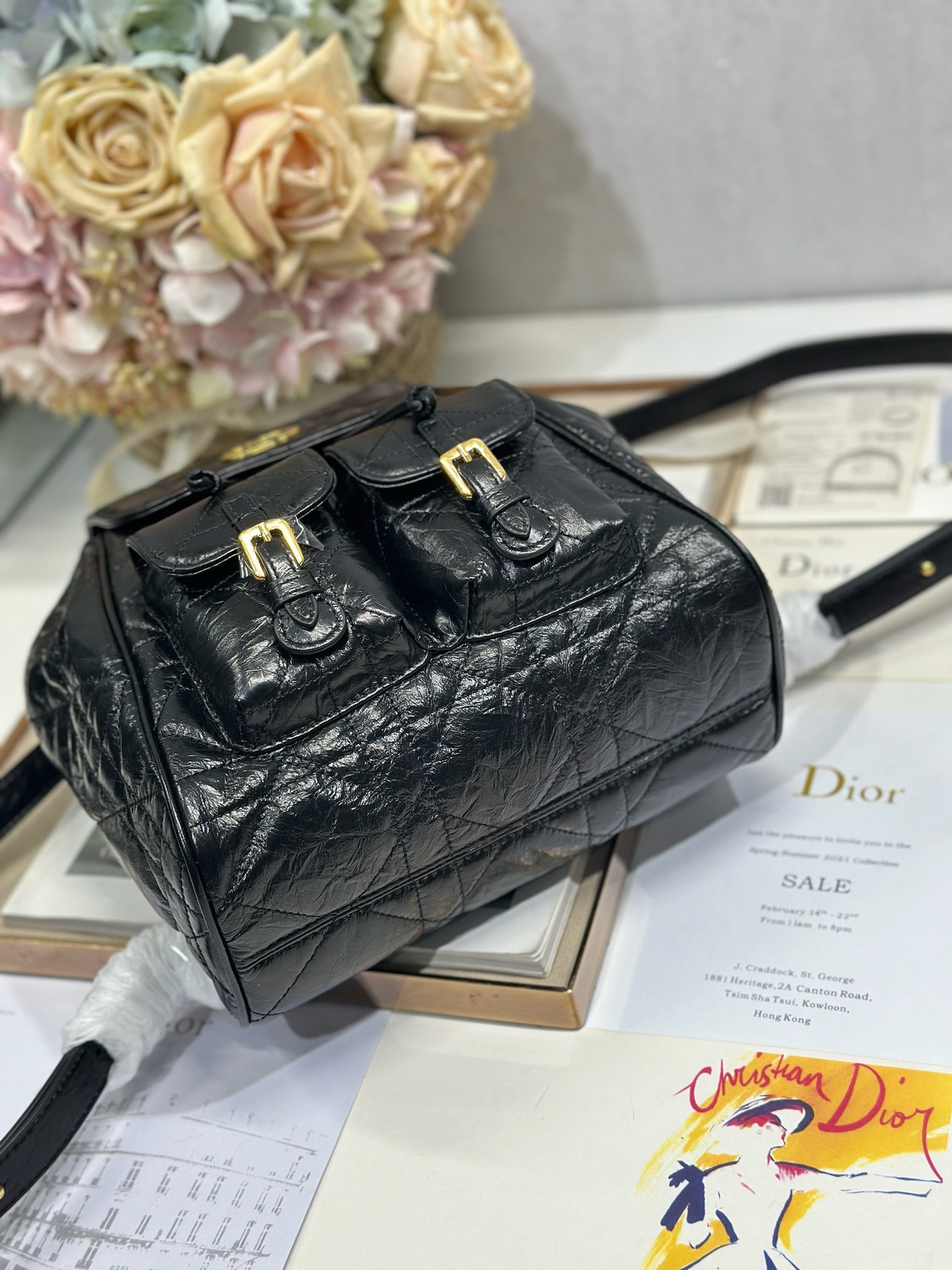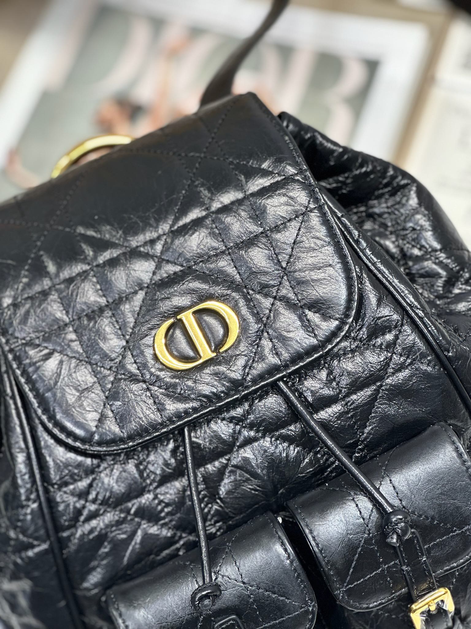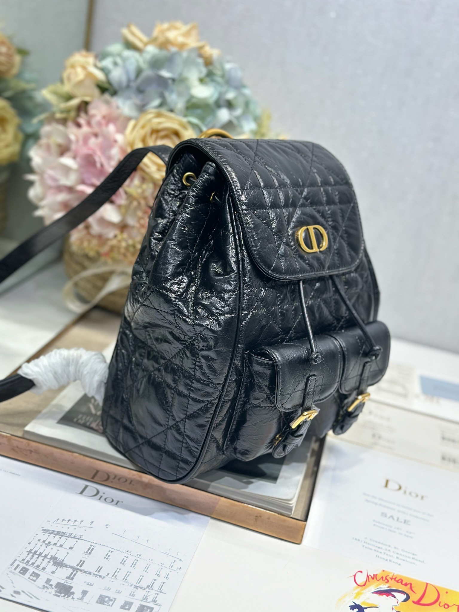 This Dior Caro backpack is a new addition to the early spring 2025 ready-to-wear collection, showcasing a fashionable and elegant style. Meticulously crafted from black lambskin leather and other materials, it features an oversized grained cannage stitching pattern for enhanced sophistication. The flap is adorned with a vintage gold-finish metal CD logo, while inside reveals a spacious drawstring main compartment. Two small flap pockets can hold various daily essentials. The medium style comes with gold-finish handles and an adjustable shoulder strap for added comfort.
