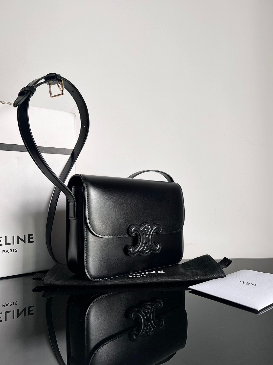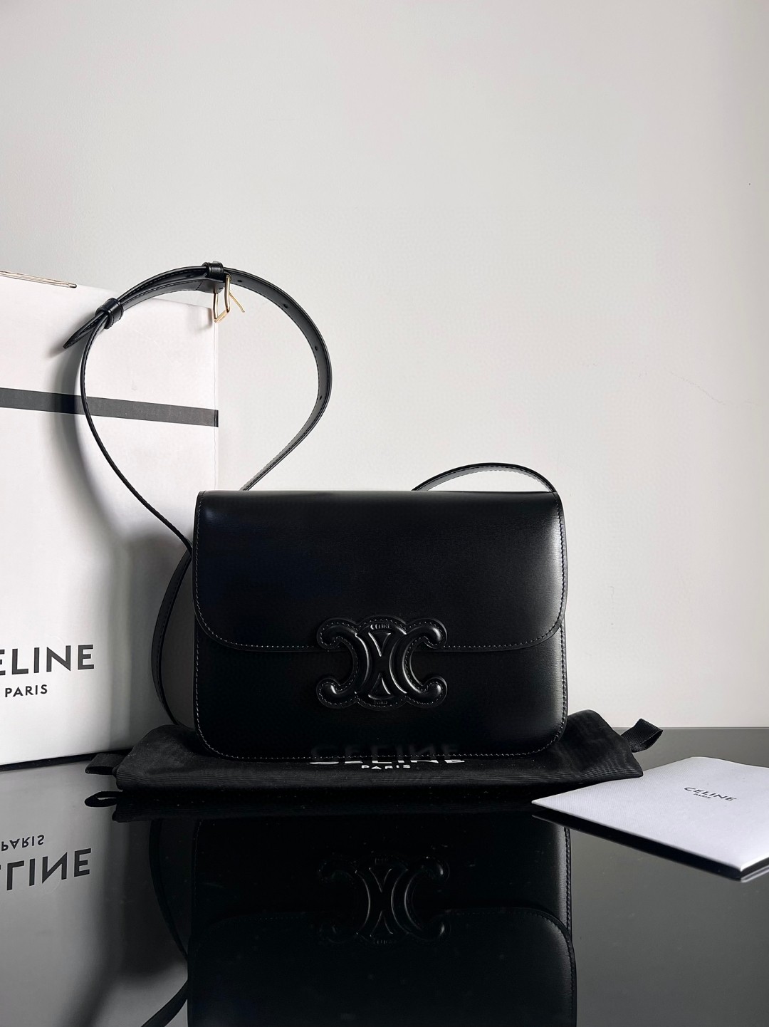 CELINE TRIOMPHE Triumph Arch leather buckle medium size, dimensions: 22.5 X 16.5 X 7.5cm. Original factory leather, all-steel hardware, TRIOMPHE outer cowhide, lambskin lining, crossbody and shoulder carry, TRIOMPHE cowhide embossed process buckle, inner zippered pocket and flat pocket, adjustable leather shoulder strap, original genuine leather, top original quality.