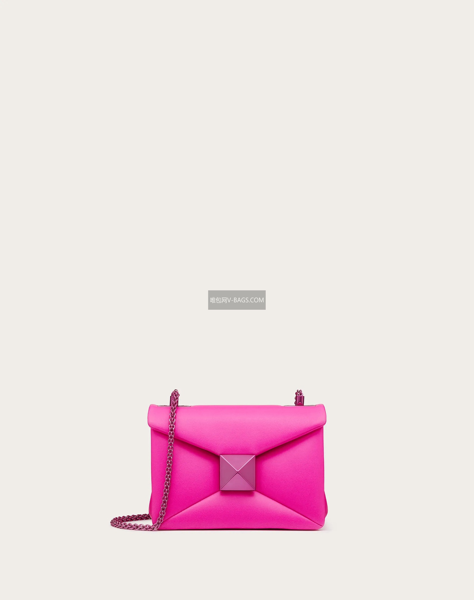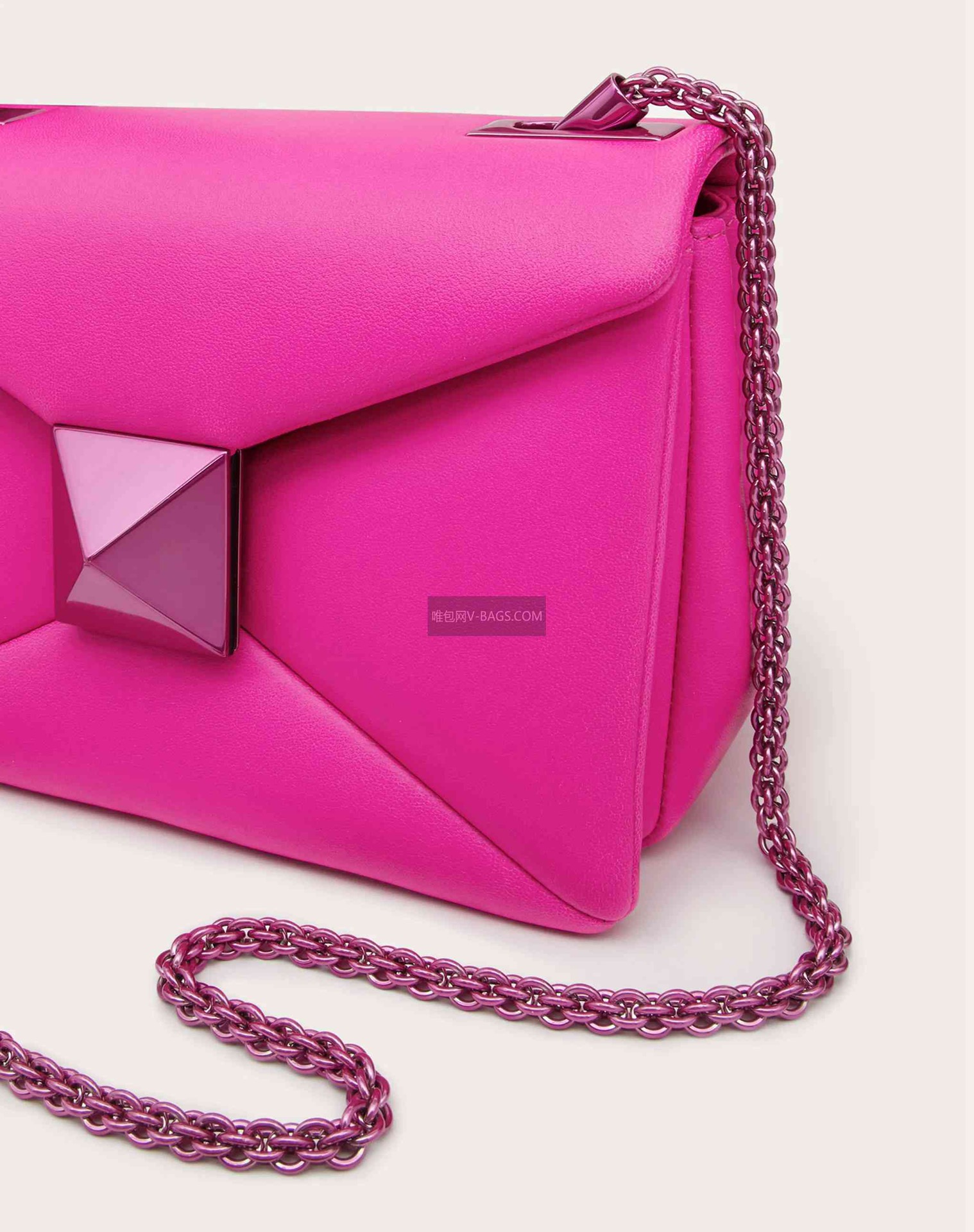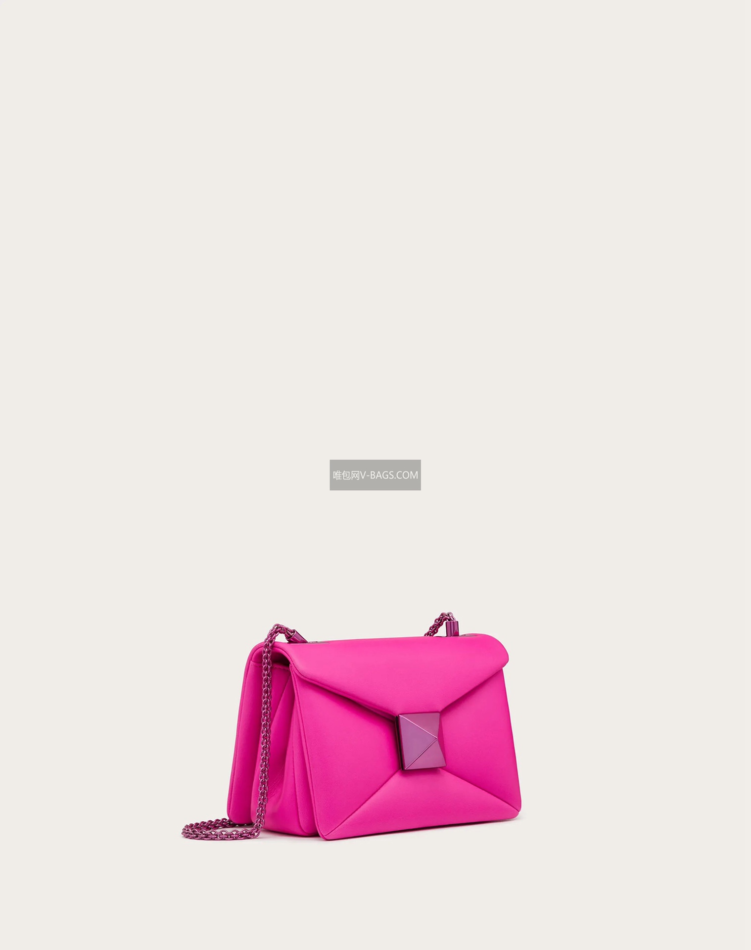 Chain Lambskin Tofu Bag, front with oversized studs, adjustable shoulder strap, can be worn crossbody or handheld, magnetic closure, lined with soft lambskin