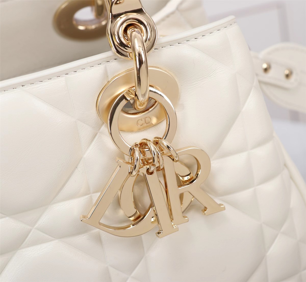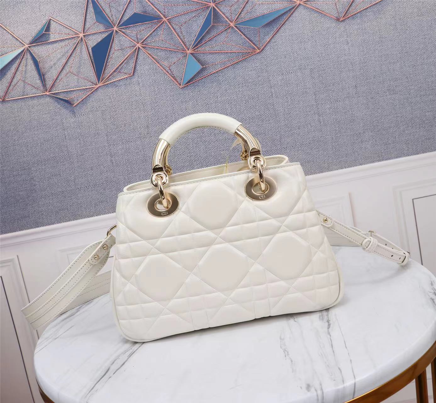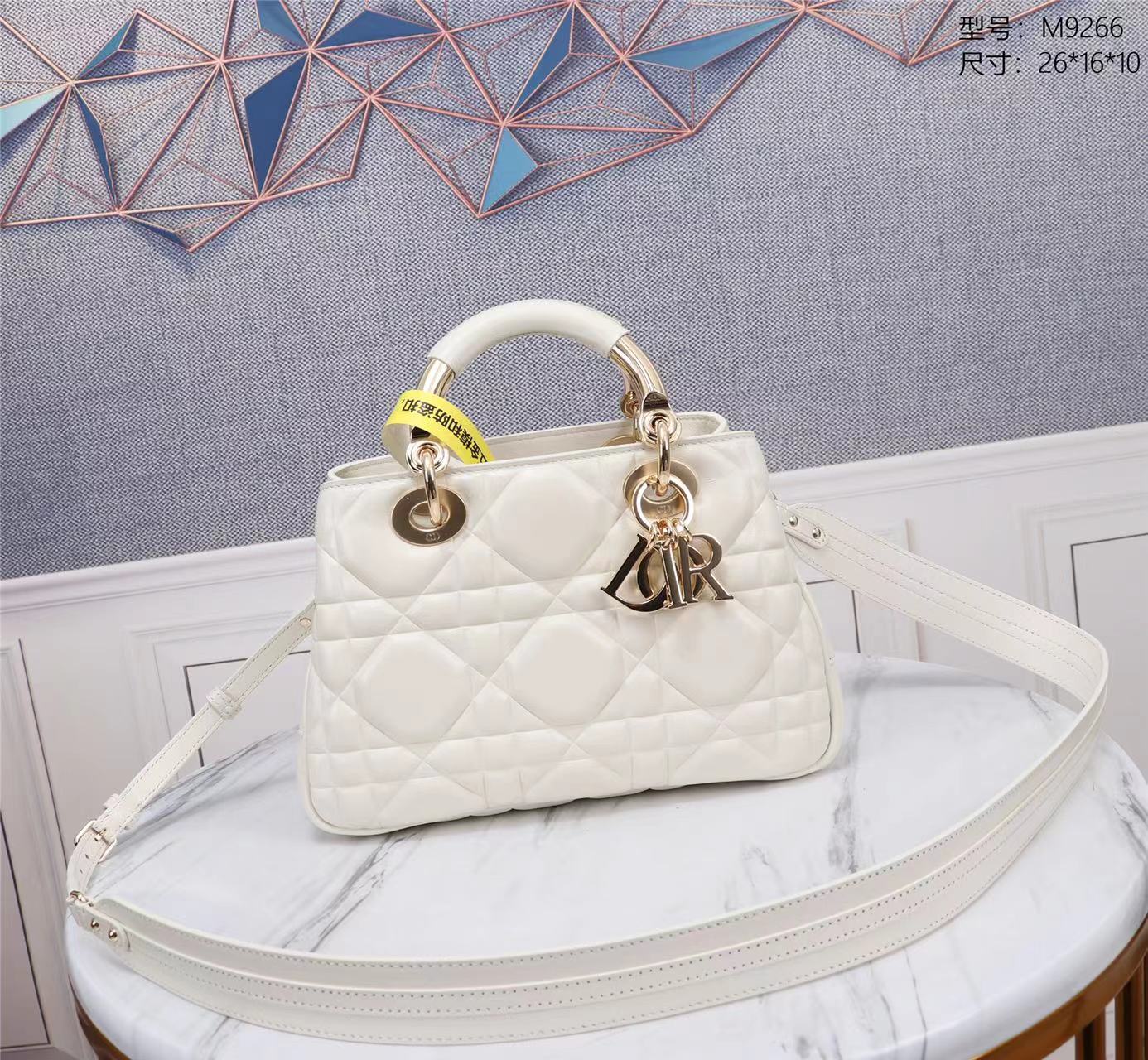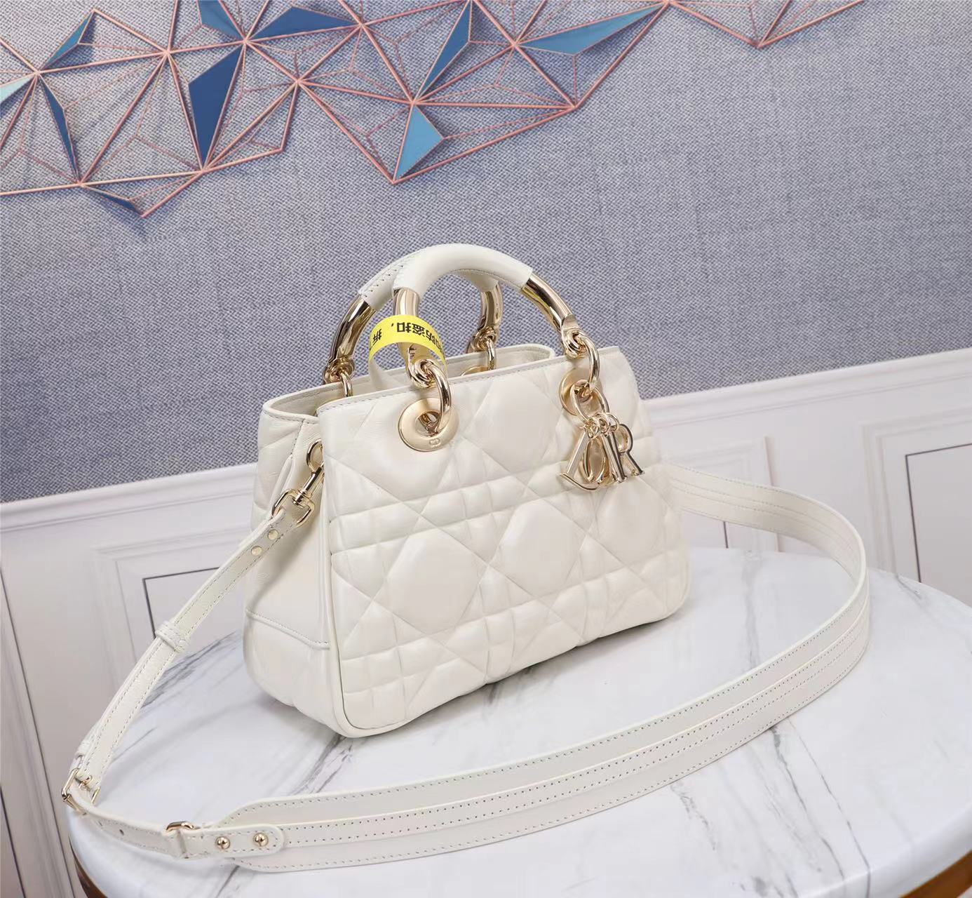 This Lady Dior handbag is the latest runway show style, paired with a new design of gold buckle colored metal handles, showcasing fashion. Meticulously crafted from white calfskin leather, adorned with unique quilted oversized cannage pattern and two spacious compartments, featuring a zippered pocket to store valuables. Detachable high-quality leather shoulder strap, can be worn on the shoulder or cross-body, combined with handles for easy carrying.