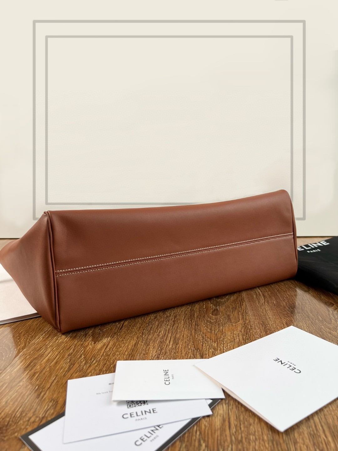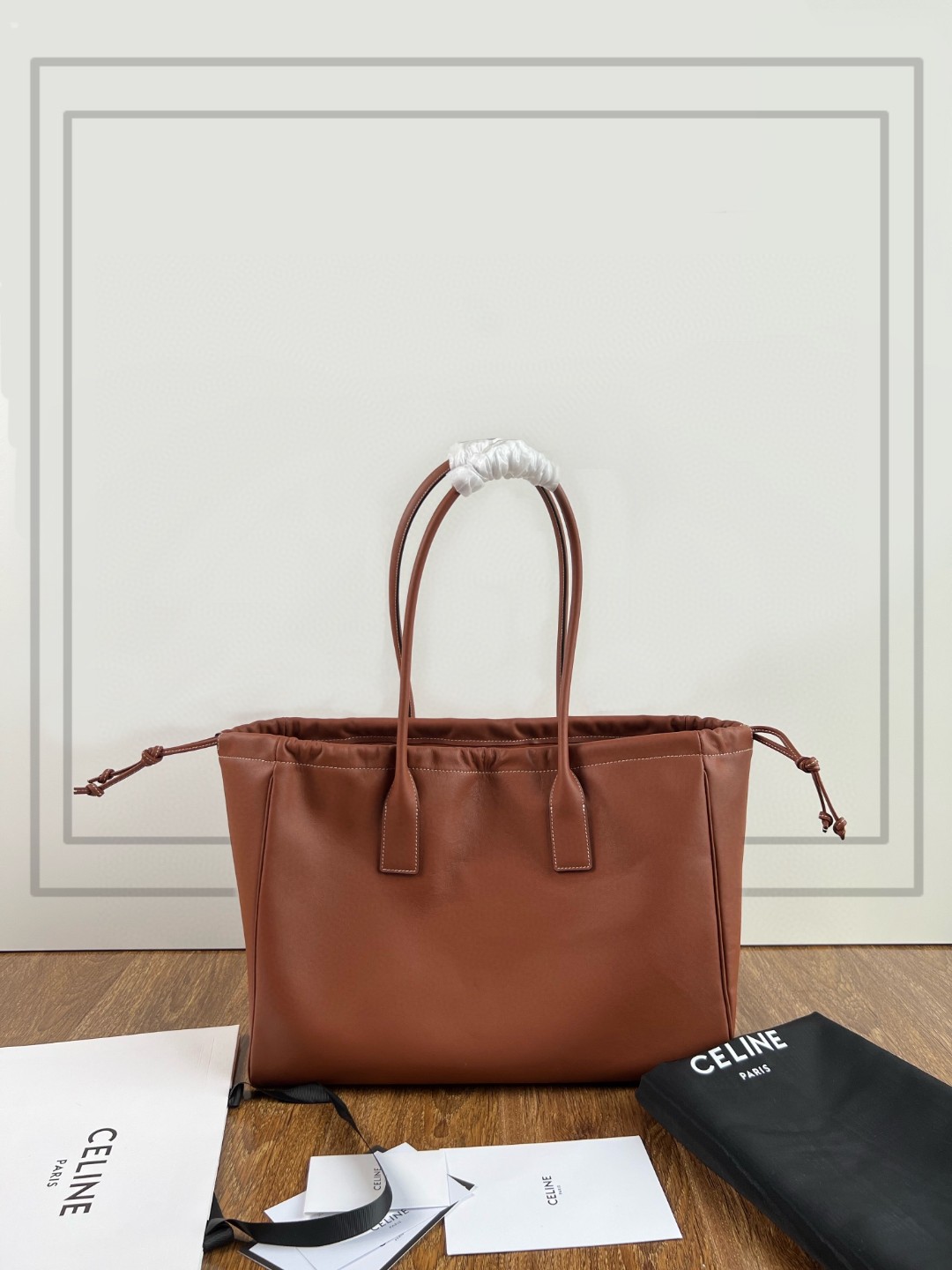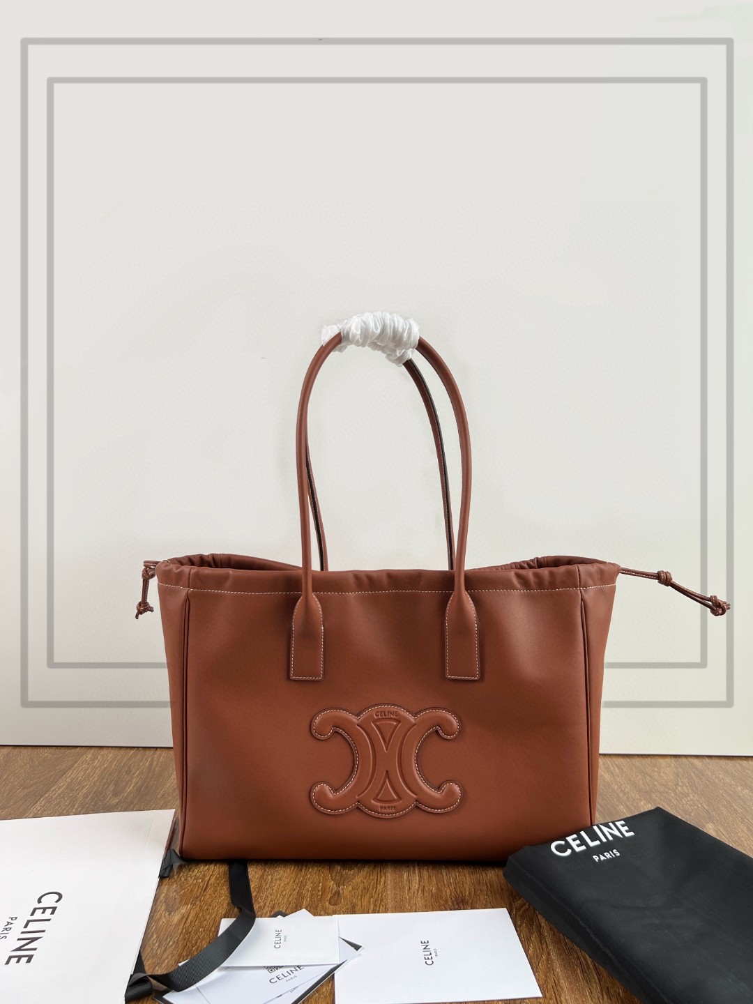 CELINE CABAS TRIOMPHE smooth calfskin drawstring bag, CUIR series all-leather drawstring shopping bag, dimensions: 44 X 28 X 18cm, calfskin, suede calfskin lining (matte leather), shoulder carry, decorative drawstring, 1 main compartment, 1 flat pocket inside, original factory calfskin, leather is fine and soft