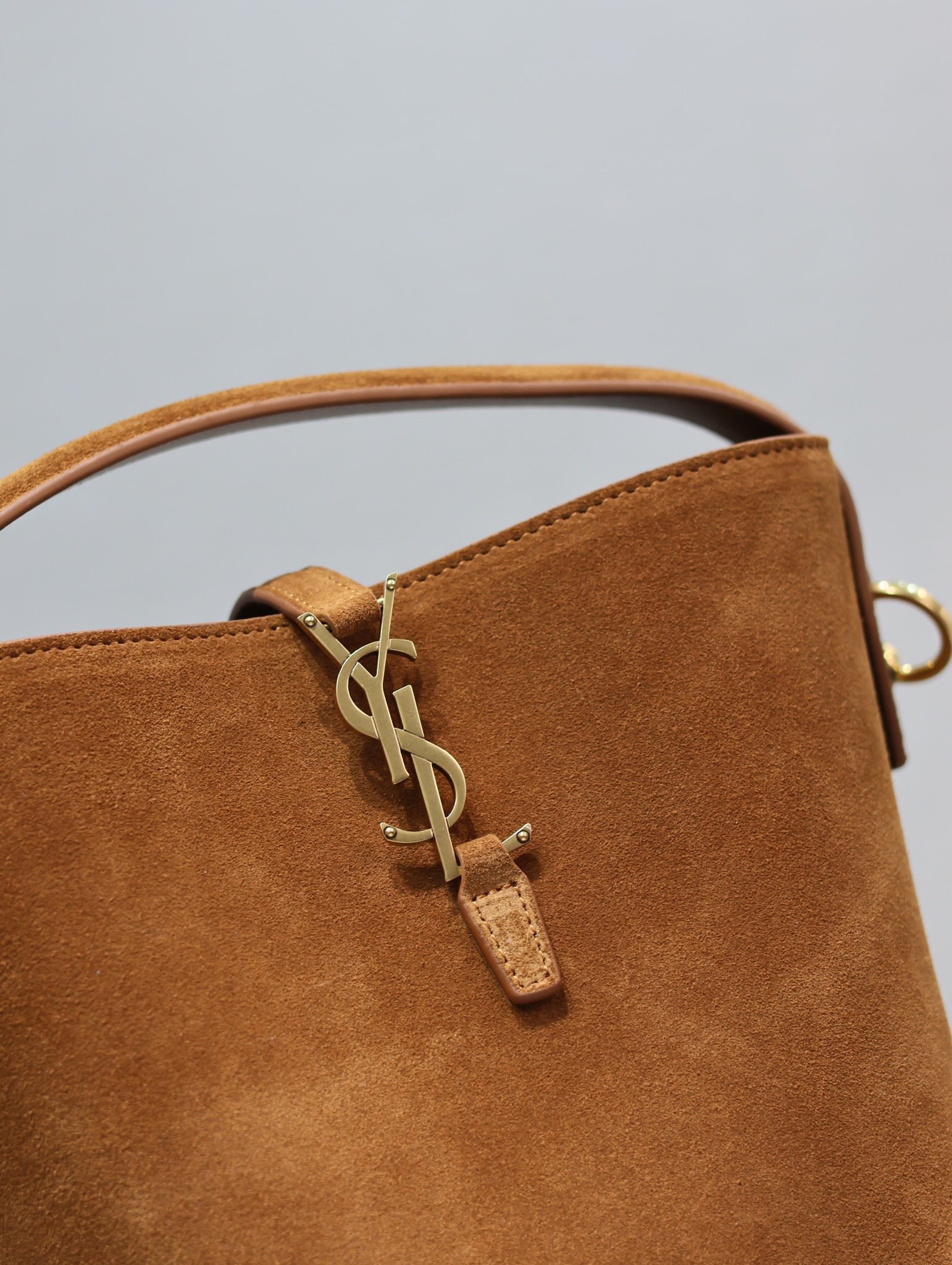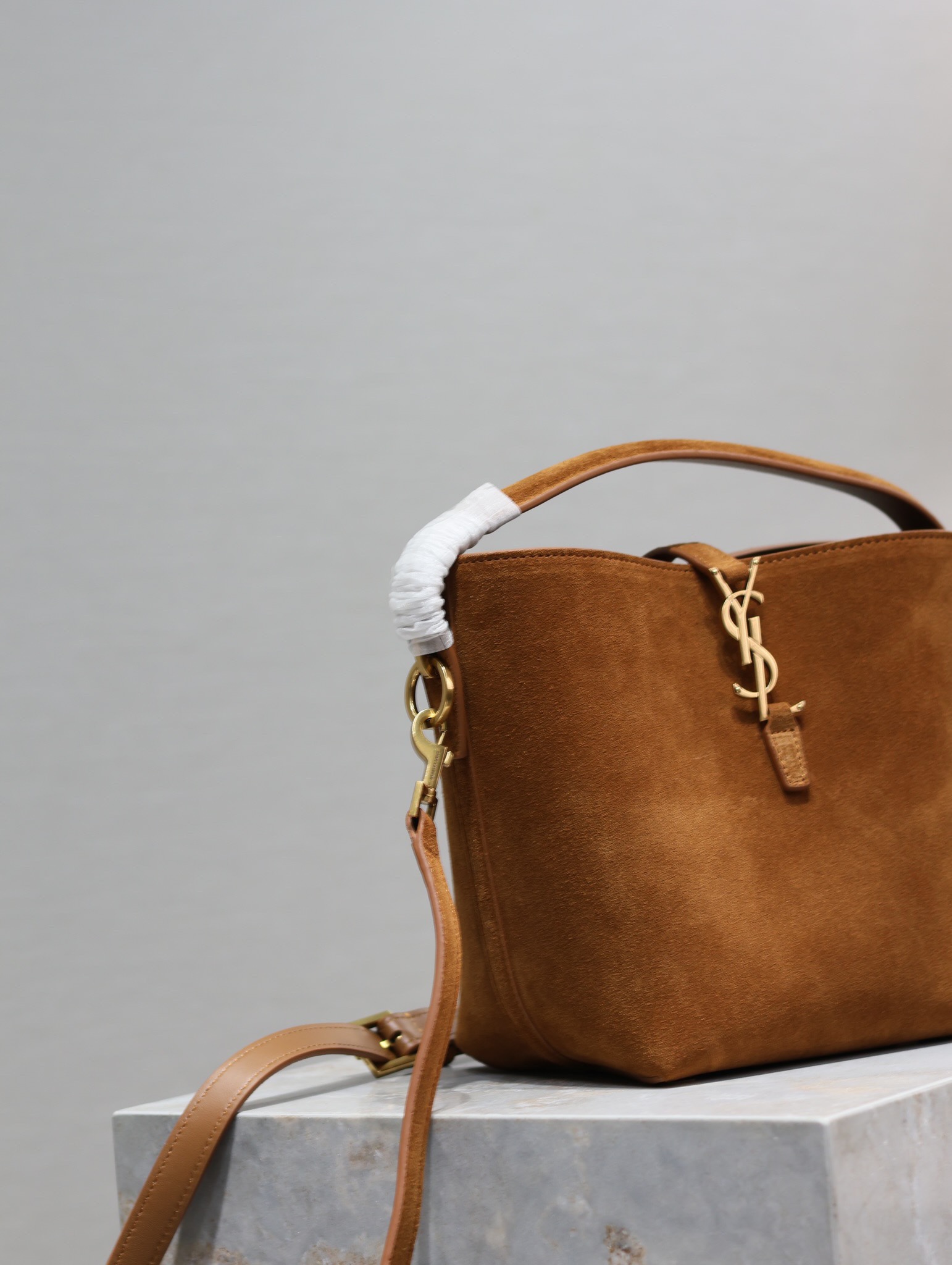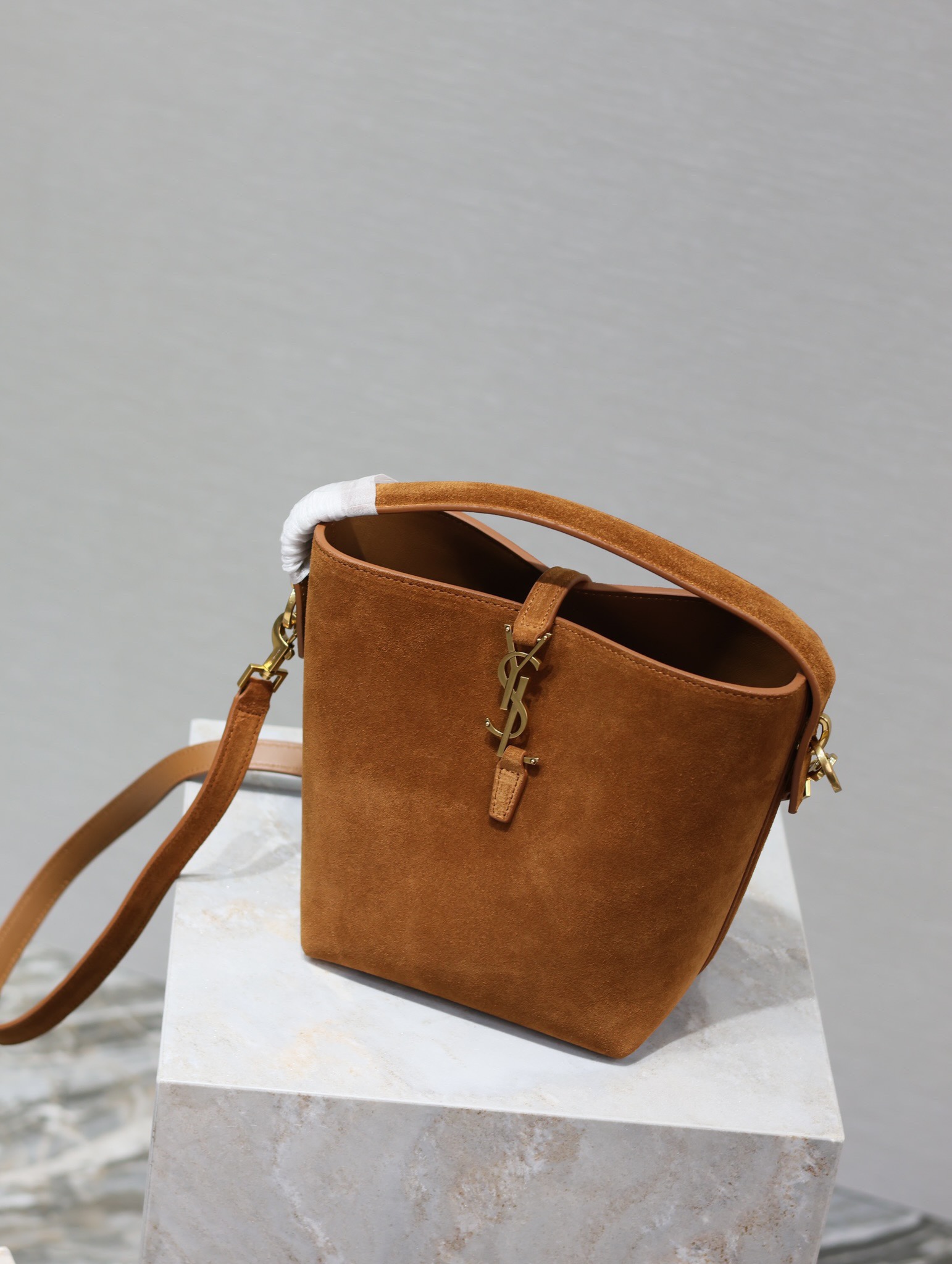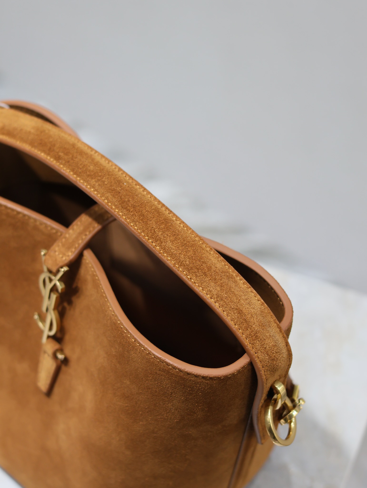 Super cute bucket bag with top handle. Brand new bag shape, crafted from Italian suede and cowhide. The bag's silhouette is clean and structured, appearing sturdy yet not overly sharp. Features metal feet at the base, paired with a classic iconic metal logo insert-style clasp. The overall impression is uniquely classic, elegant, and fashionably modern!