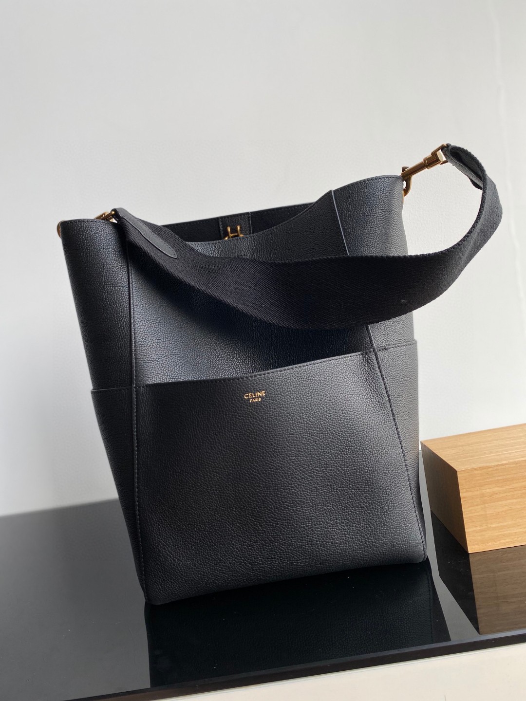 CELINE Sangle Seau Bucket Bag. Genuine factory original leather, Togo calfskin using stitching craftsmanship, inner suede lining, thick shoulder strap woven from wool, includes a small hidden compartment inside, and 4 large external pockets, practical and stylish, completely irresistible. Dimensions: Large 23×33×17.