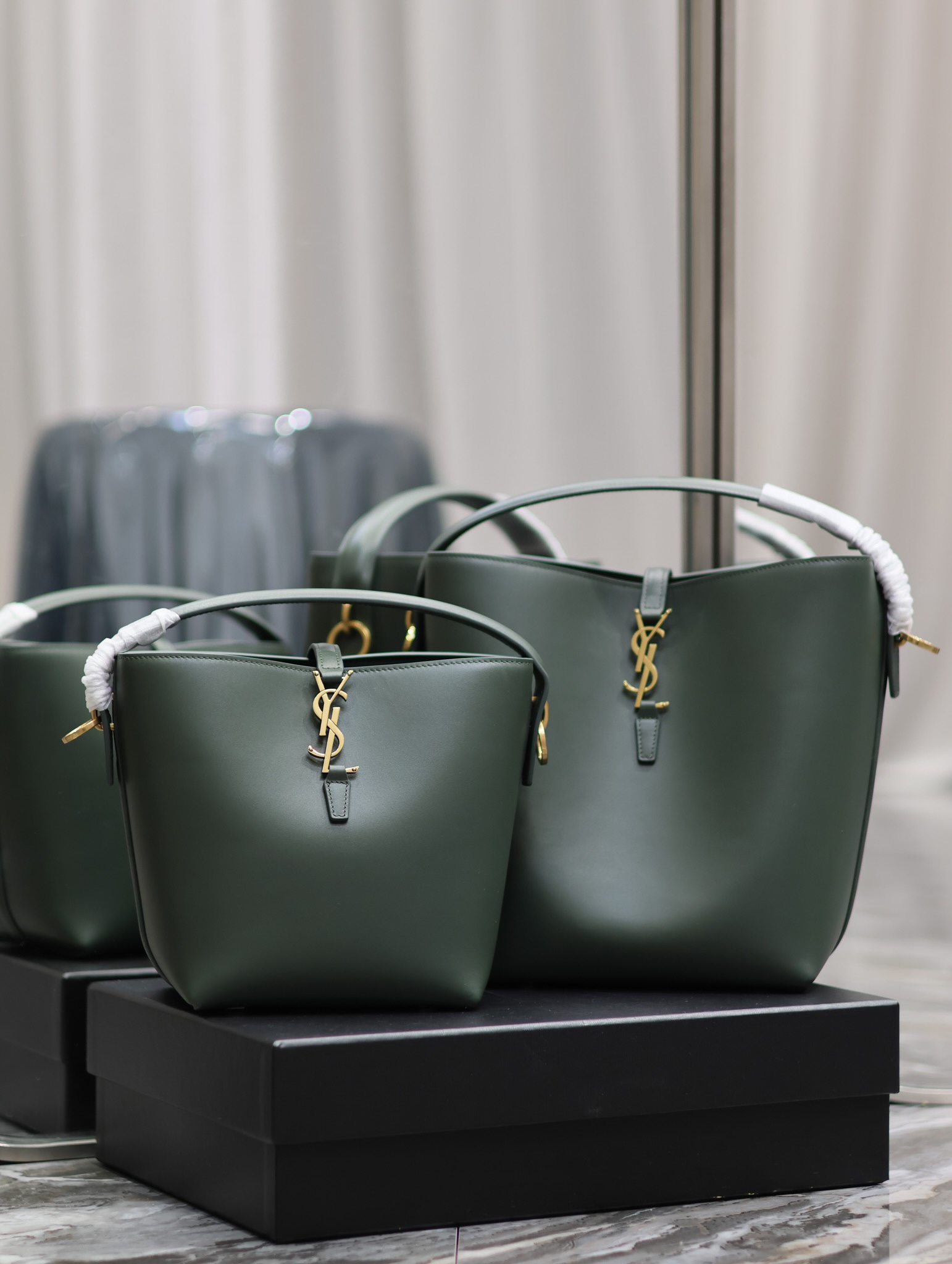 YSL Saint Laurent LE 37 Bucket Bag, Green Gold Buckle Calfskin, 20/26cm