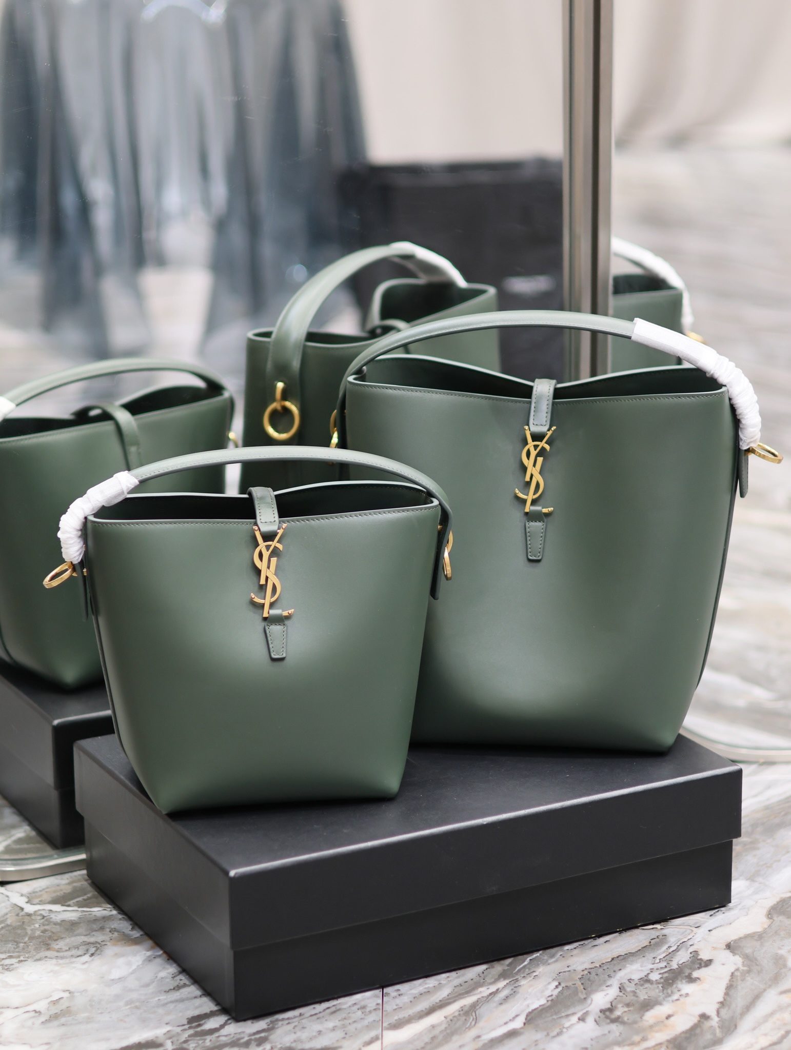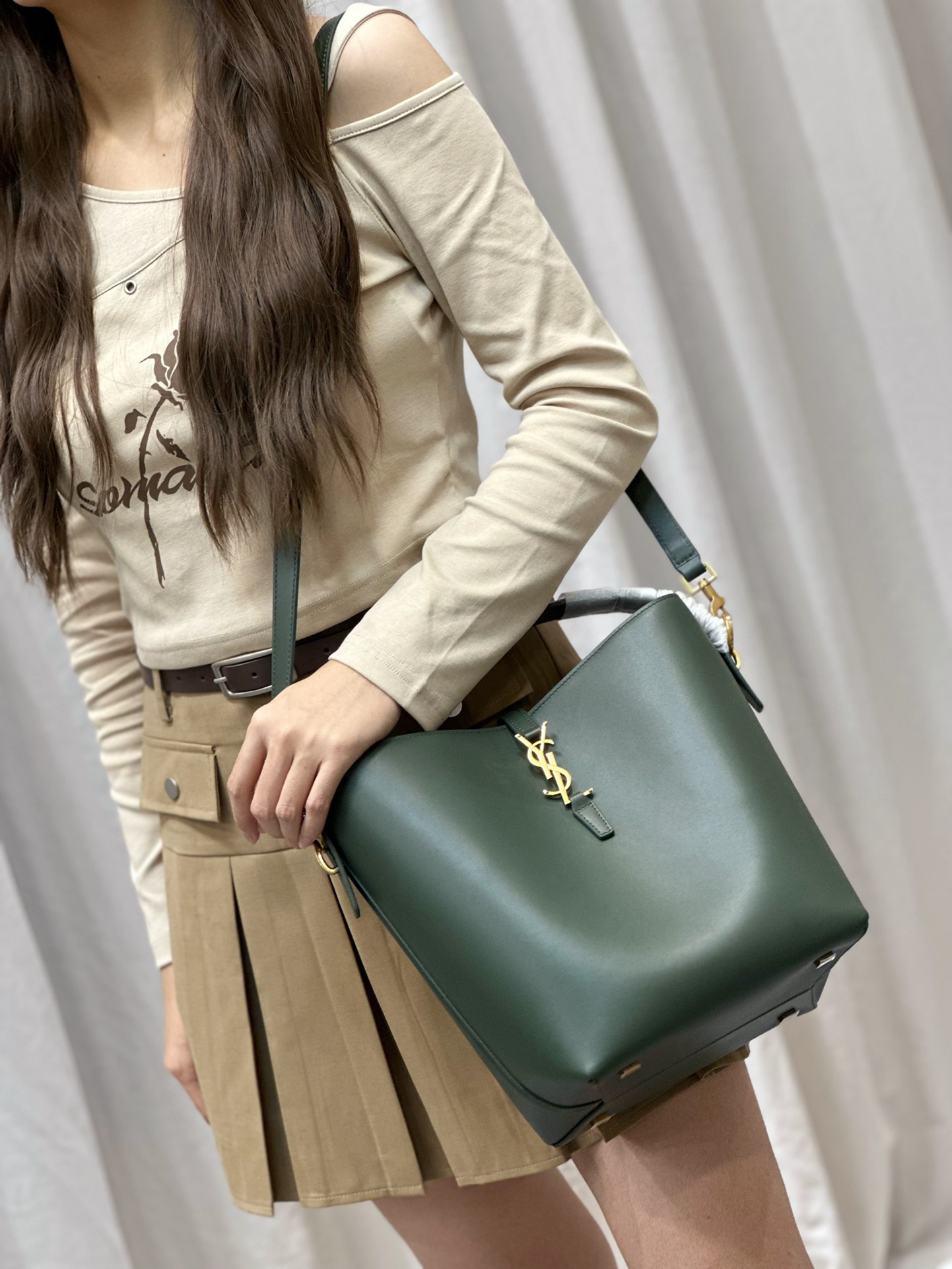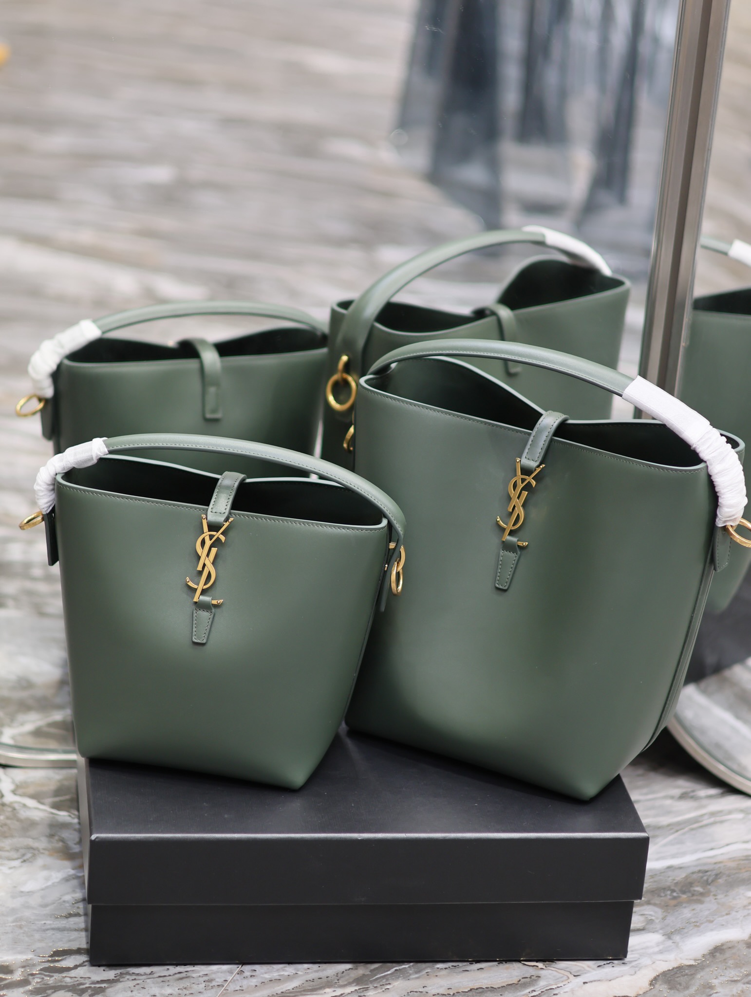 YSL Saint Laurent LE 37 Bucket Bag. Green gold buckle calfskin. 20/26cm.