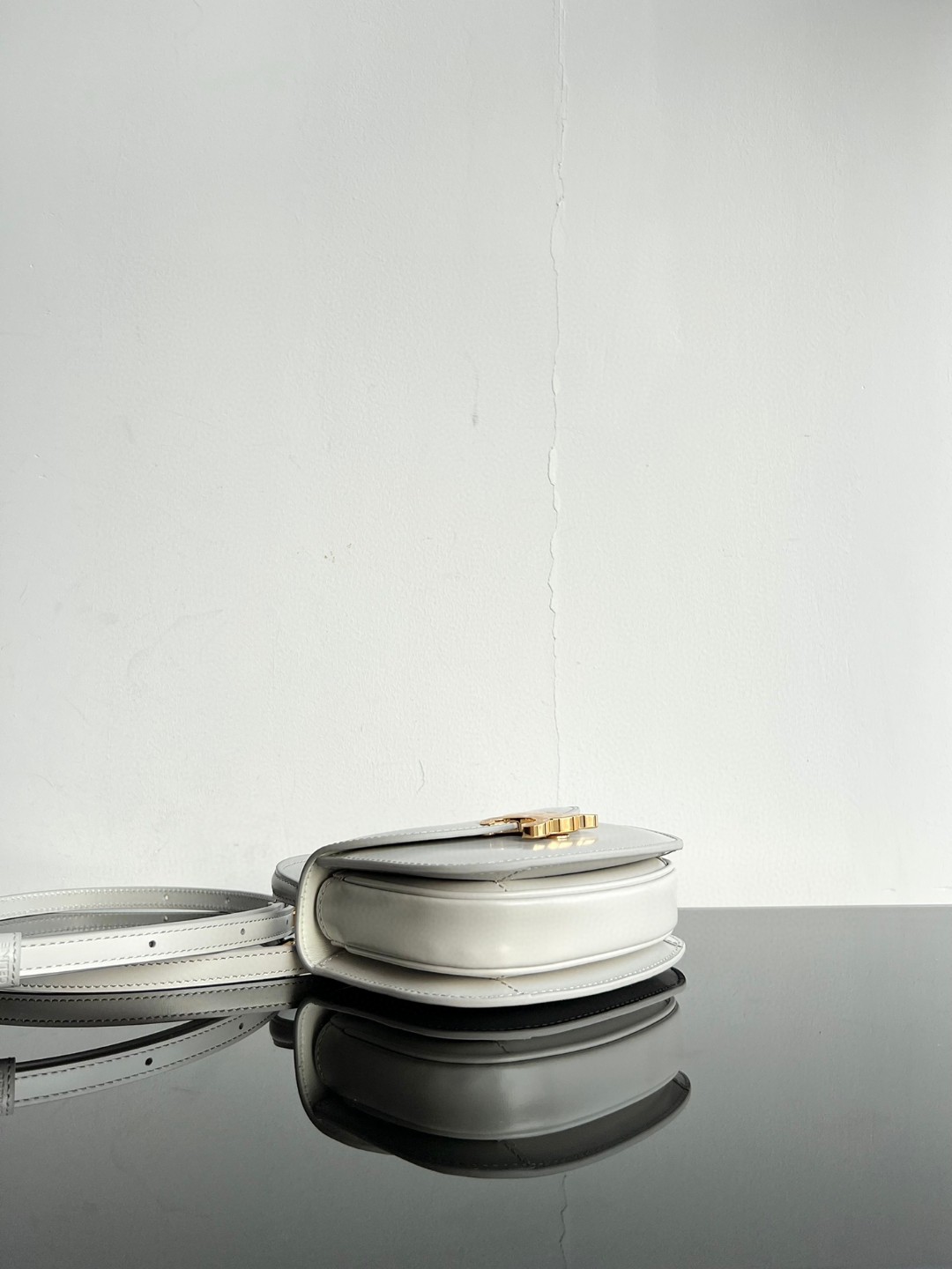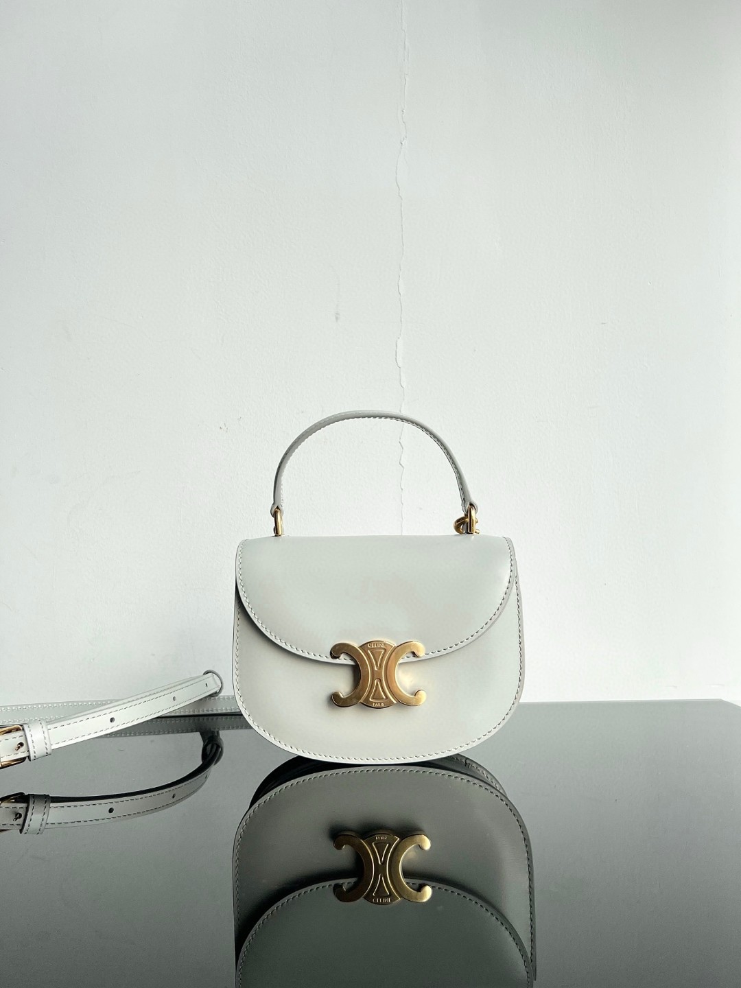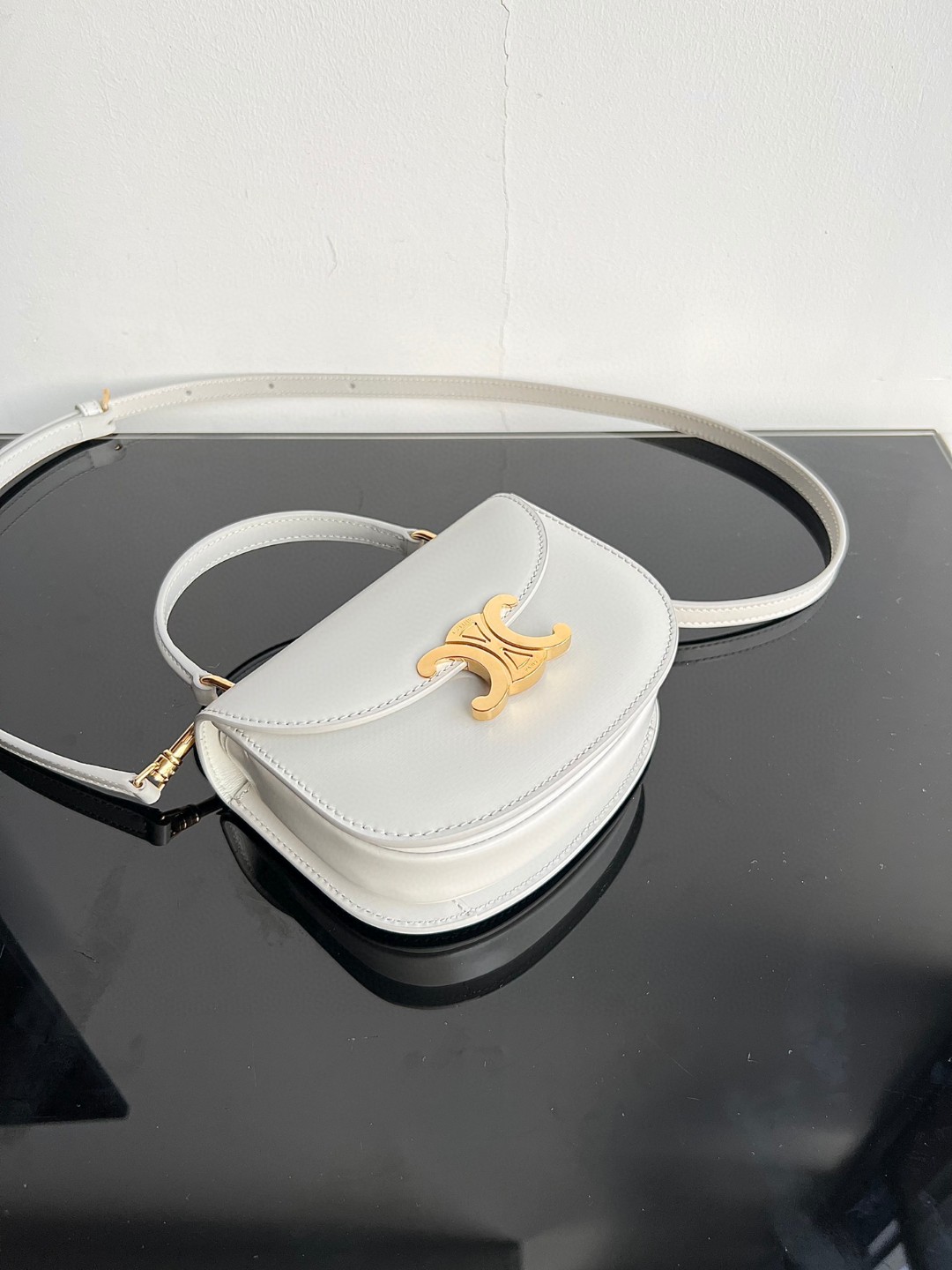 CELINE BESACE TRIOMPHE Mini Shiny Calfskin Handbag, Triomphe Handheld Saddle, Dimensions: 15.5 X 11.5 X 5 cm, This model cannot accommodate PLUS or other larger smartphone models, Can be worn cross-body, handheld, or on the shoulder, TRIOMPHE metal snap closure, 1 main compartment, internal flat pocket, Adjustable and detachable leather strap [Original leather + full steel hardware] Top market quality, Comes with full set of packaging as shown in pictures