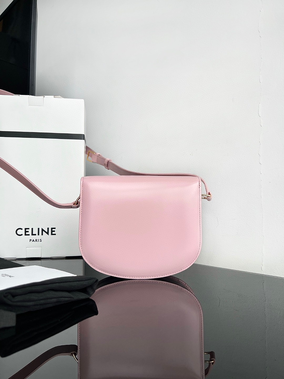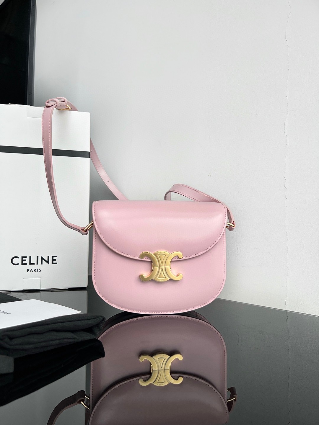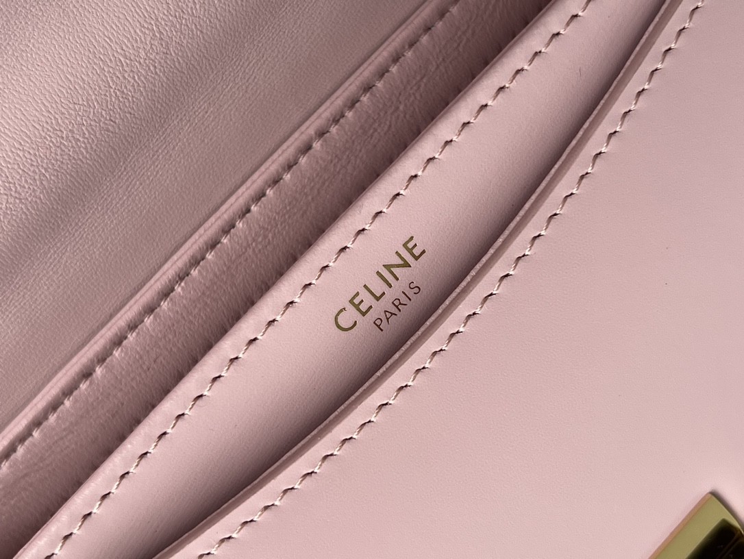 CELINE TEEN BESACE TRIOMPHE glossy calfskin handbag, Triumph saddle bag, original leather + full steel hardware, dimensions: 18.5 X 16 X 6cm, exterior original calfskin, original lambskin lining, can be worn crossbody or on the shoulder, metal TRIOMPHE logo closure, 3 interior compartments, 1 interior zippered pocket, 1 interior flat pocket, adjustable long shoulder strap