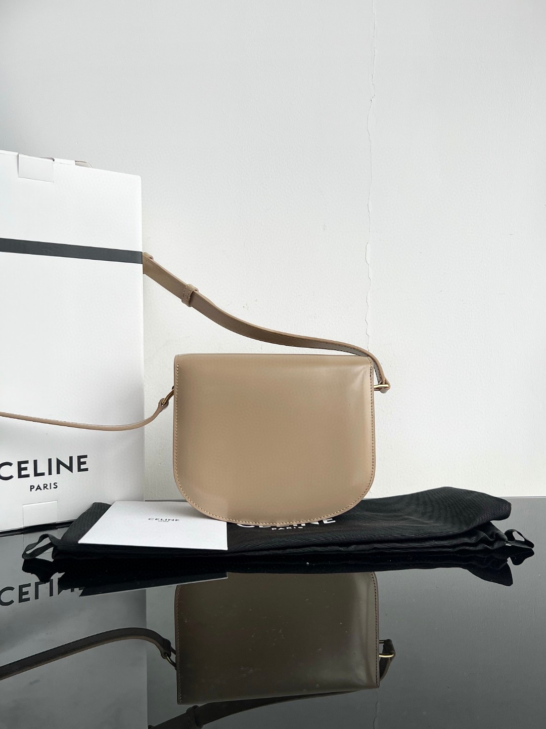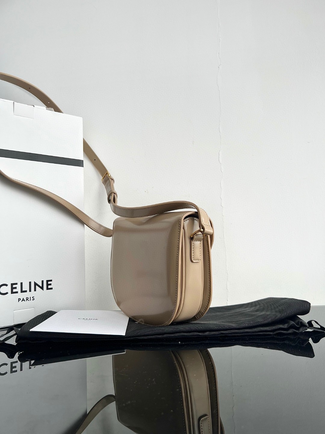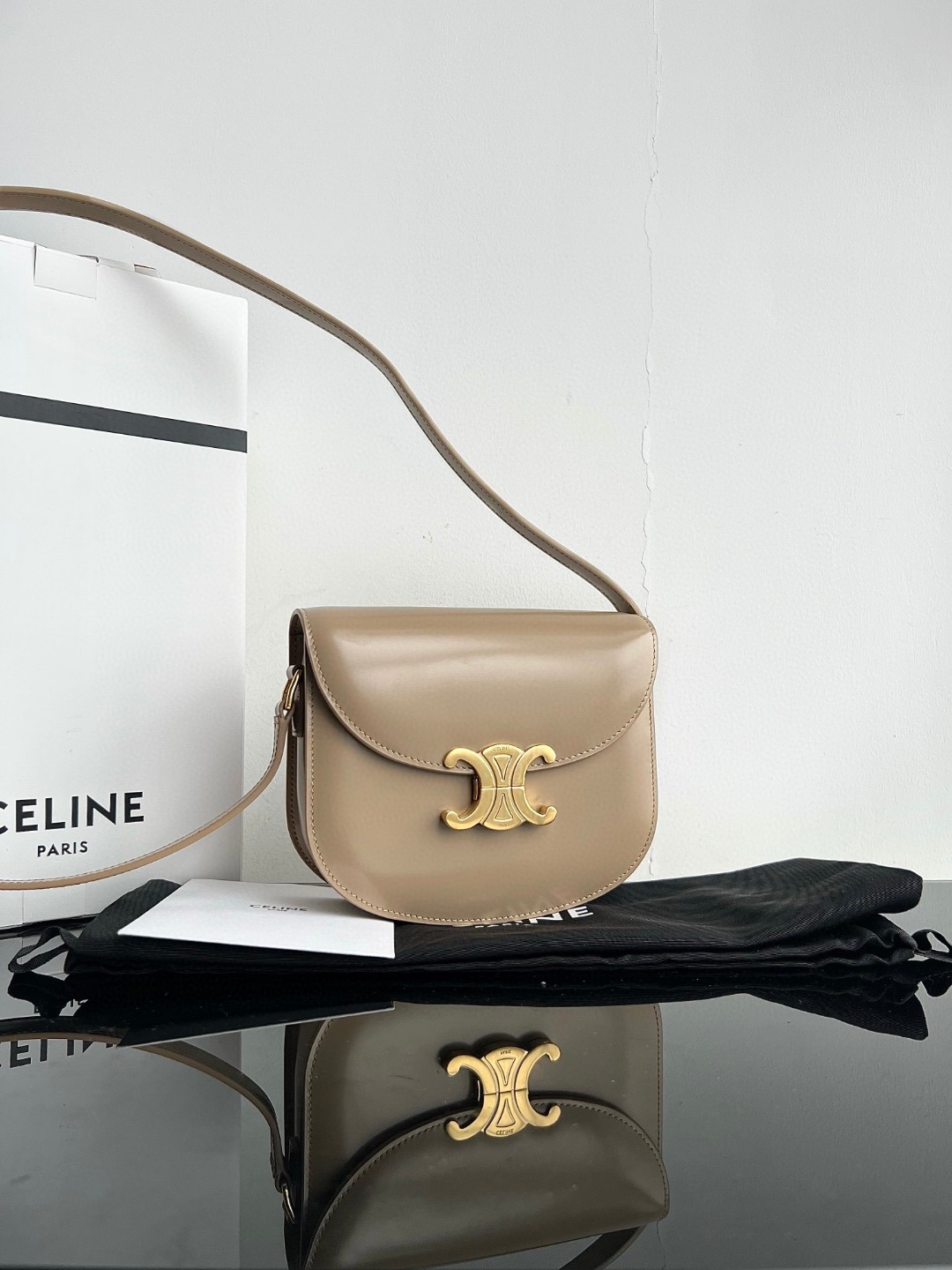 CELINE TEEN BESACE TRIOMPHE Shiny Calfskin Handbag, Arc de Triomphe Saddle Bag, Original Leather + Full Steel Hardware, Dimensions: 18.5 X 16 X 6cm, Exterior Made of Original Calfskin, Original Sheepskin Lining, Can Be Worn Crossbody or on the Shoulder, Metal TRIOMPHE Logo Closure, 3 Interior Compartments, 1 Interior Zippered Pocket, 1 Interior Flat Pocket, Adjustable Long Strap