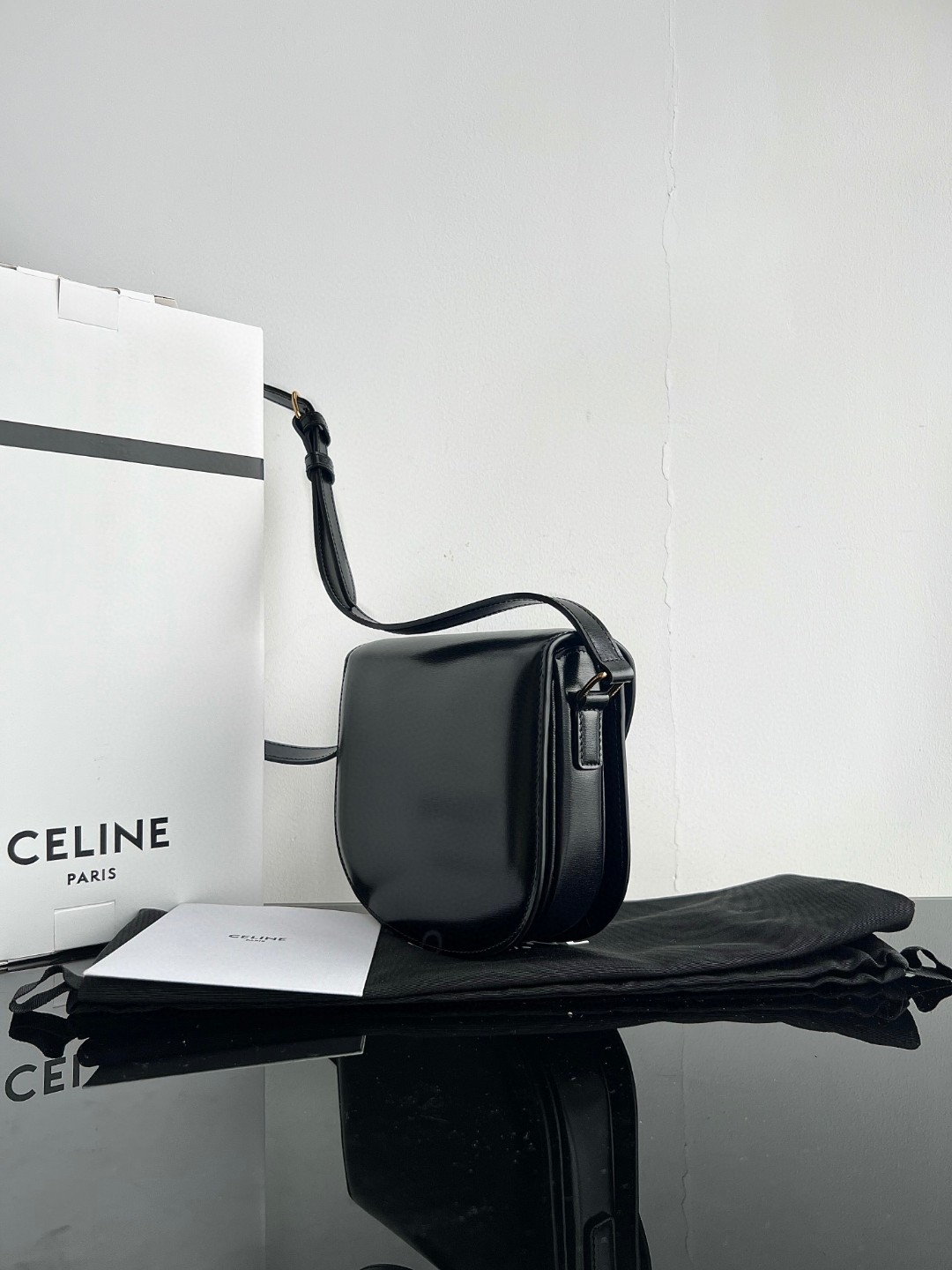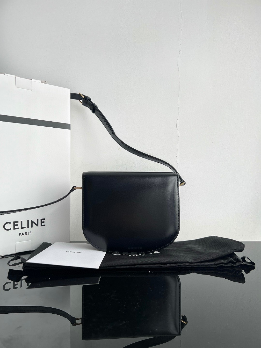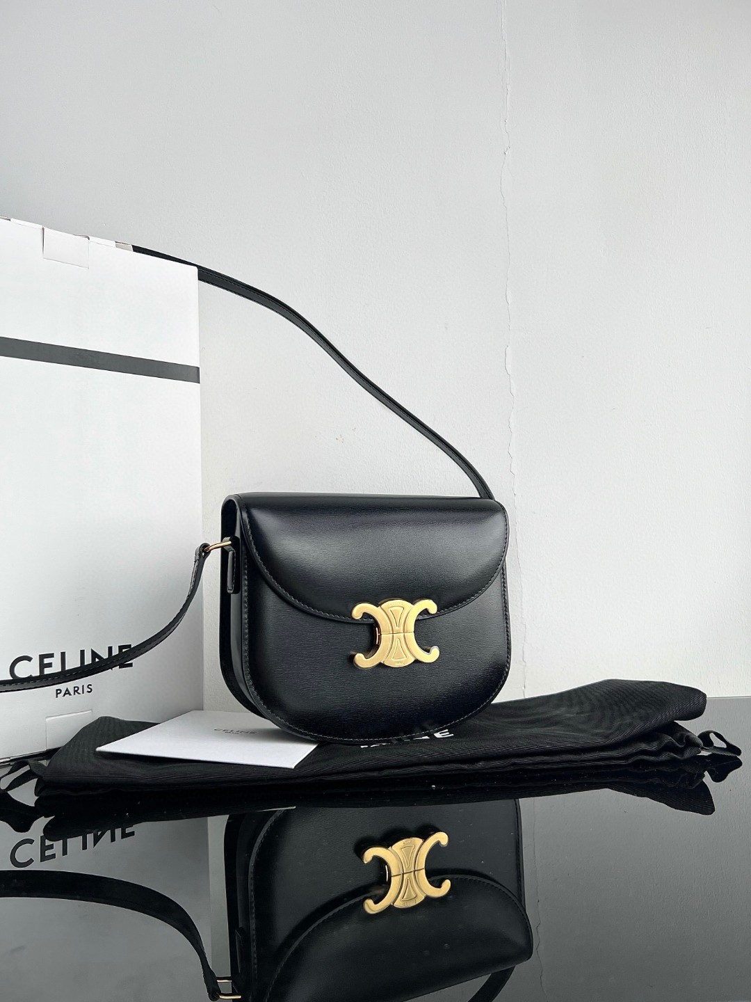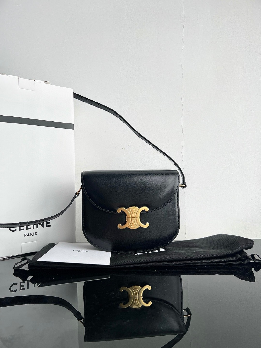 Original Title: CELINE TEEN BESACE TRIOMPHE Shiny Calfskin Handbag, Triomphe Saddle Bag, Original Leather + Full Steel Hardware, Dimensions: 18.5 X 16 X 6cm, Exterior Made of Original Calfskin, Original Lambskin Lining, Can Be Worn Crossbody or on the Shoulder, Metal TRIOMPHE Logo Closure, 3 Interior Compartments, 1 Interior Zippered Pocket, 1 Interior Flat Pocket, Adjustable Long Strap