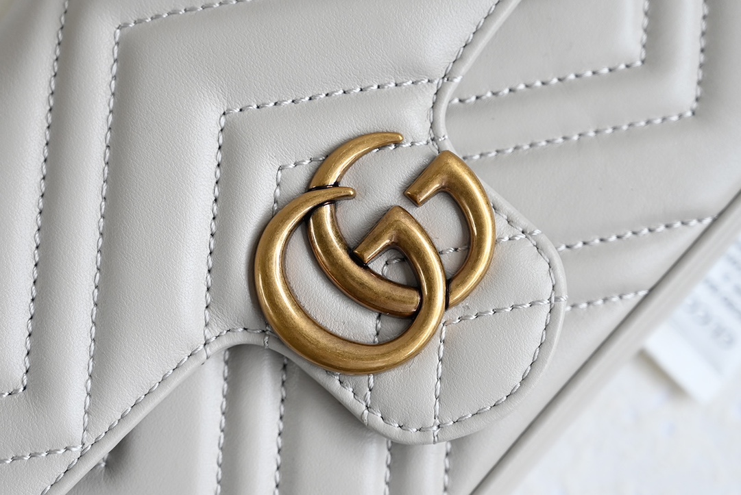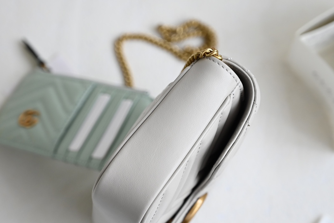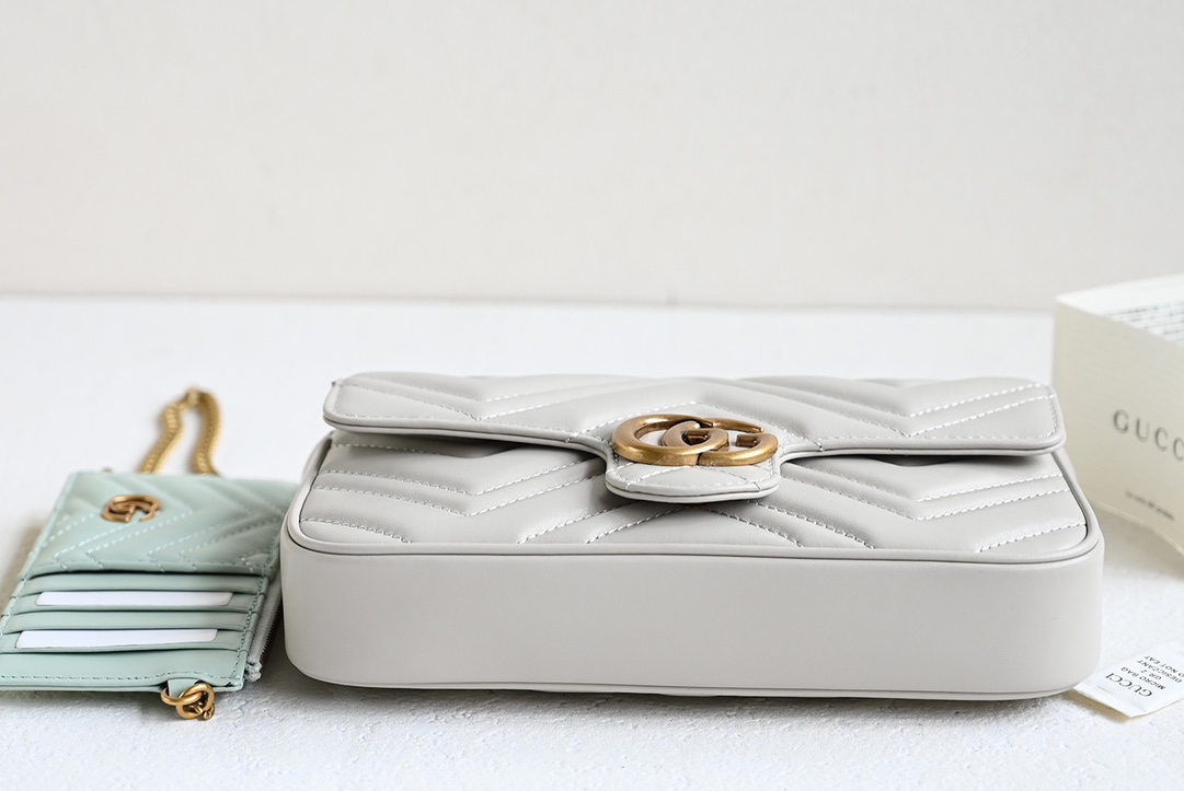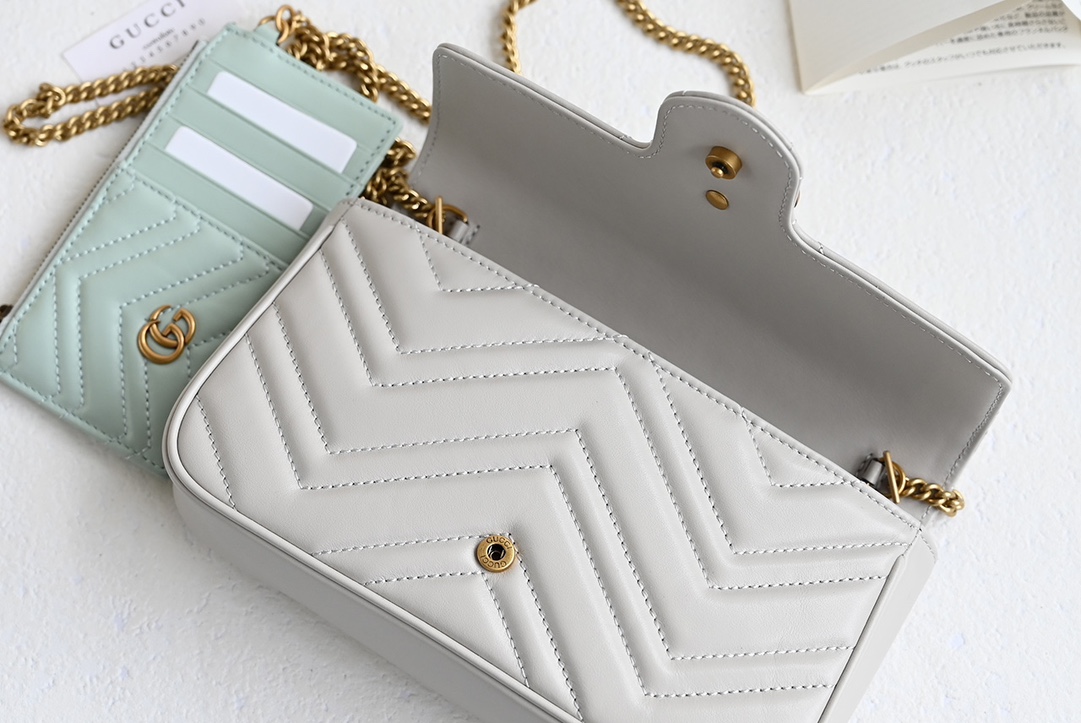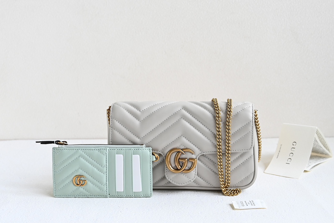 GG Marmont series mini chain card wallet. The double G accessory design injects traditional essence into the brand's modern style, bringing timeless pieces to the wardrobe. This mini chain card wallet comes with a chain strap, crafted from the iconic gray matelassé V-shaped leather, and features a removable light gray contrasting leather card holder inside. Black matelassé V-shaped leather, includes an additional light green leather card holder, antique gold-toned hardware, suede-textured moiré fabric and microfiber blend lining, double G. Interior: 2 card compartments, removable zippered card holder. Exterior: 1 back pocket, snap closure. Weight: approximately 0.447 kg.