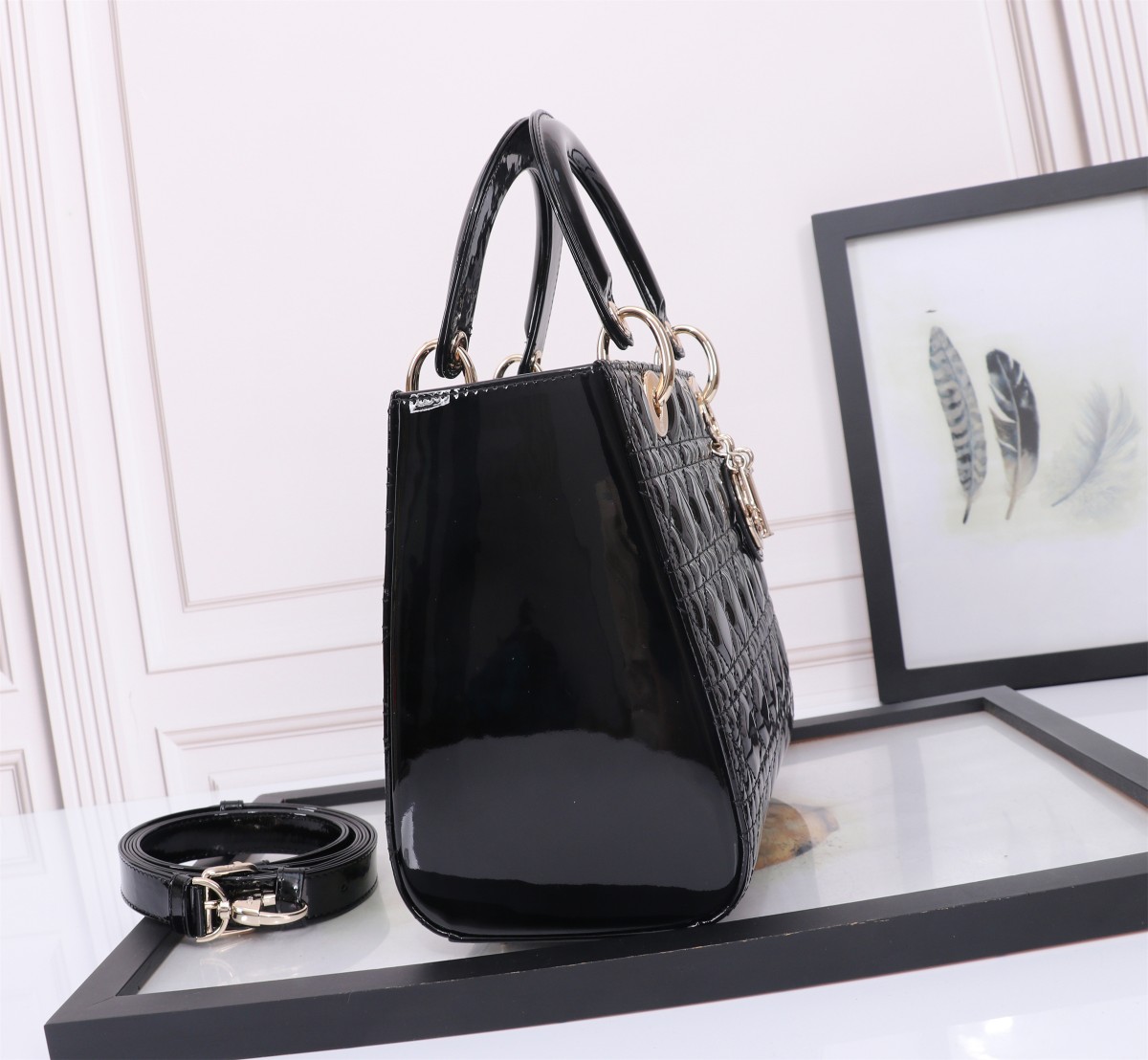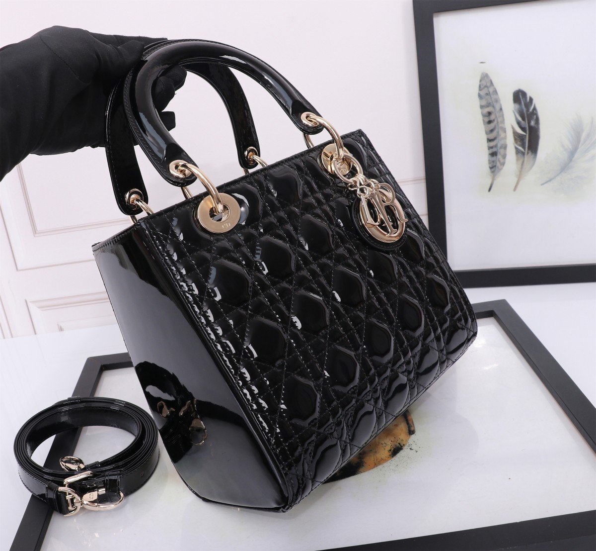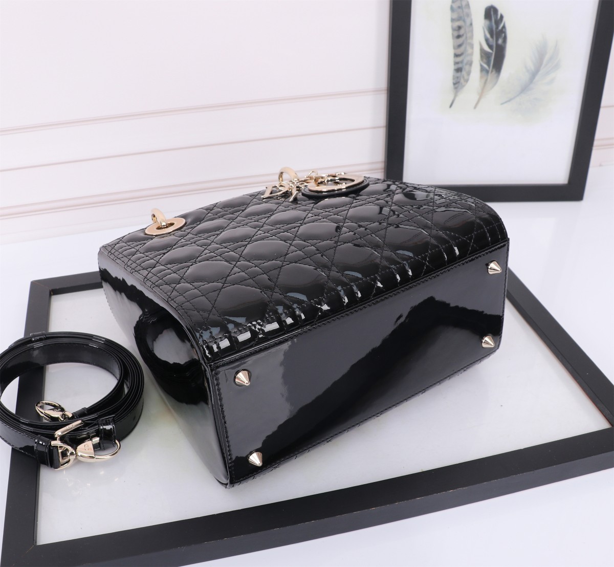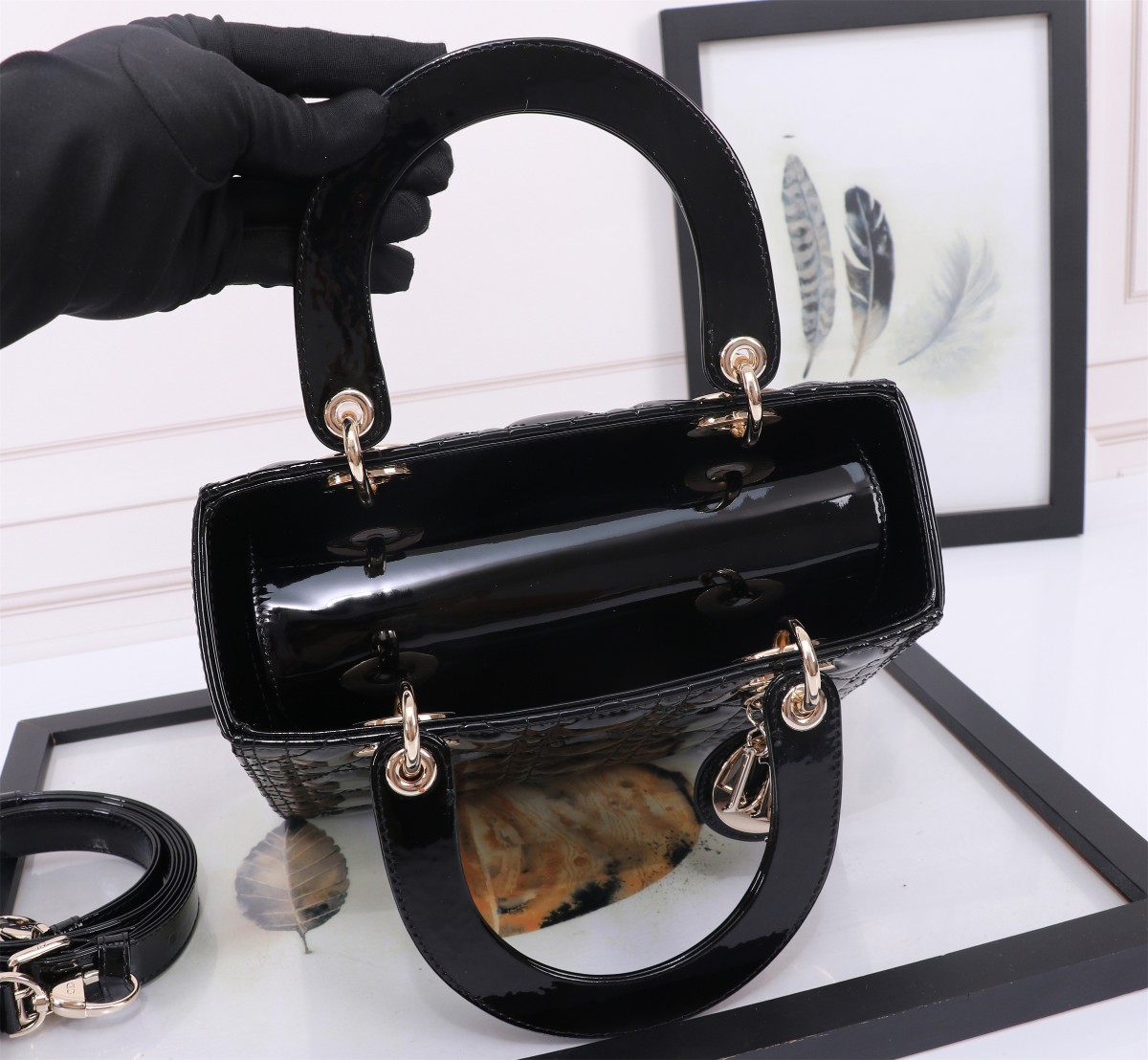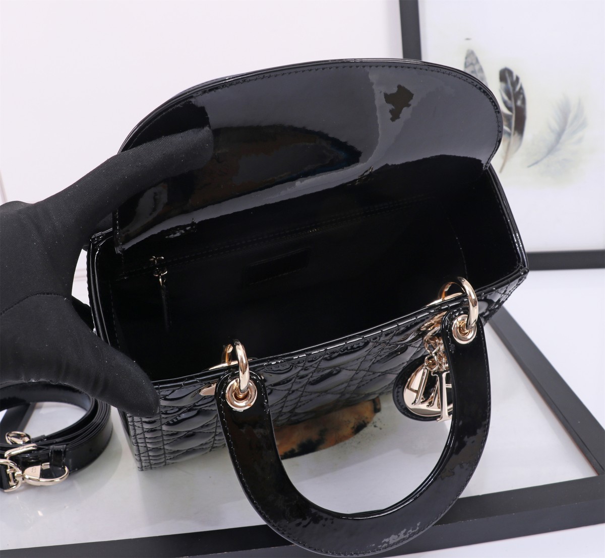 Mini bag in cannage-stitched patent calfskin leather, adorned with cannage stitching, paired with a chain strap and metal accessories. Features a slender, adjustable, detachable leather shoulder strap, can be carried by hand, on the shoulder, or across the body.