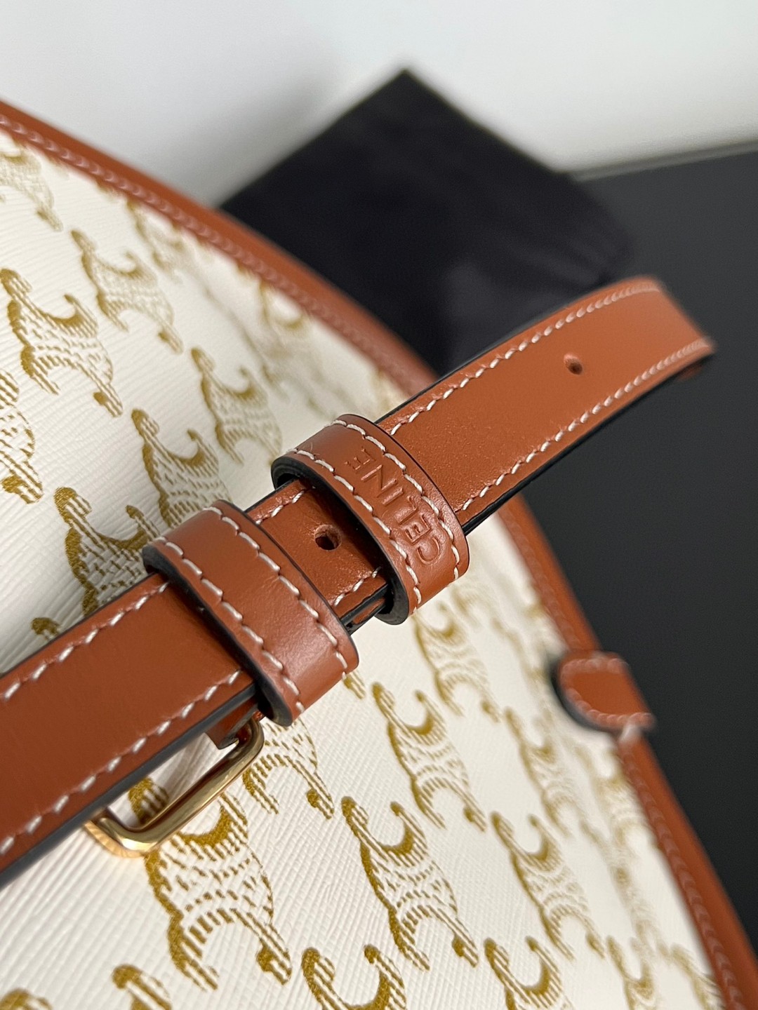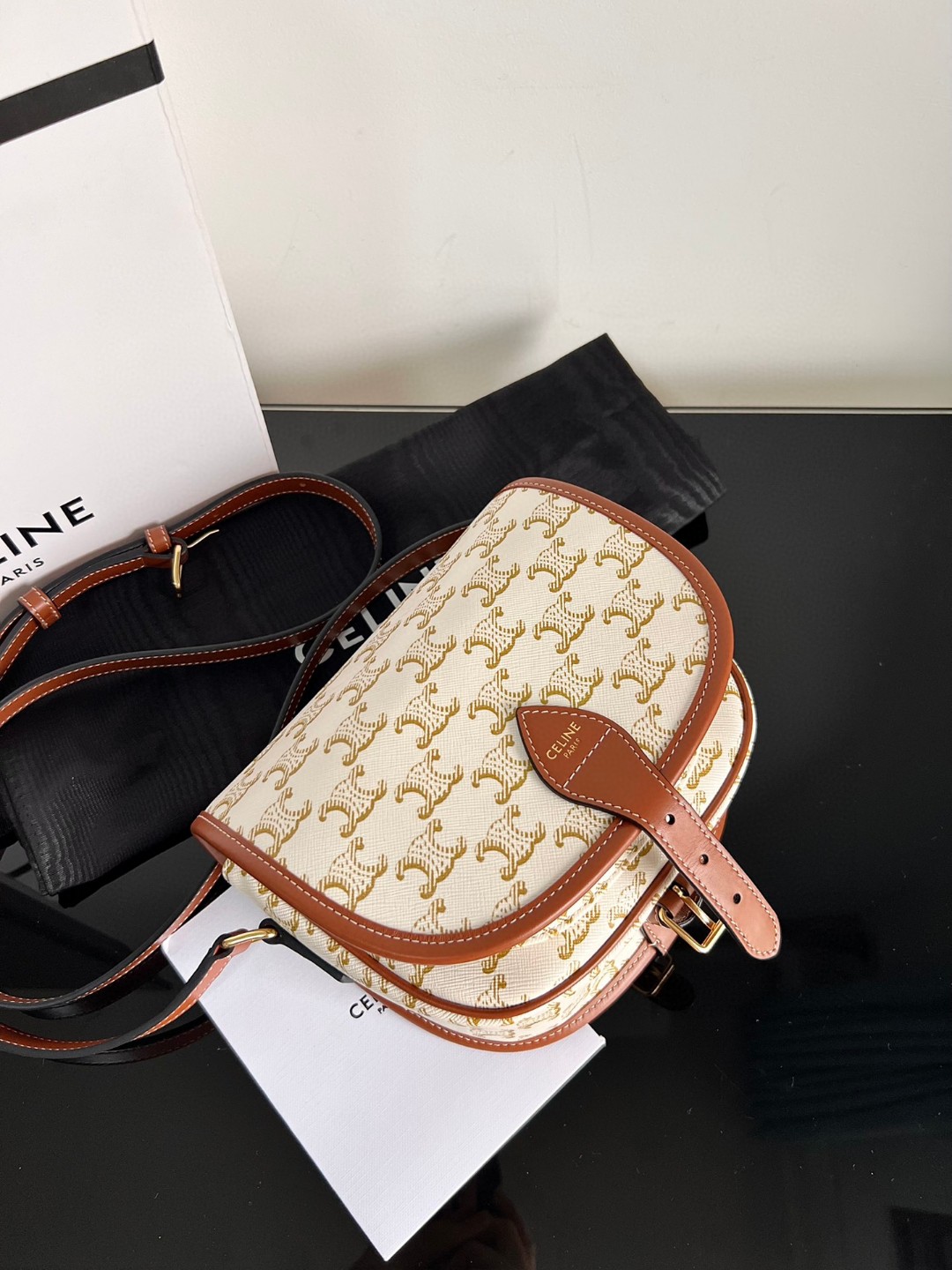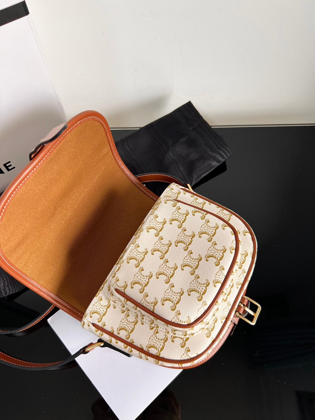 CELINE FOLCO Saddle Monogram Print Handbag, Dimensions: 18.5 X 17 X 8 cm, Fabric lining, Can be worn crossbody, Buckle closure, Inner flat pocket, Outer pocket, Adjustable shoulder strap