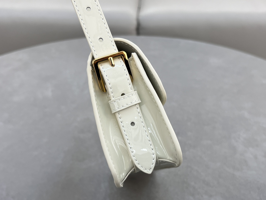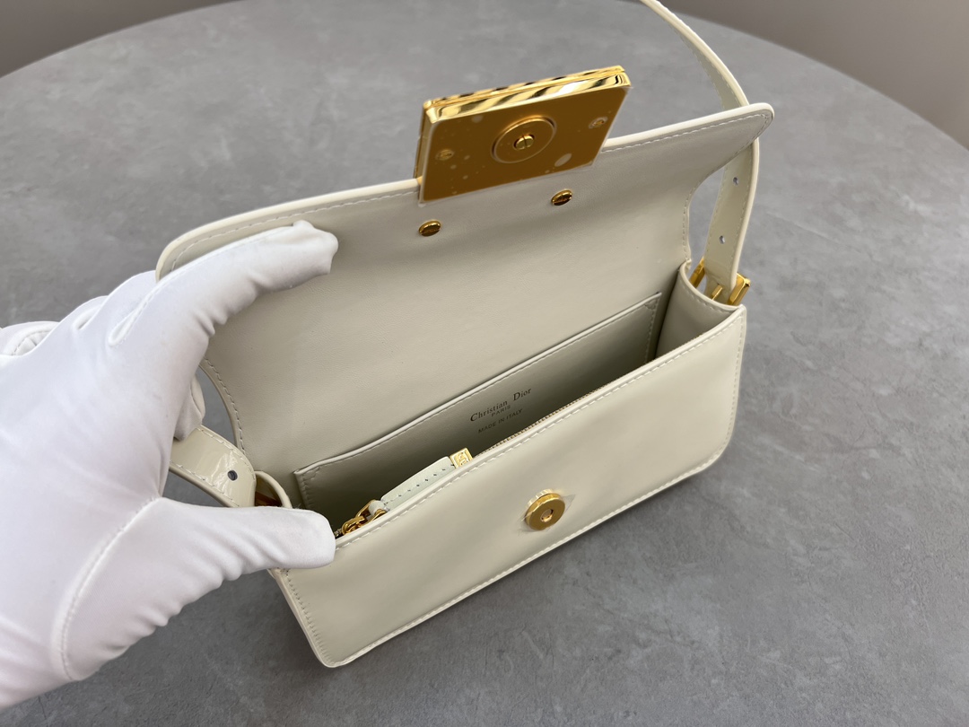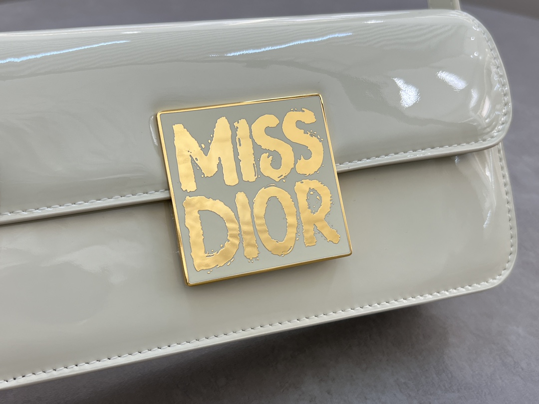 This Miss Dior flap bag made its debut at the Dior Fall-Winter 2024-2025 ready-to-wear collection show, reinterpreting the modern elegance of Dior's classic styles. Meticulously crafted from white patent calfskin, it is adorned with the collection's signature Miss Dior Allover pattern, inspired by Marc Bohan's Dior design archives, offering a contemporary reinterpretation of 1960s fashion. It features contrasting vintage gold-finish metal plaques embellished with the Miss Dior logo, highlighting an enduring aesthetic. The main compartment under the flap includes a zippered pocket for convenient storage of daily essentials. It comes with an adjustable strap for shoulder wear, creating a stylish look with haute couture flair.
