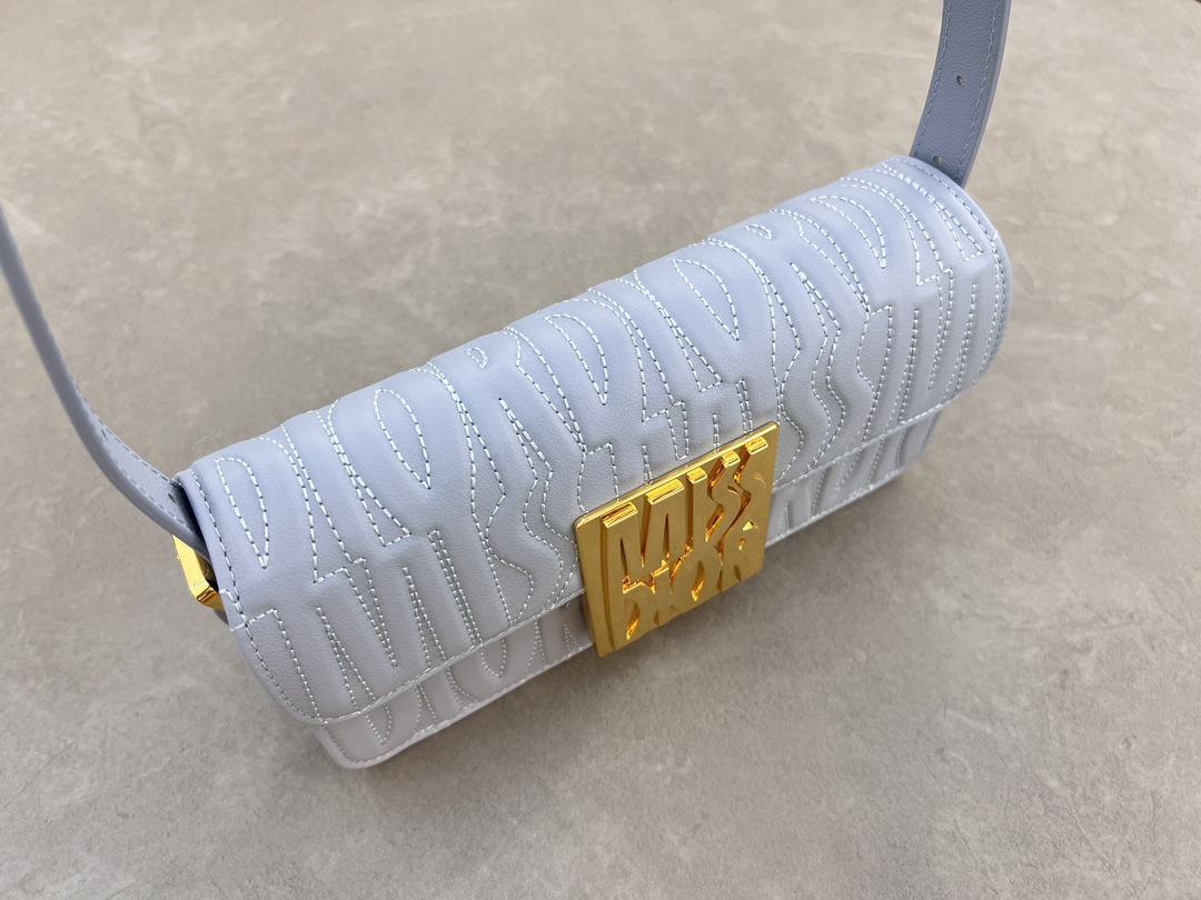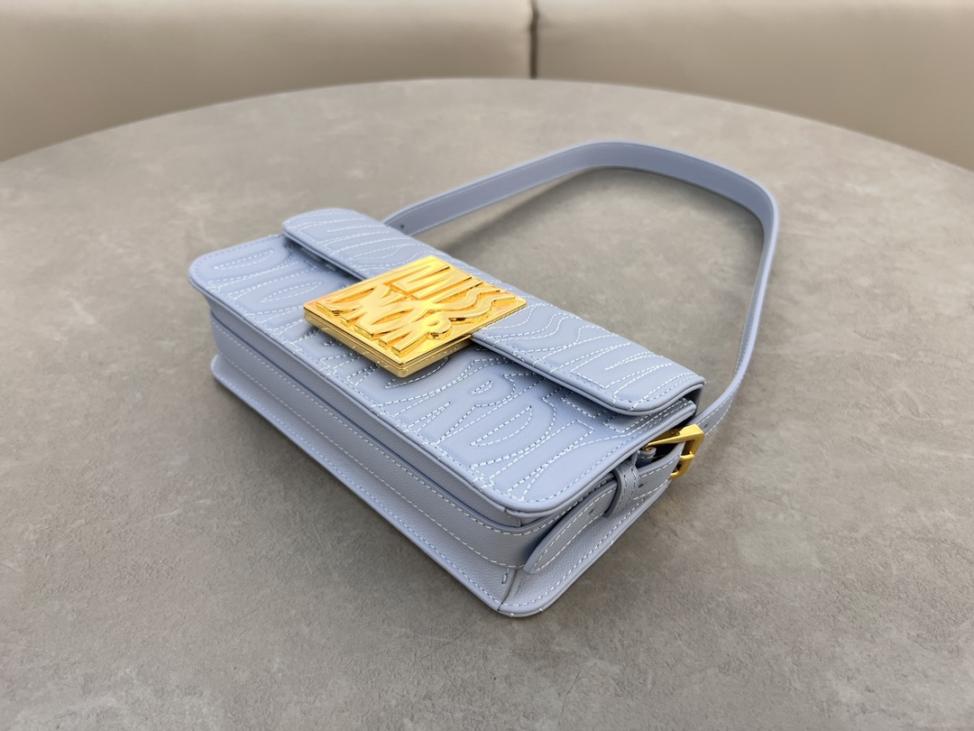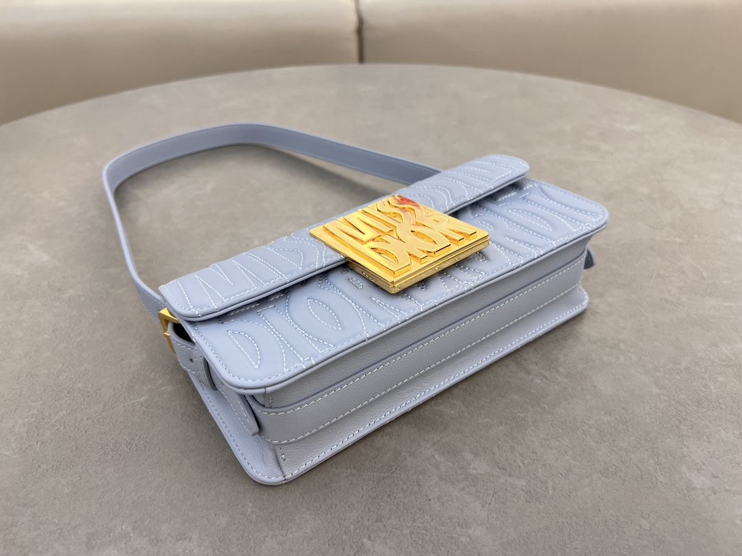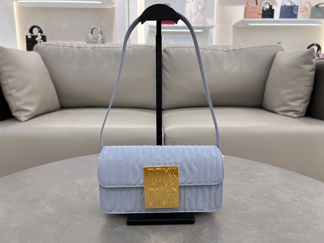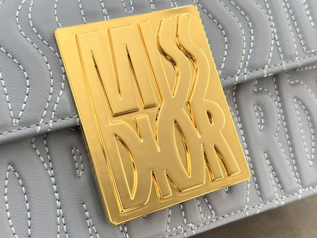 This Miss Dior flap bag made its debut at the Dior Fall-Winter 2024 ready-to-wear collection runway show, reinterpreting the modern elegance of Dior's classic styles. Meticulously crafted from blue quilted calfskin, it is adorned with the collection's signature Miss Dior Allover pattern, inspired by Marc Bohan's Dior design archives, offering a contemporary take on 1960s fashion. It features contrasting vintage gold-finished metal plaques with the Miss Dior logo, highlighting a timeless aesthetic. The main compartment under the flap includes a zippered pocket for easy storage of daily essentials. It comes with an adjustable strap for shoulder wear, creating a look imbued with haute couture style.