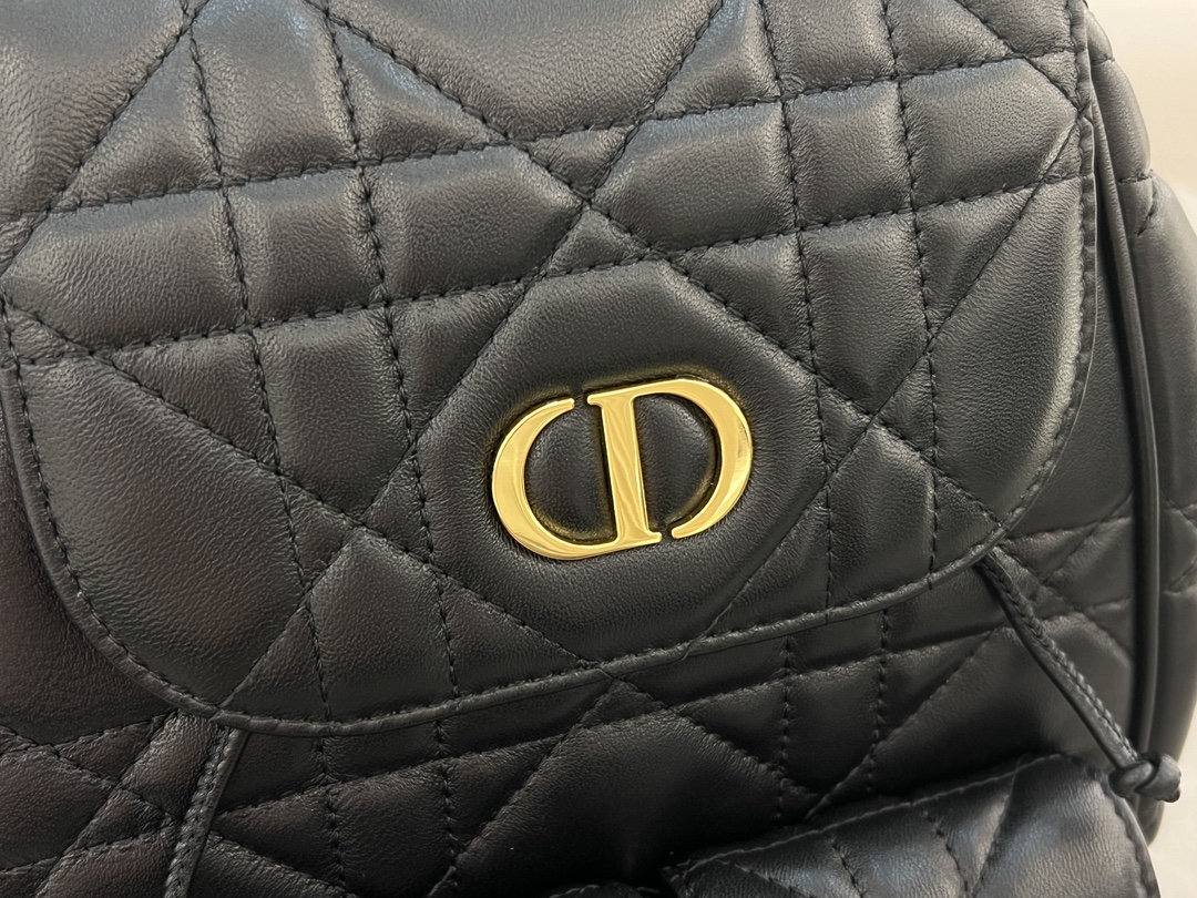 This Dior Caro backpack is a new product from the 2025 early spring ready-to-wear collection, showcasing fashionable and elegant style. Meticulously crafted from black lambskin and other materials, it features an oversize Cannage stitch pattern to enhance its sophistication. The flap is adorned with a vintage gold-finish metal CD logo. Inside, there is a spacious drawstring main compartment, and two small flap pockets can store various small daily items. The medium style comes with gold-finish handles and an adjustable shoulder strap for added comfort.