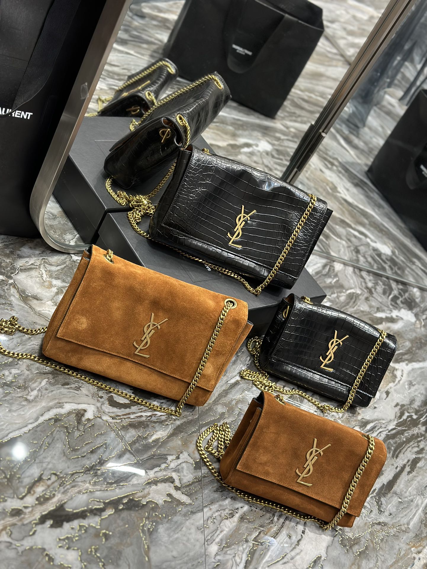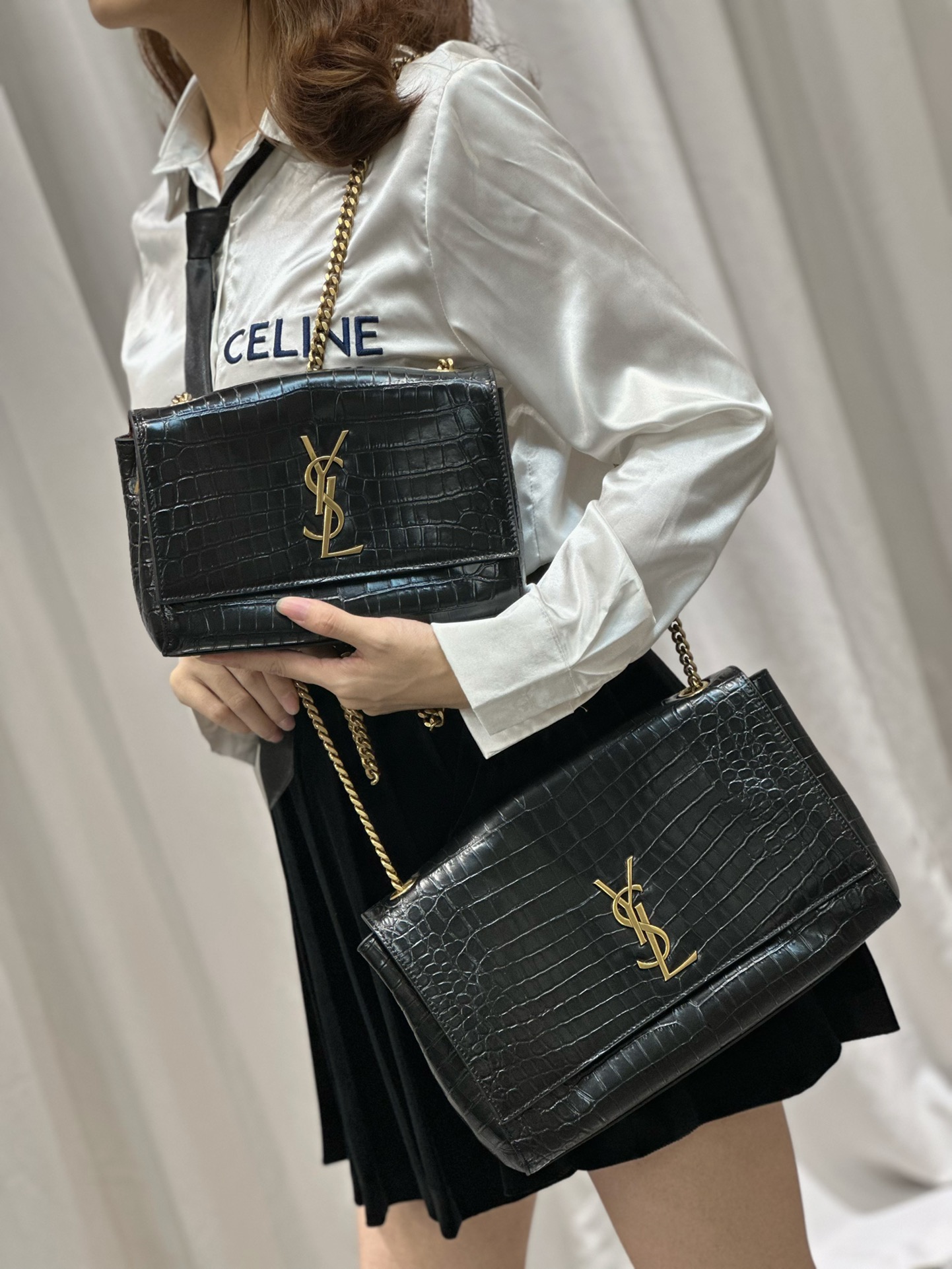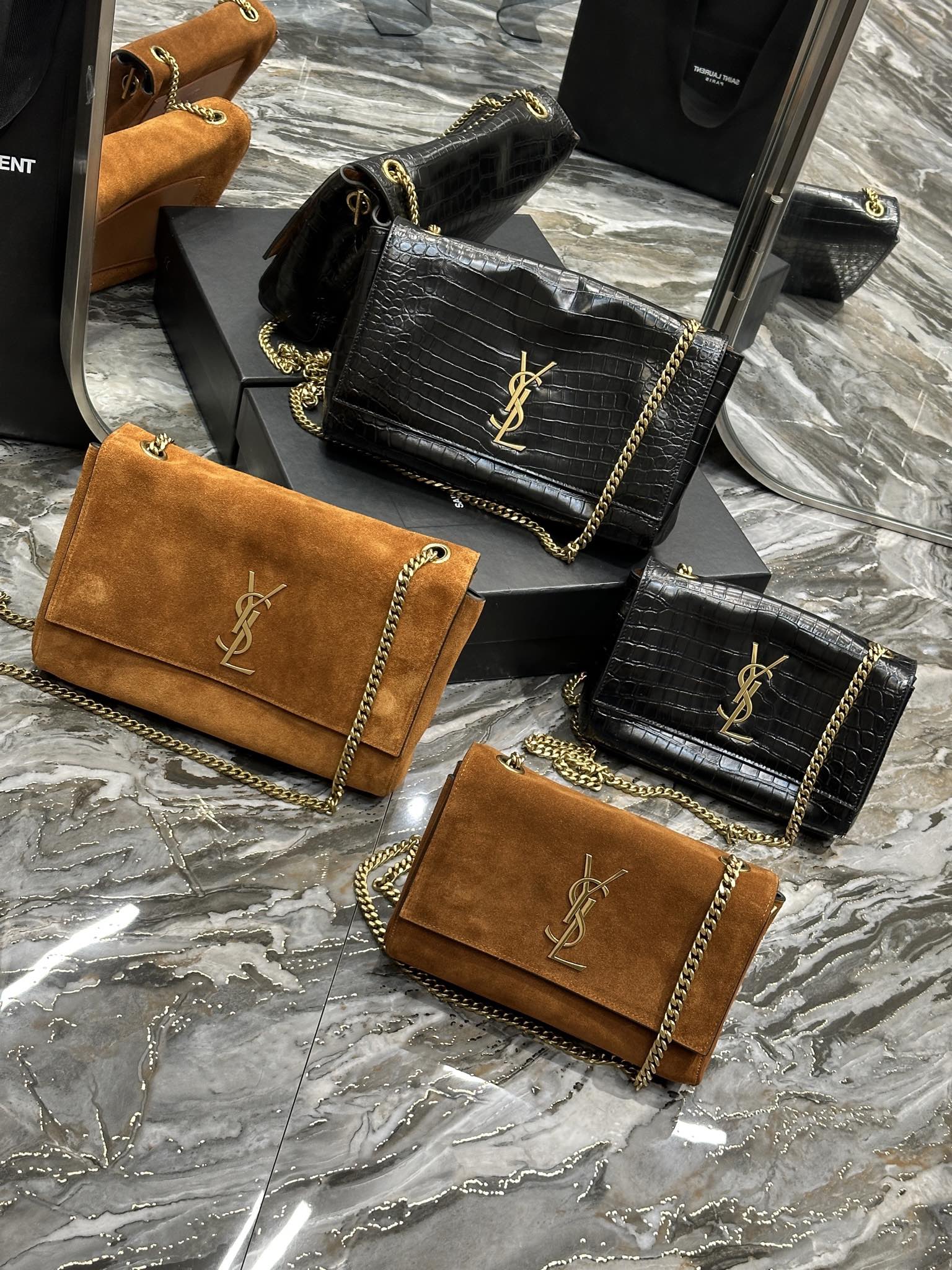 YSL Saint Laurent Kate Double-Sided Black Crocodile Embossed with Suede 22/28cm