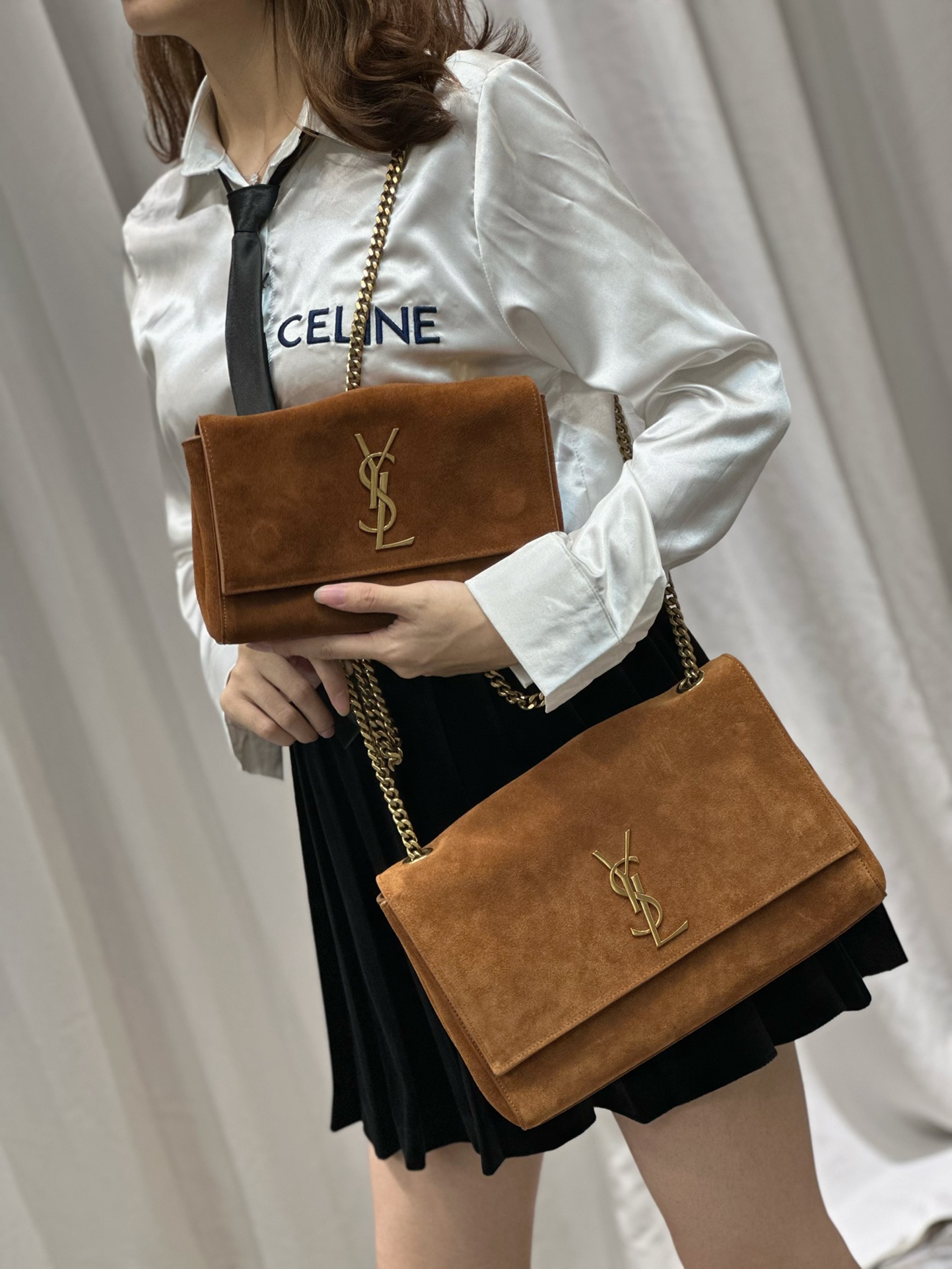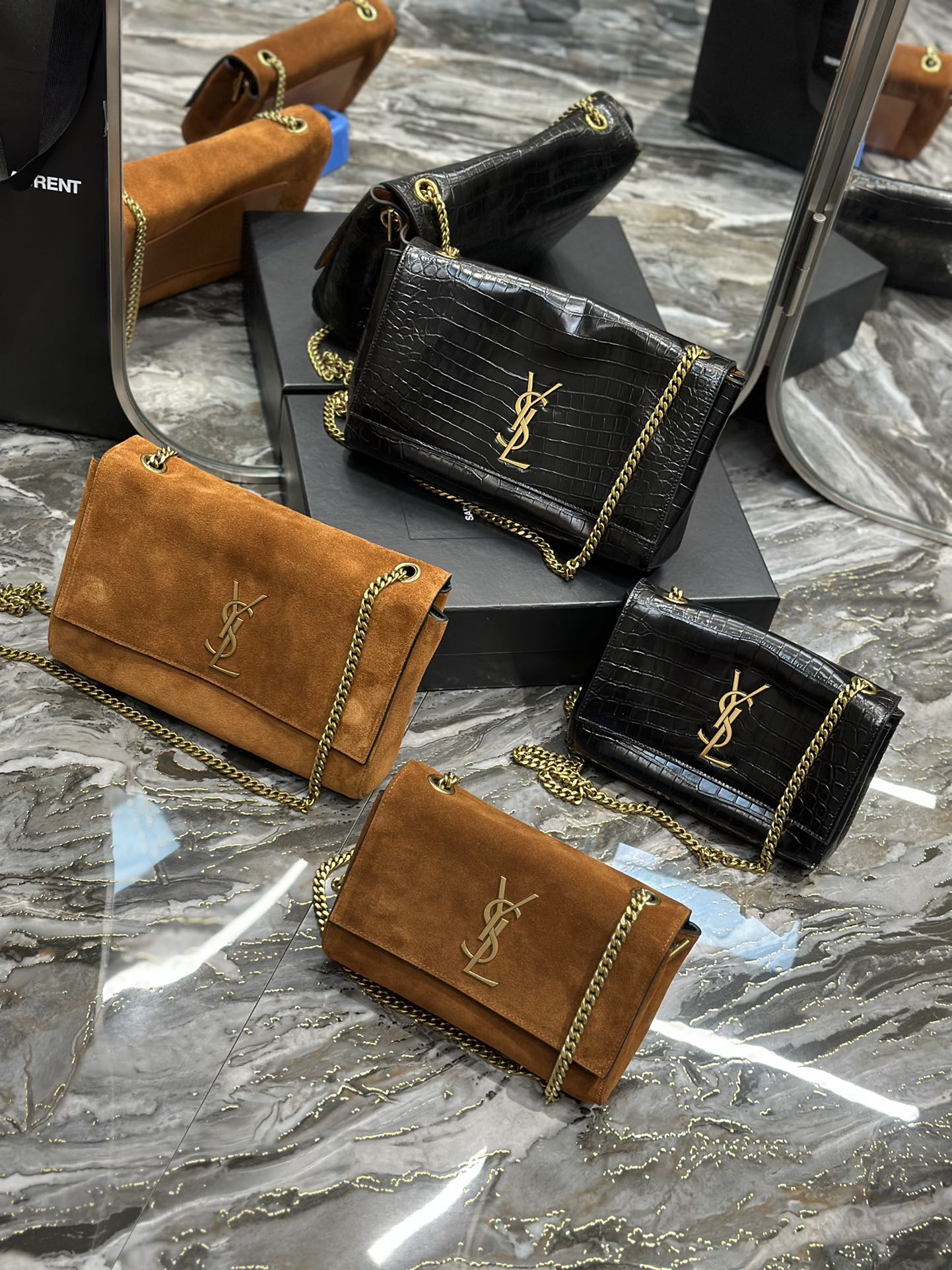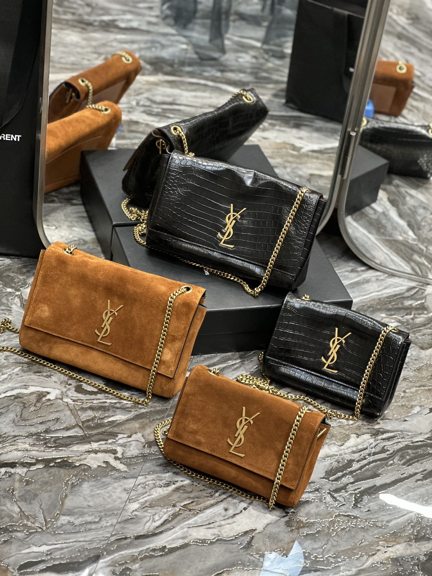 YSL Saint Laurent Kate Double-Sided Black Crocodile Embossed with Suede 22/28cm
