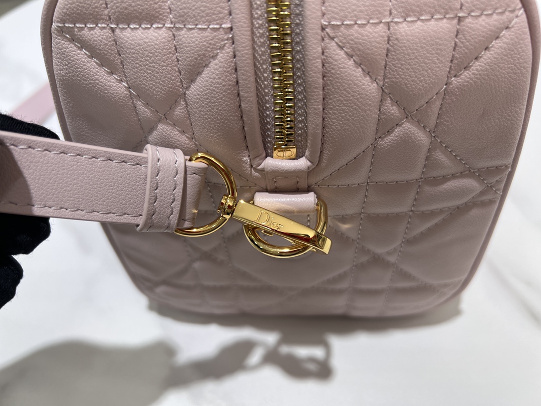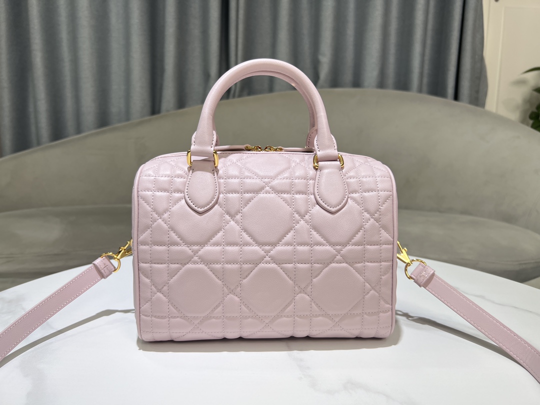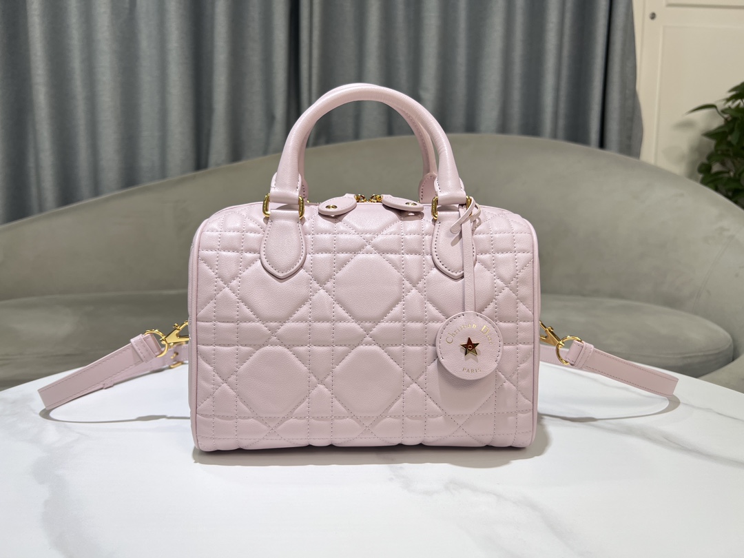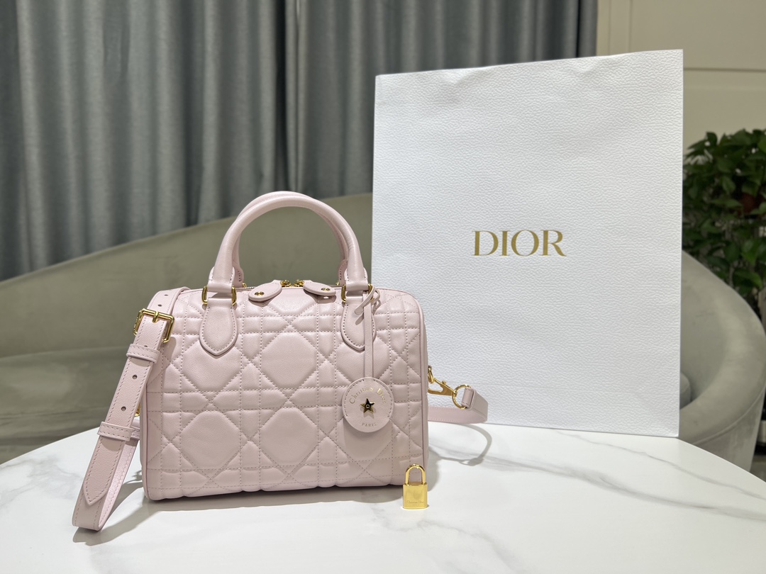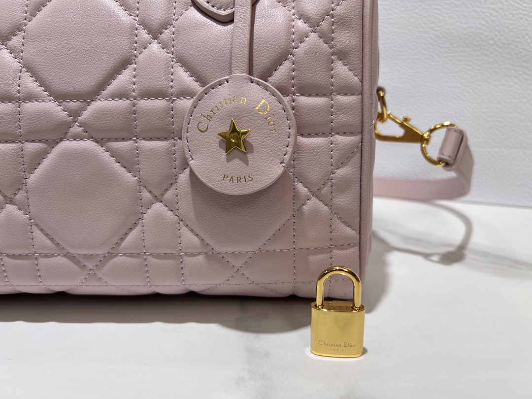 This Dior Groove 20 handbag is a new product from the 2024 winter ready-to-wear collection, designed by Maria Grazia Chiuri, elegant and stylish. It is meticulously crafted from pink calfskin, adorned with a quilted oversized cannage pattern, showcasing Dior's exquisite craftsmanship. The leather key pouch features the Christian Dior Paris logo and is embellished with gold-finish stars, giving it a unique character. The attached key opens the zip lock. The spacious compartment includes a slip pocket and a zip pocket, accommodating various daily essentials. It comes with a leather top handle and an adjustable, detachable shoulder strap, allowing it to be carried by hand, on the shoulder, or cross-body, making it an ideal handbag for creating everyday looks.