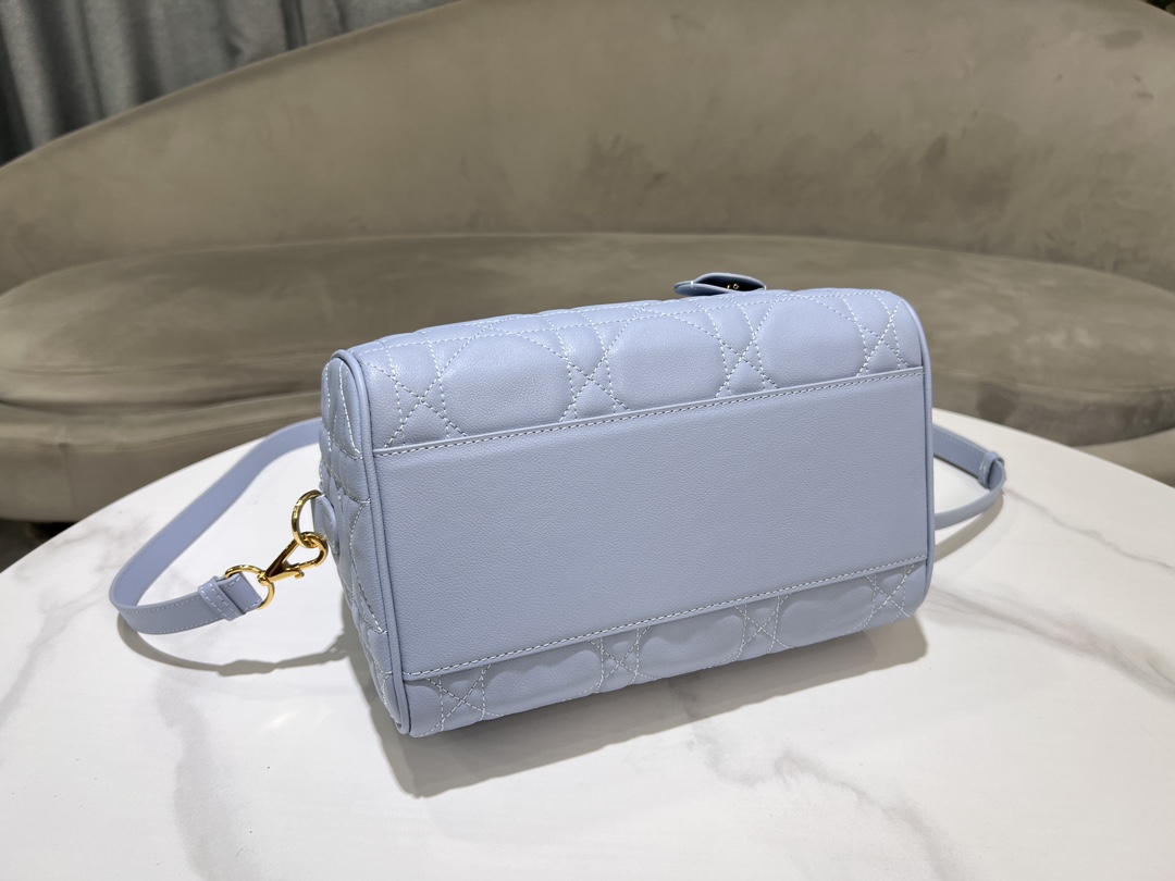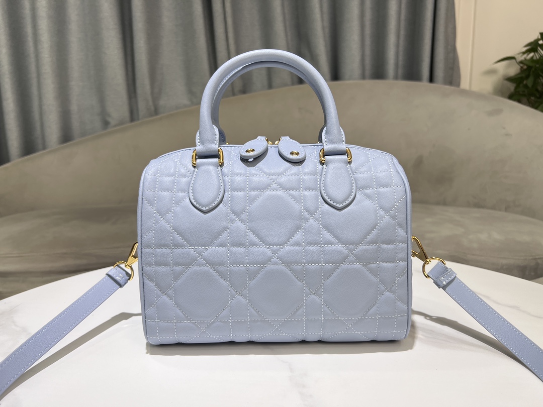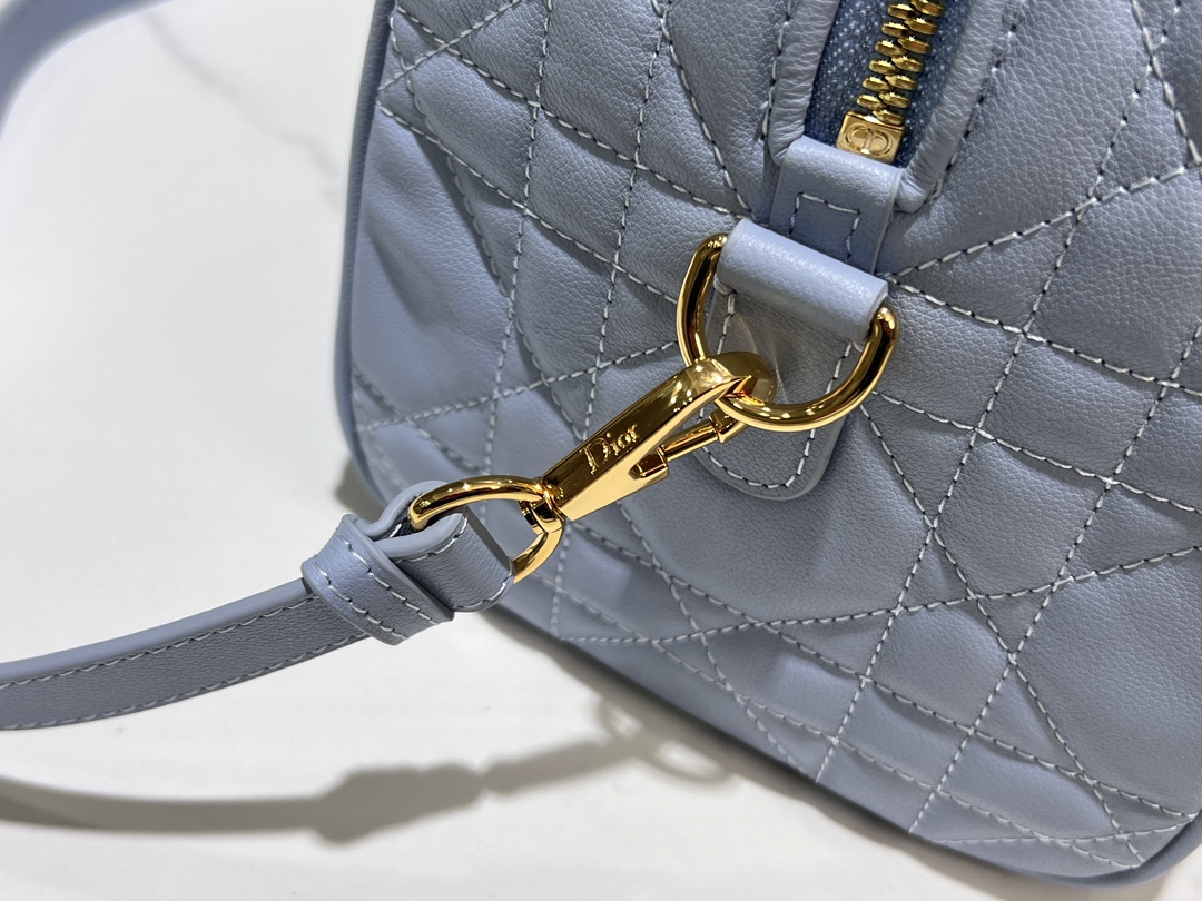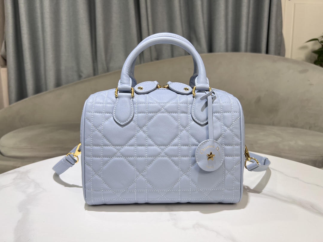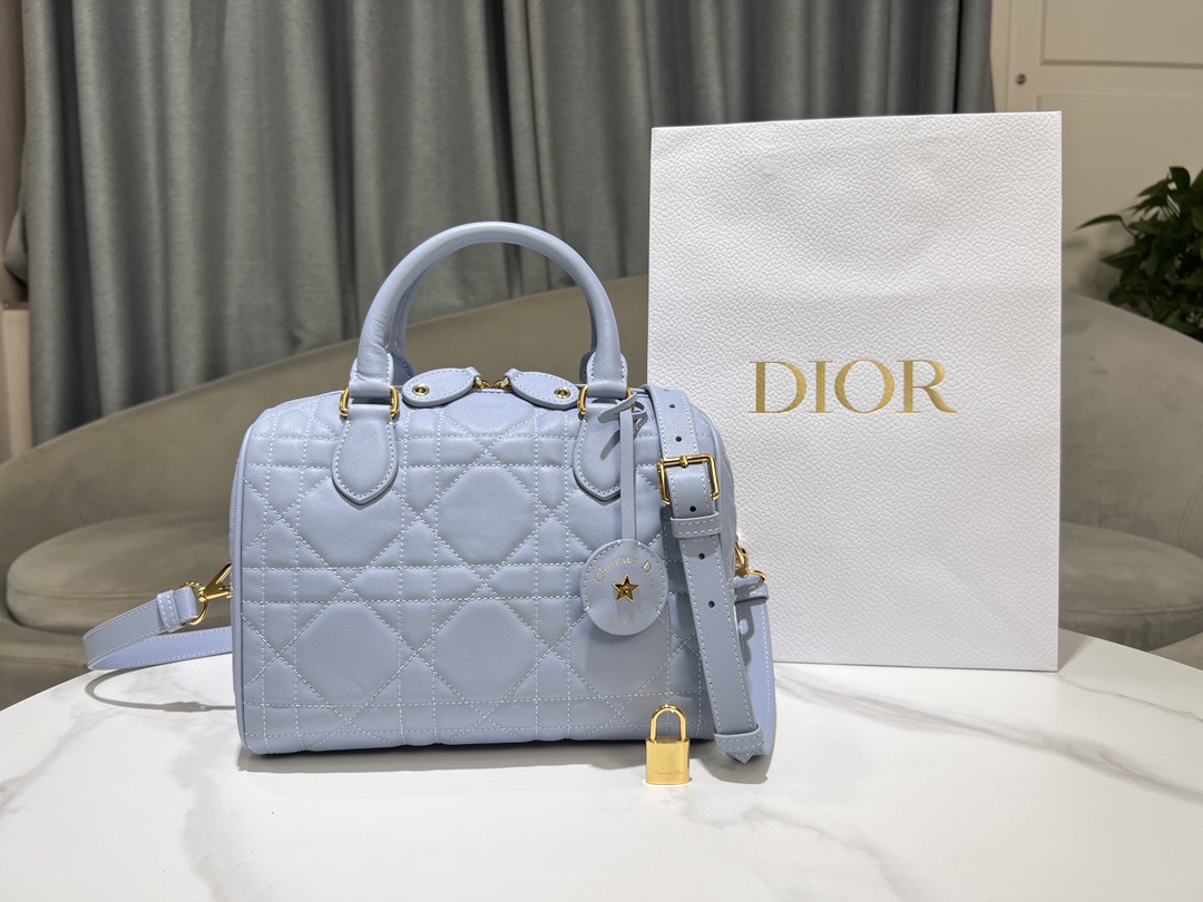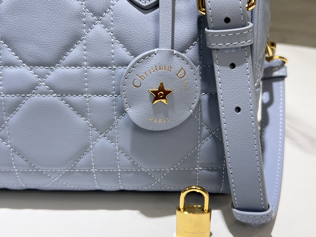 This Dior Groove 20 bag is a new product from the Winter 2024 ready-to-wear collection, designed by Maria Grazia Chiuri, elegant and fashionable. Meticulously crafted from blue calfskin leather, it features an oversized quilted cannage pattern, showcasing Dior's exquisite craftsmanship. The leather key pouch is adorned with the Christian Dior Paris logo and embellished with gold-finished stars, giving it a unique character. The attached key opens the zip padlock. The spacious compartment includes a slip pocket and a zip pocket, accommodating various daily essentials. It comes with a leather top handle and an adjustable, detachable strap, allowing it to be carried by hand, on the shoulder, or cross-body, making it an ideal bag for creating everyday looks.