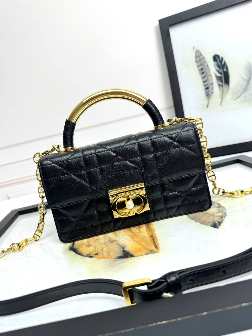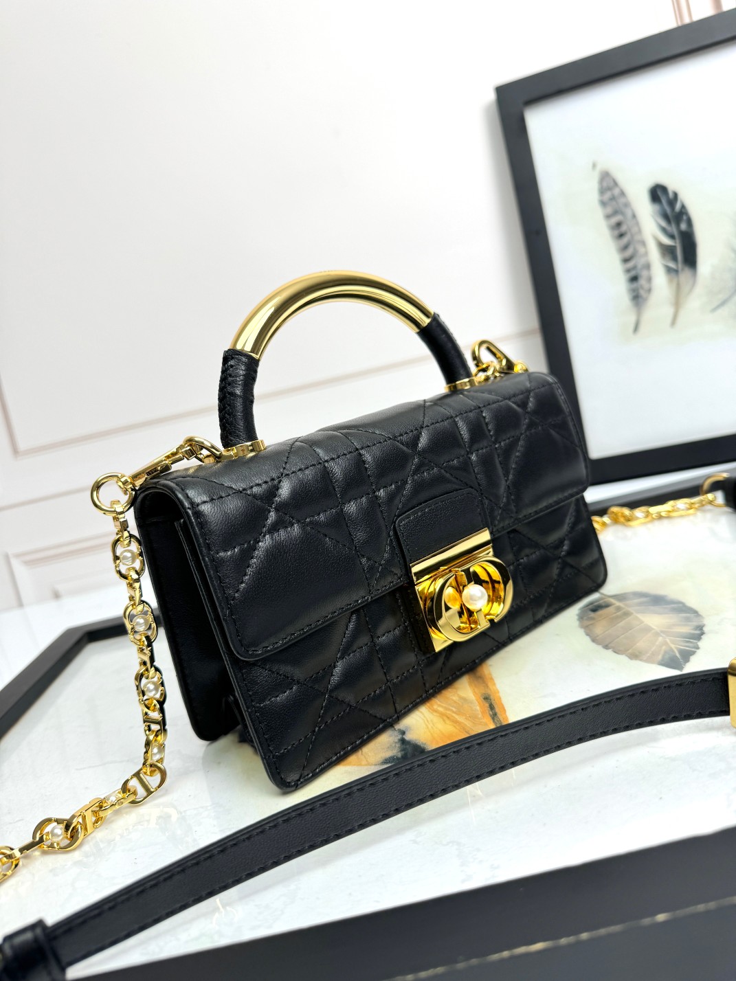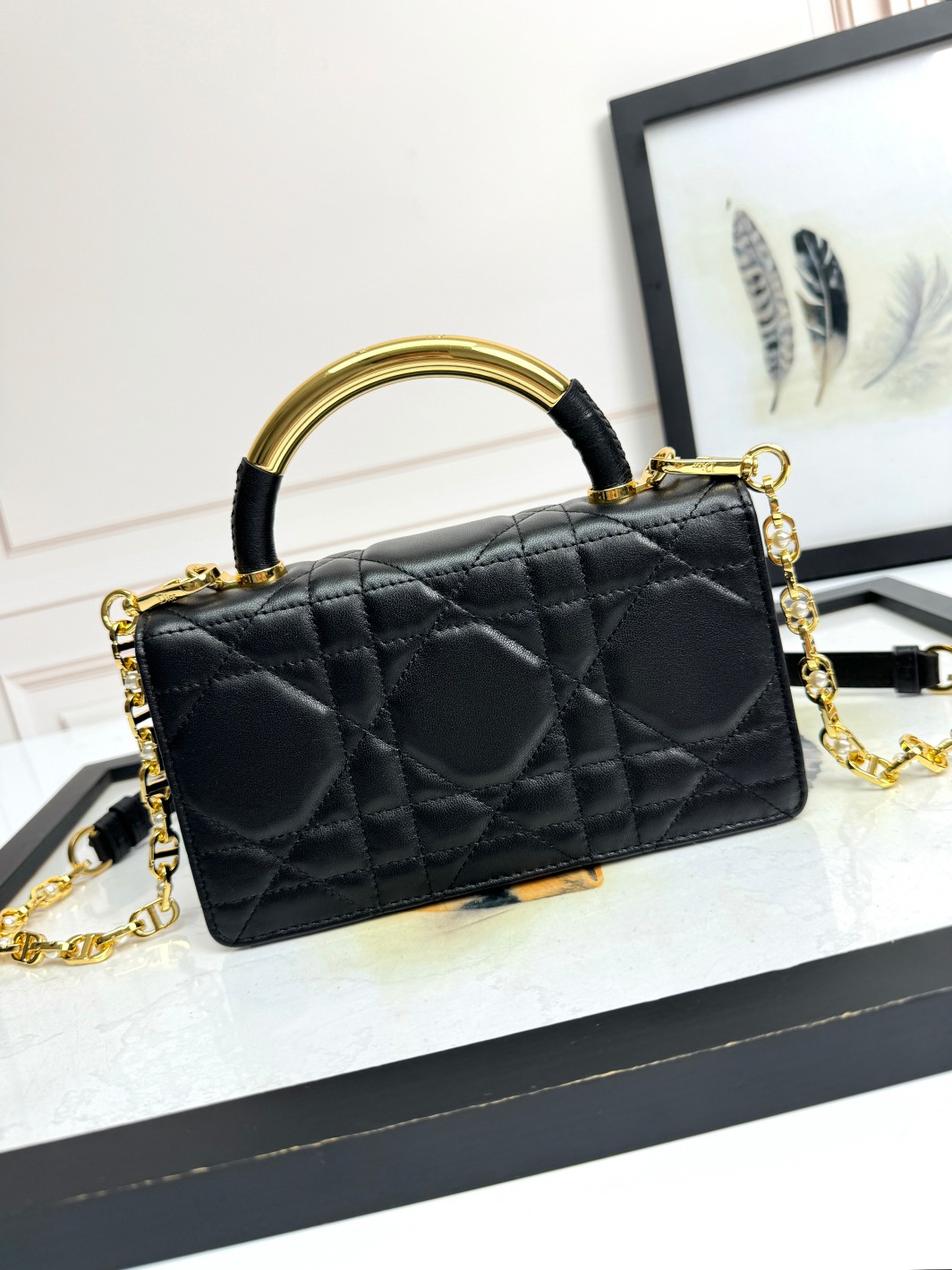 This Dior Ange bag is a new addition to the Fall 2024 ready-to-wear collection, launching Dior's new series with an elegant and stylish aesthetic. Meticulously crafted from black calfskin, it features an oversized cannage stitch pattern. The sturdy antique gold-finished metal top handle is engraved with the Christian Dior Paris logo, and the flap is adorned with a CD clasp embellished with resin beads, giving it a unique design. The silhouette, lined with triangular padding, includes two spacious compartments and a slip pocket to hold various everyday items. In a mini size with an elegant design, the adjustable and detachable chain strap is composed of gold-finished metal CD links embellished with resin beads, allowing it to be carried by hand, on the shoulder, or cross-body. Model: D6213. Size: 20 x 12 x 5 cm