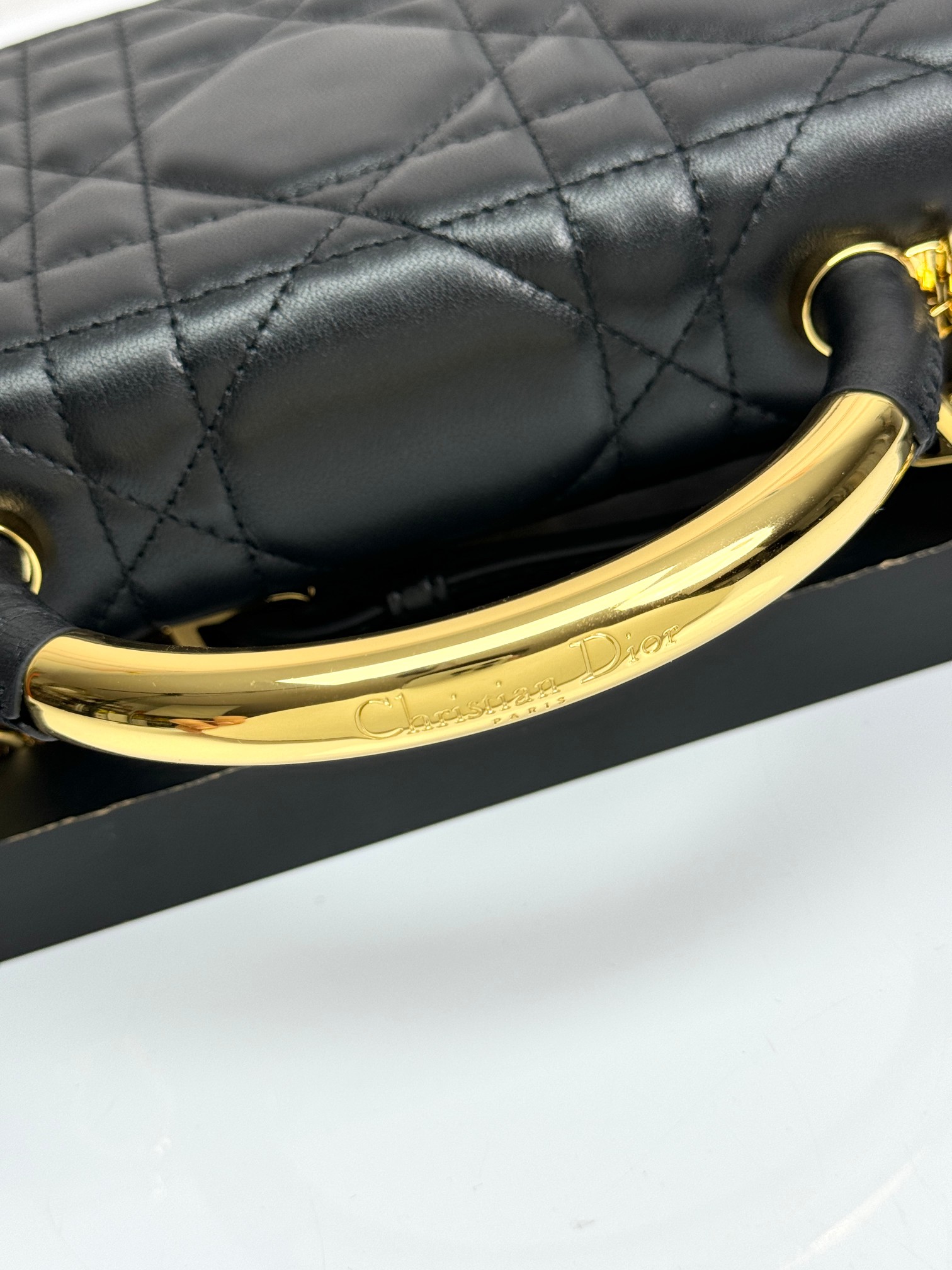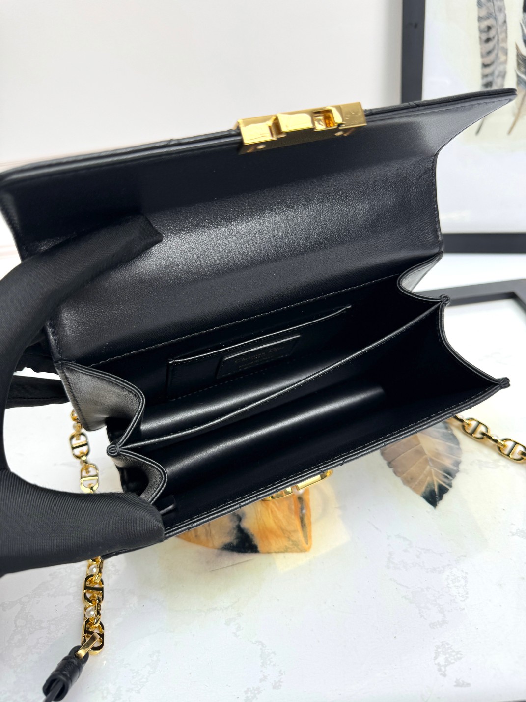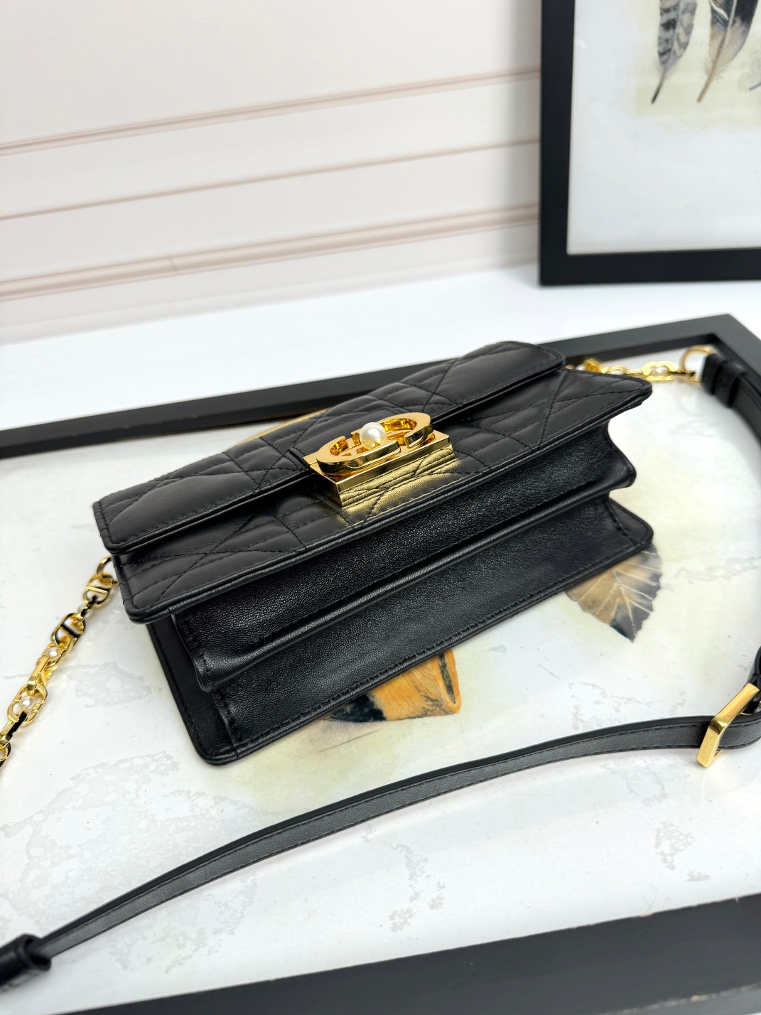 This Dior Ange bag is a new addition to the Fall 2024 ready-to-wear collection, launching Dior's new series with an elegant and stylish aesthetic. Meticulously crafted from black calfskin, it features an oversized cannage stitch pattern. The sturdy antique gold-finished metal top handle is engraved with the Christian Dior Paris logo, and the flap is adorned with a CD clasp embellished with resin beads, giving it a unique design. The silhouette, lined with triangular padding, includes two spacious compartments and a slip pocket to hold various everyday items. In a mini size with an elegant design, the adjustable and detachable chain strap is composed of gold-finished metal CD links embellished with resin beads, allowing it to be carried by hand, on the shoulder, or cross-body. Model: D6213. Size: 20 x 12 x 5 cm