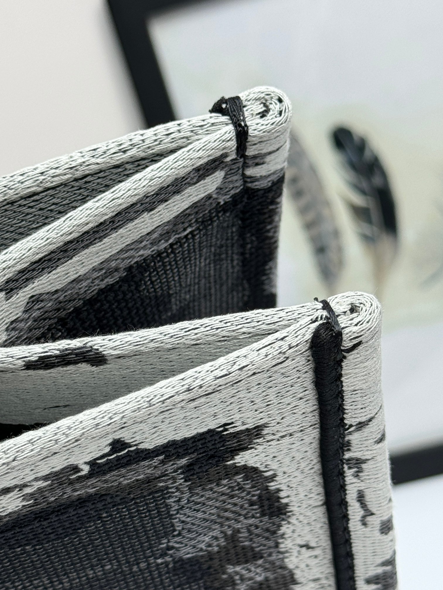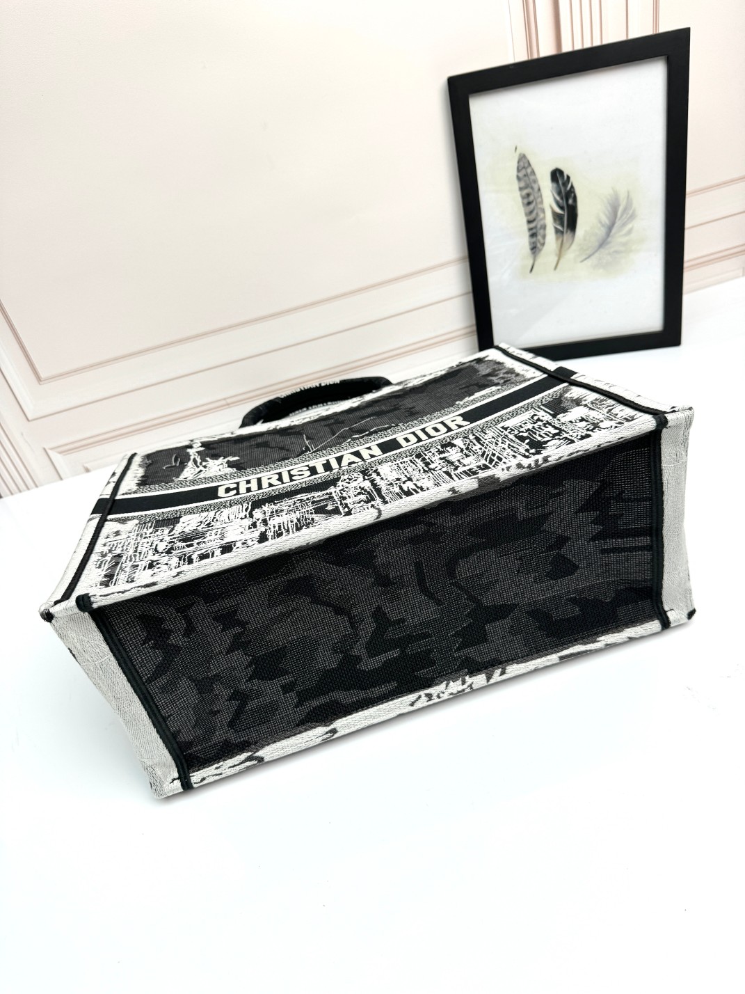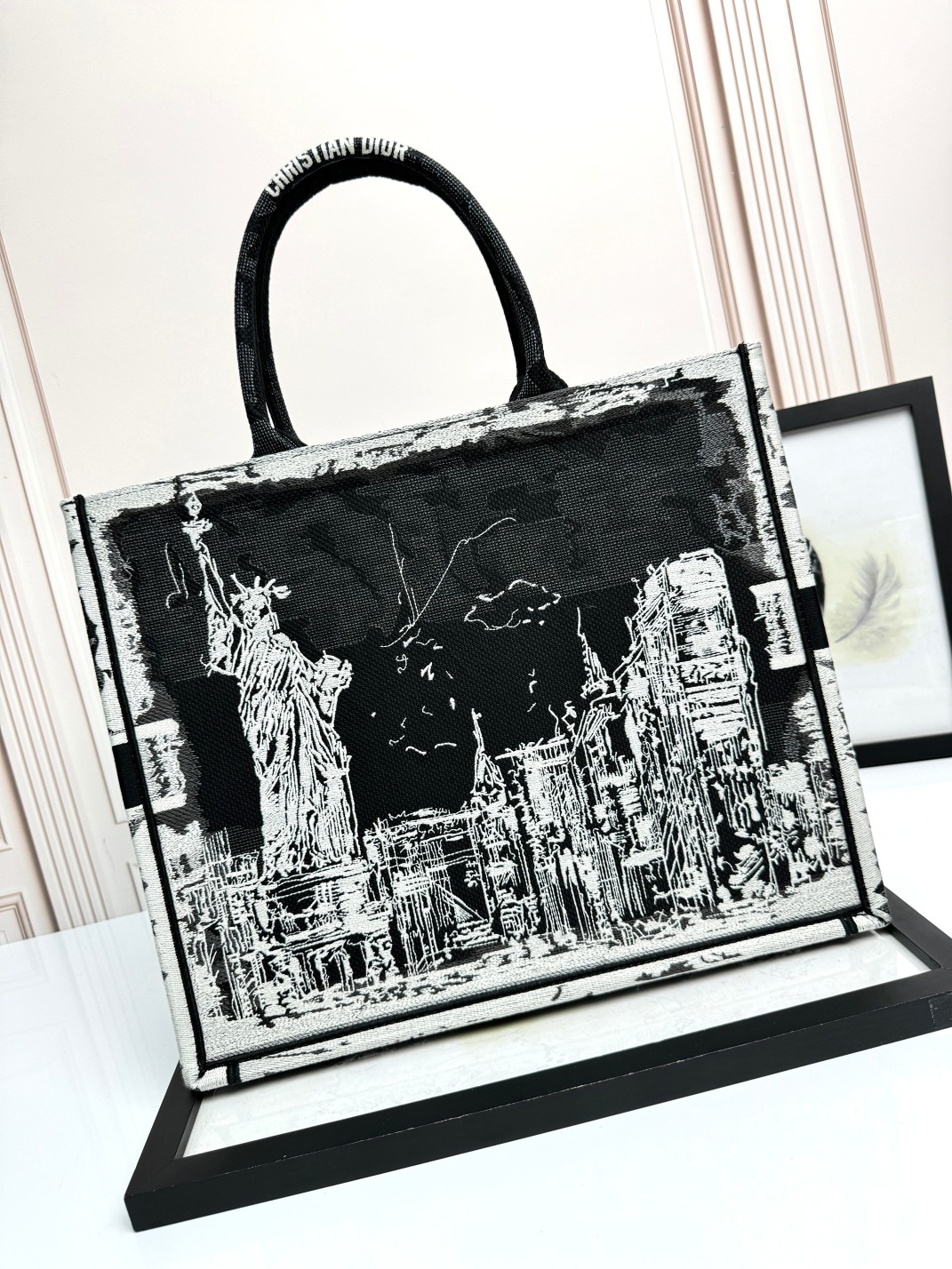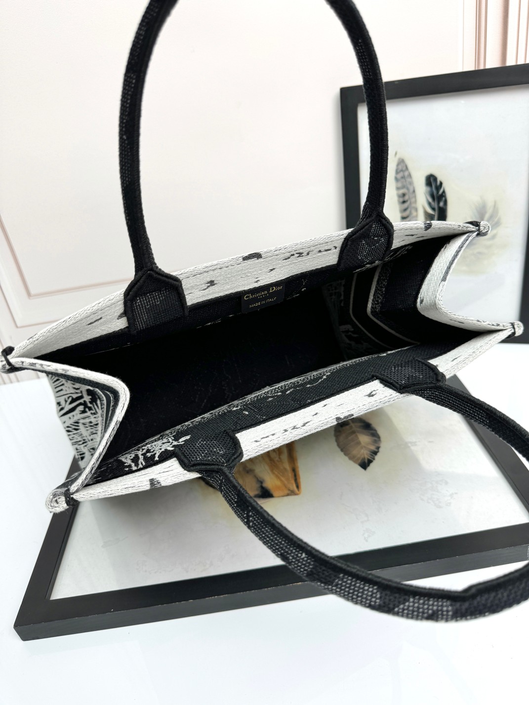 This Book Tote handbag, designed by Dior's Women's Creative Director Maria Grazia Chiuri, is a flagship product that embodies Dior's aesthetics. The white style is fully embroidered with a multicolored Butterfly Around The World pattern, highlighting the classic beauty of the collection. It is adorned with the phrase "L'envol des papillons dévoile nos désirs aux étoiles" and can hold various everyday items. The medium size features the Christian Dior Paris logo on the front, showcasing Dior's exquisite craftsmanship, and can be carried by hand or over the shoulder.
