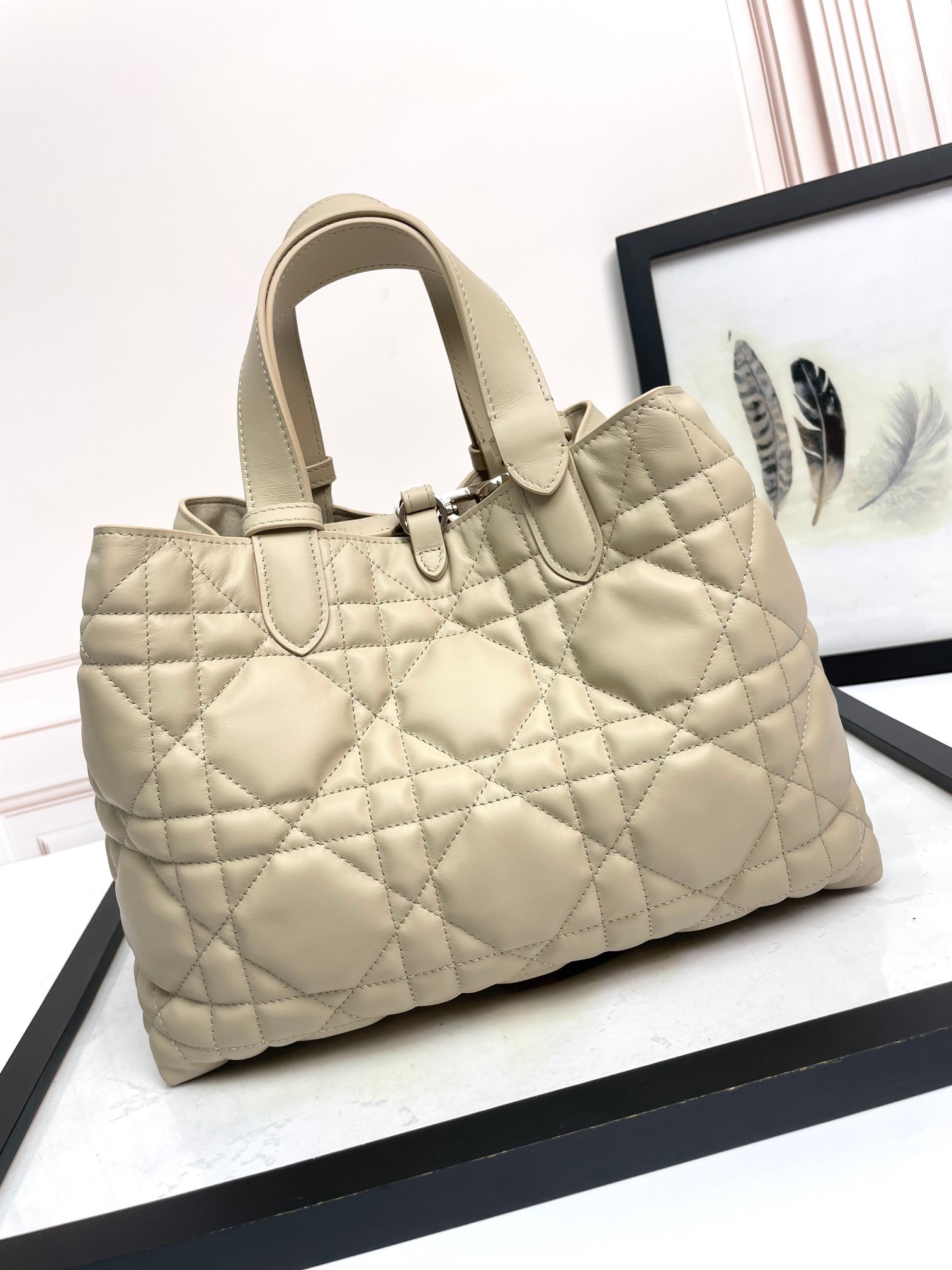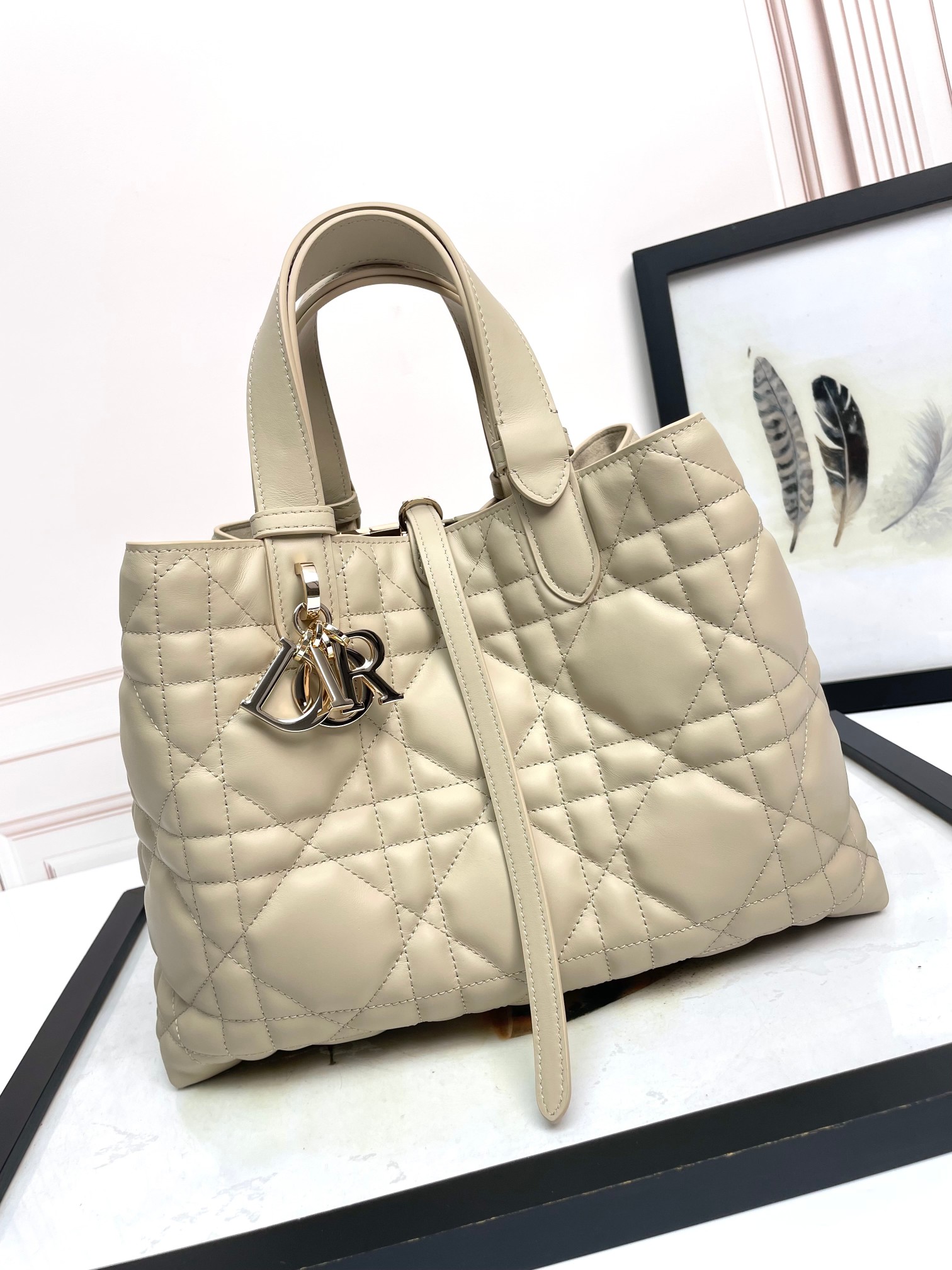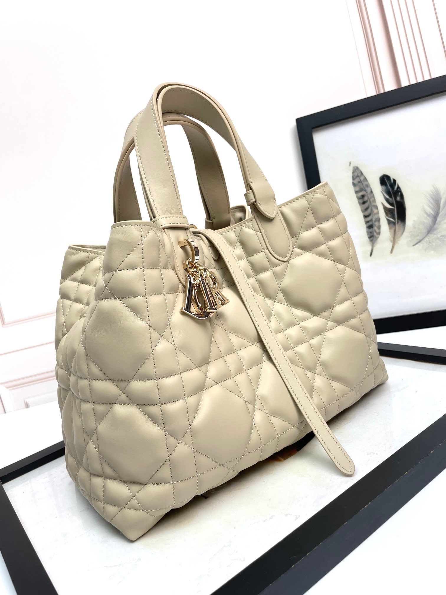This Dior Toujours bag made a stunning appearance in the Spring-Summer 2023 collection runway show, featuring a uniquely stylish, casual, and practical design. Meticulously crafted from off-white calfskin leather, it is adorned with oversized cannage stitch detailing on the surface. The spacious interior compartment, along with a pouch, allows for neat organization of various daily essentials. It features a leather tie closure for securely storing items, and an additional CD Lock with the letter 'D' knob closure, adjustable on both sides to enhance the style. The medium style comes with leather handles featuring adjustable details for easy carrying.