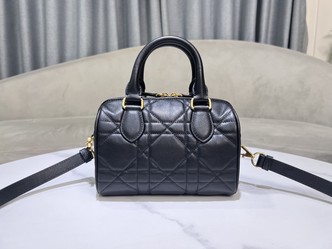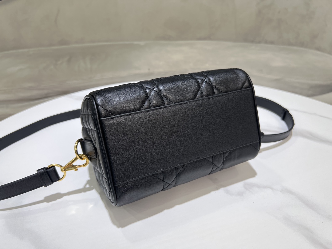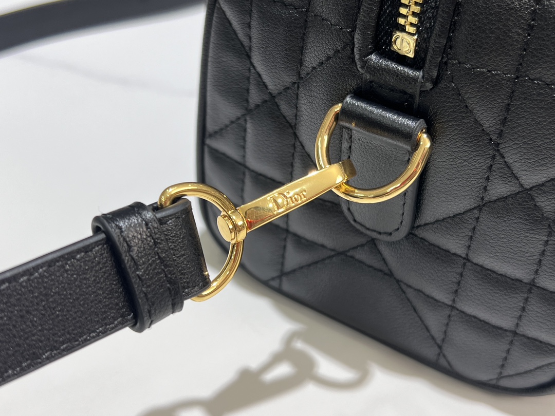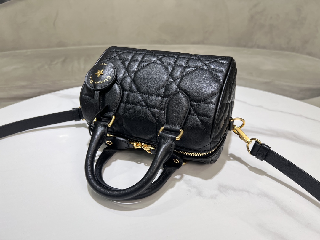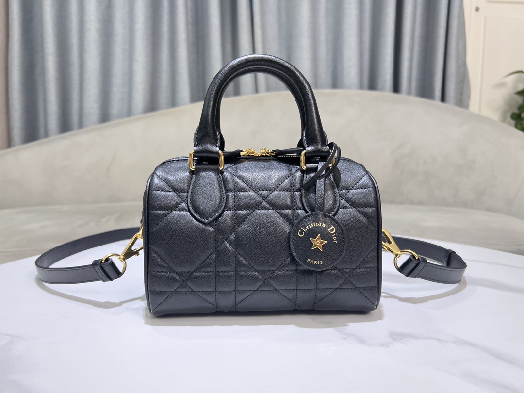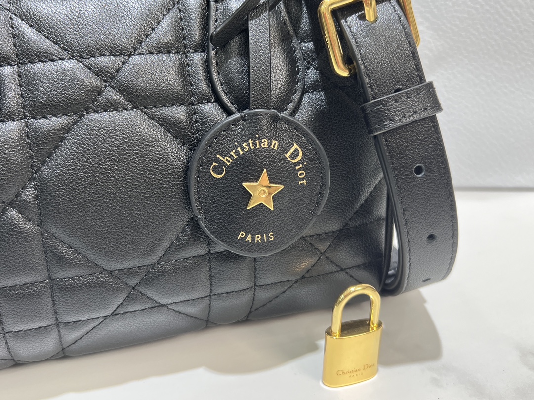 This Dior Groove 20 bag is a new product from the 2024 Winter Ready-to-Wear collection, designed by Maria Grazia Chiuri, elegant and stylish. Meticulously crafted from black calfskin, adorned with a quilted oversized cannage pattern, showcasing Dior's exquisite craftsmanship. The leather key pouch features the Christian Dior Paris logo and is embellished with gold-finished stars, giving it a unique character. The attached key can open the zip lock. The spacious compartment includes a slip pocket and a zip pocket, capable of holding various daily essentials. Equipped with a leather top handle and an adjustable, detachable shoulder strap, it can be carried by hand, on the shoulder, or cross-body, making it an ideal bag for creating everyday looks.