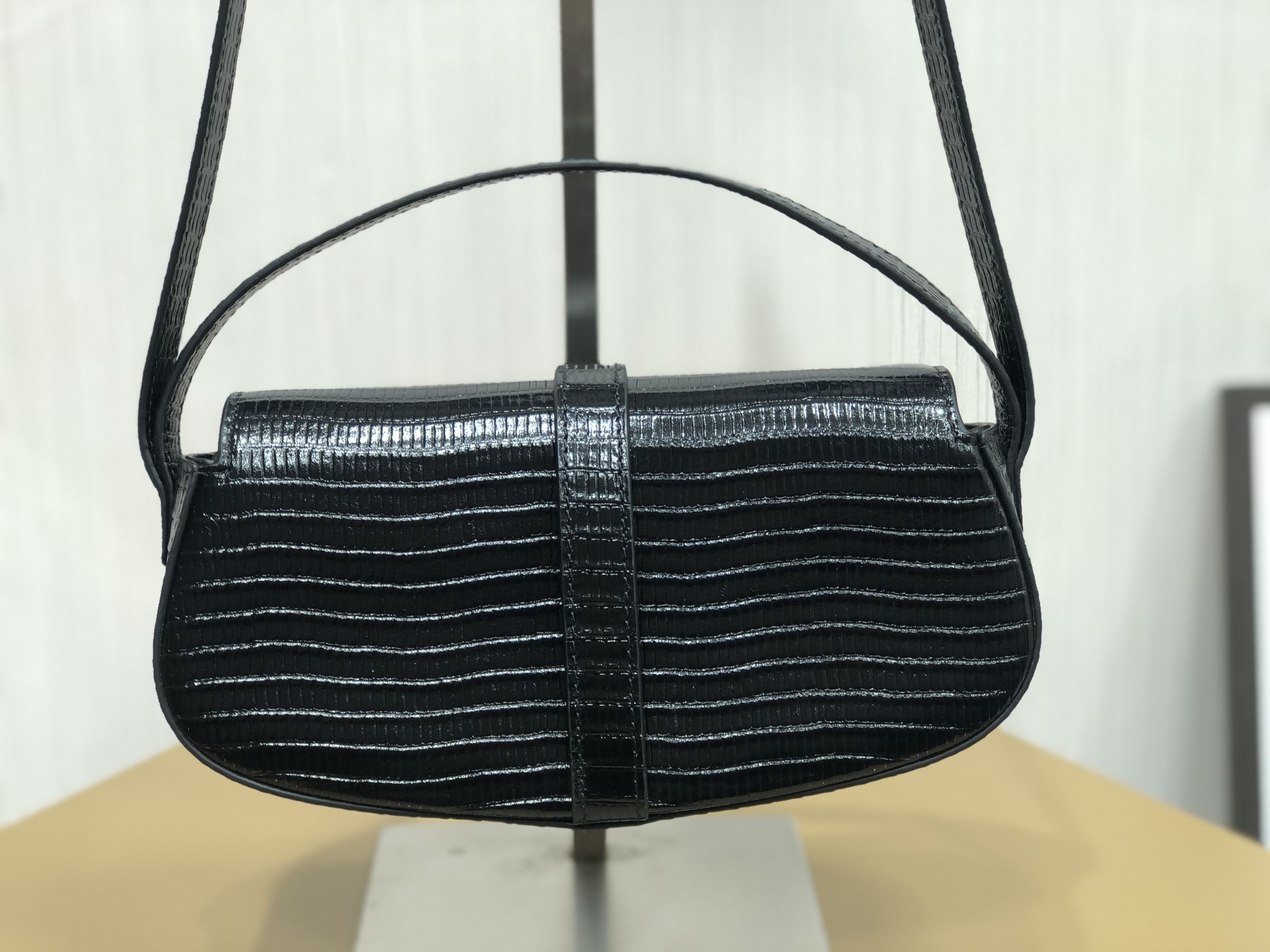 The bag is designed with one long and one short leather strap, not adjustable, can be carried by hand or on the shoulder.