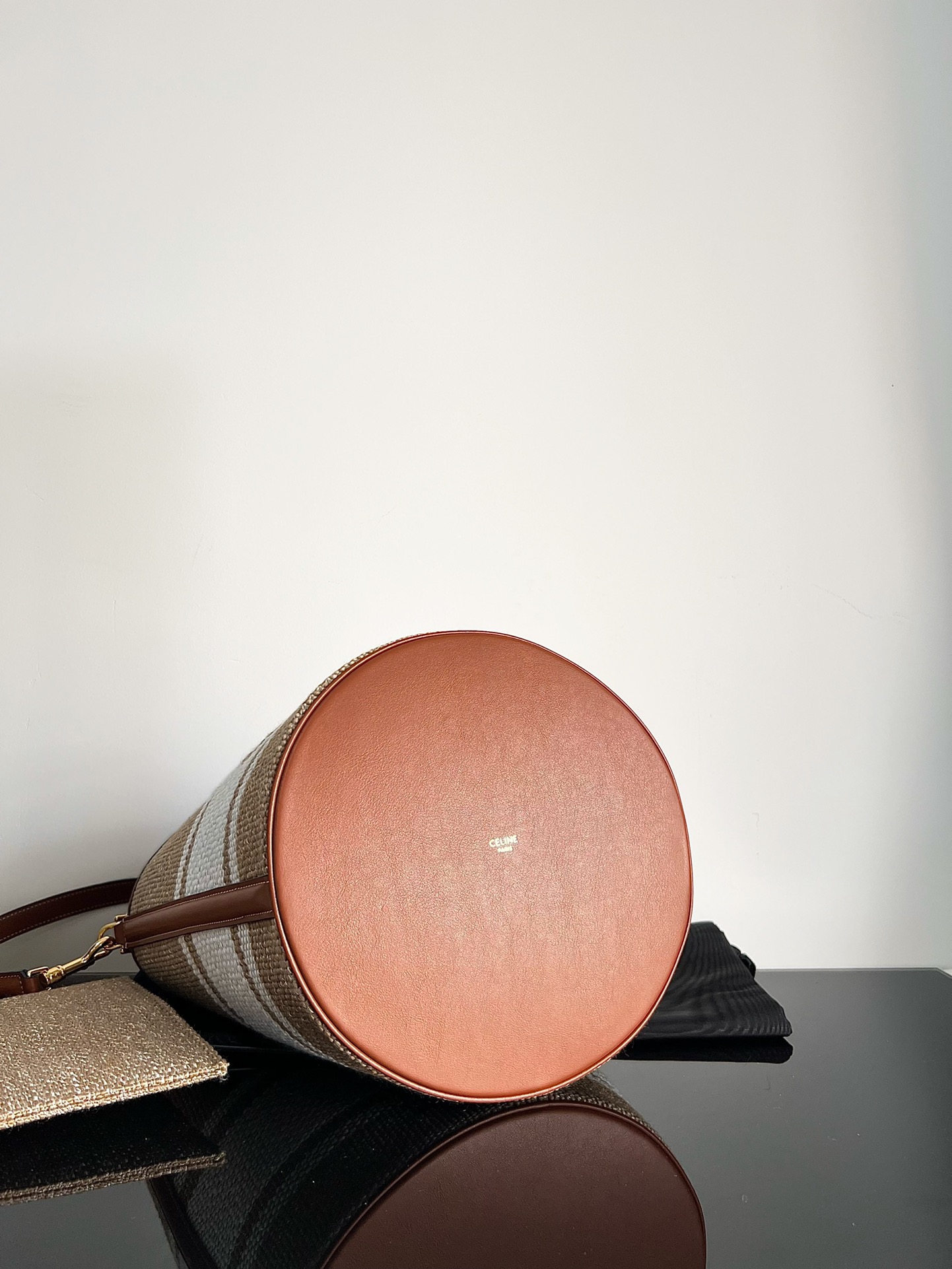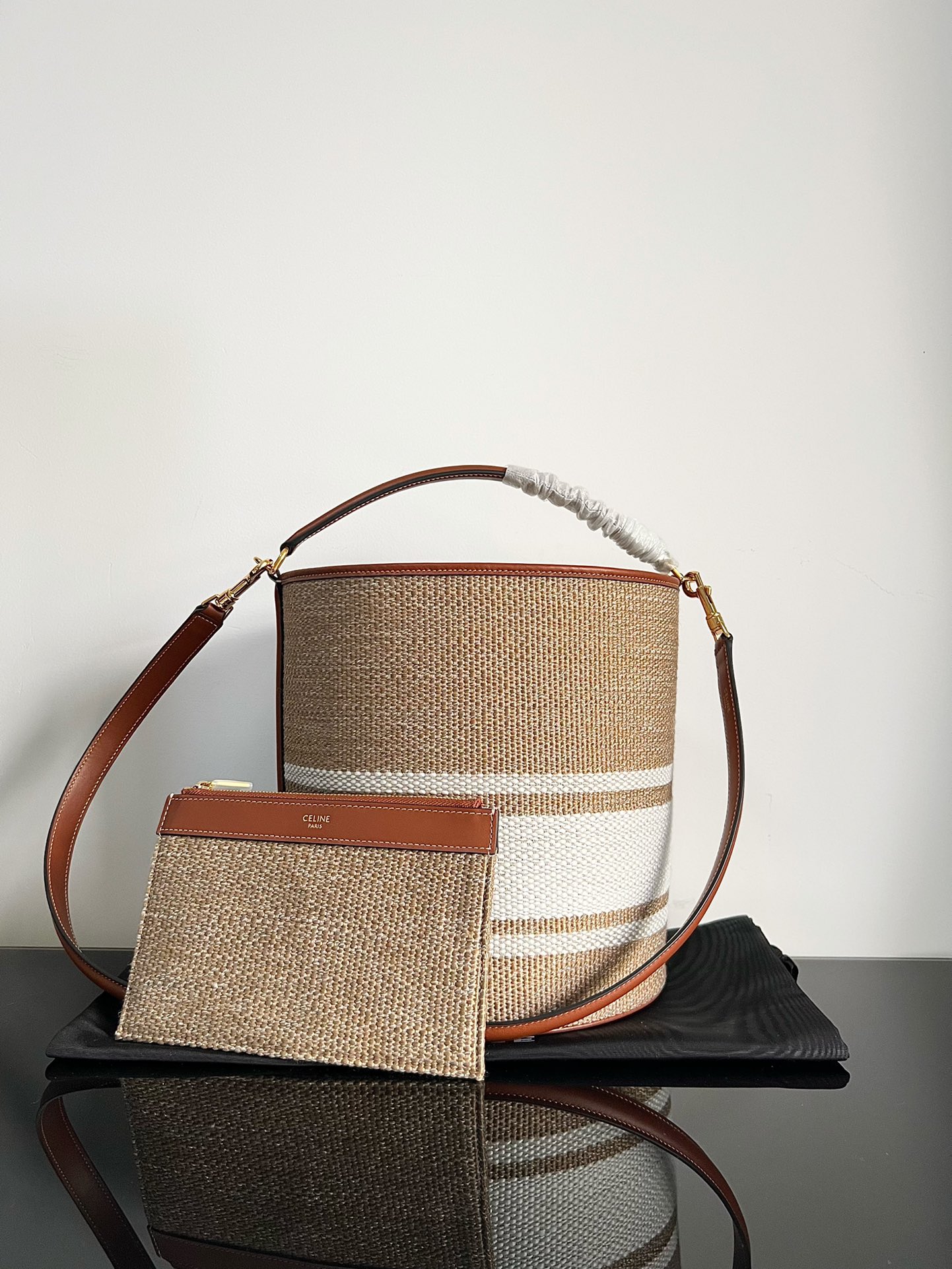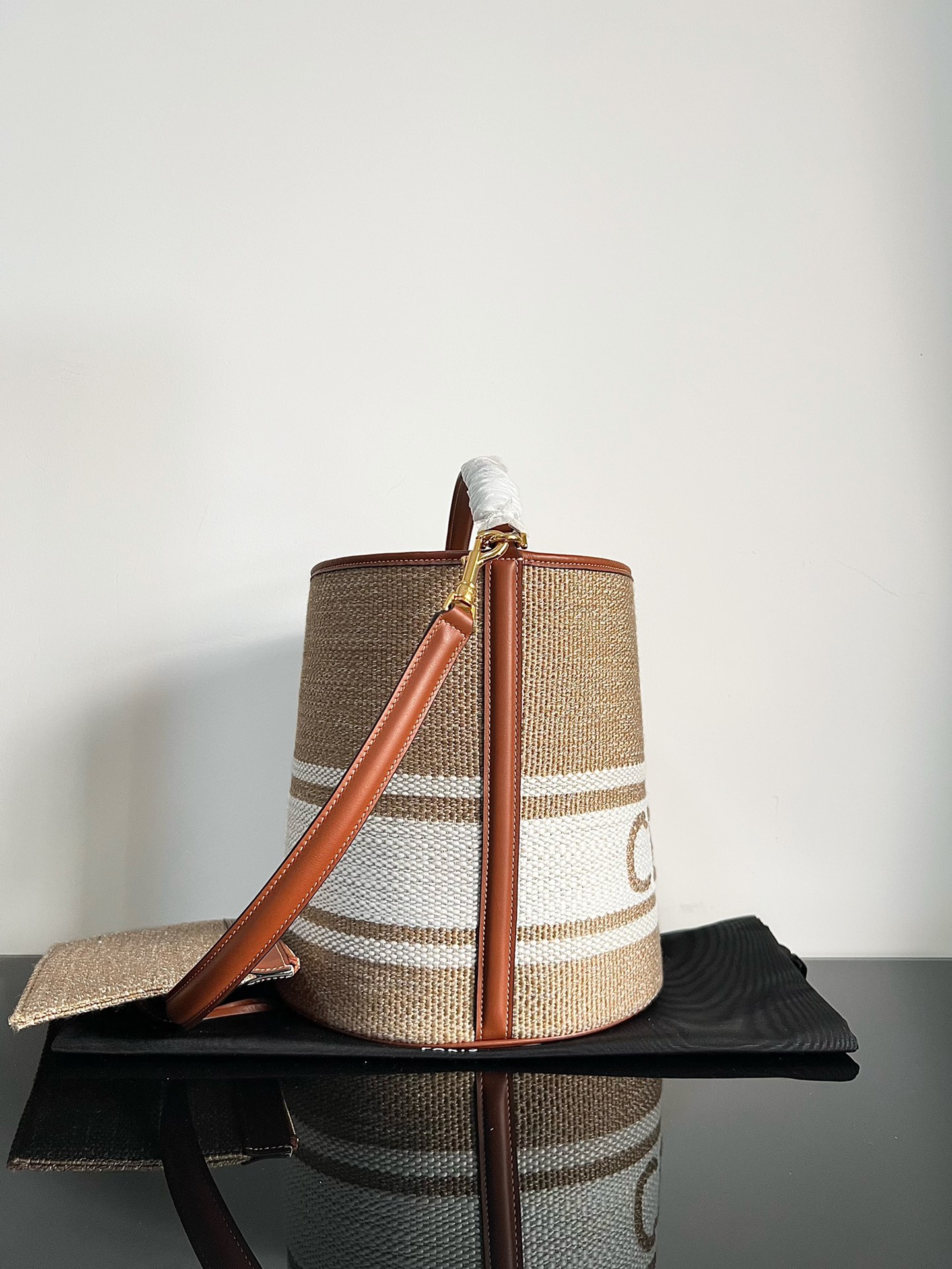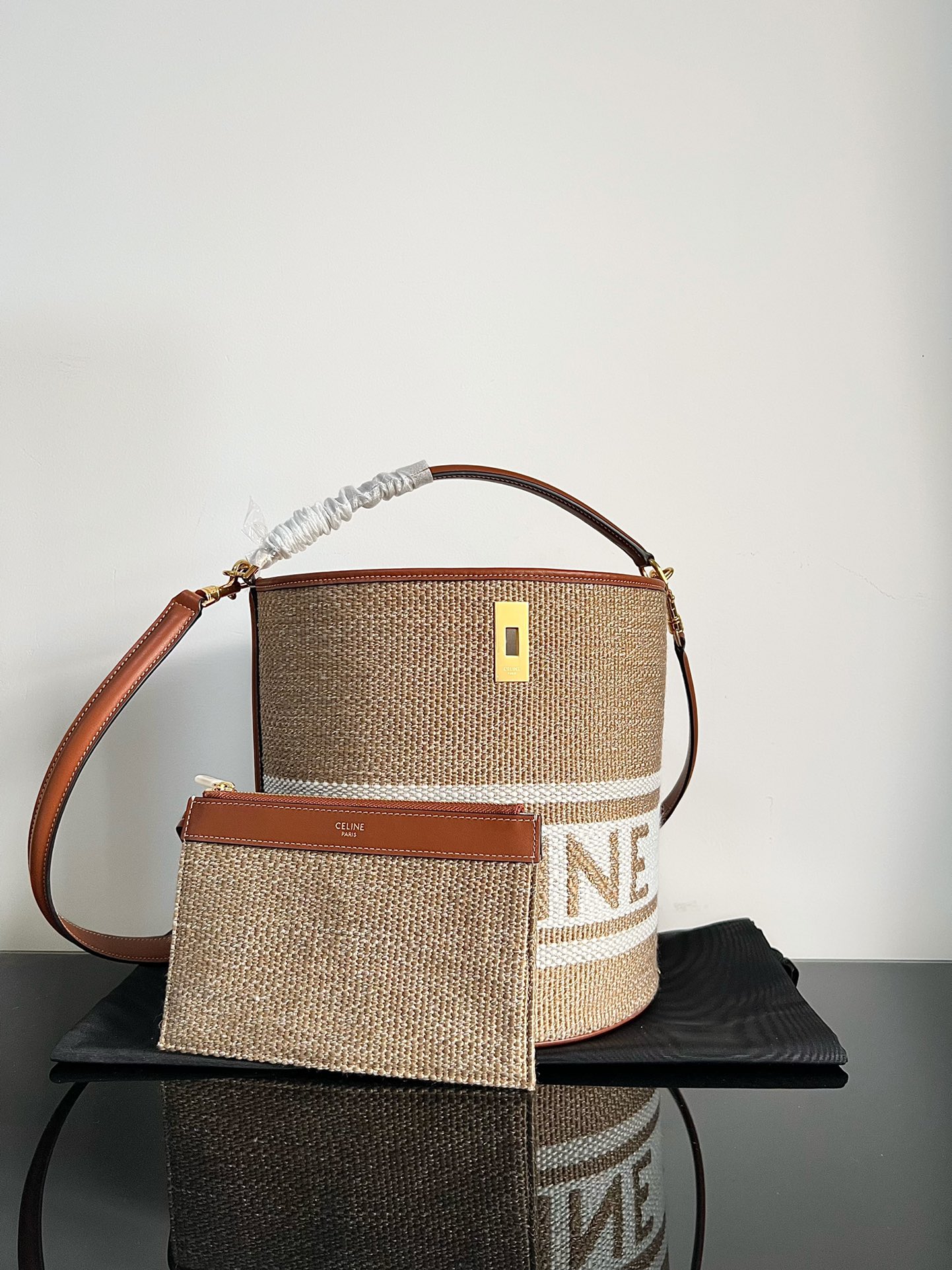 CELINE BUCKET 16 Wool Bucket Bag [Original Factory Leather, Full Steel Hardware] Natural/Tan, Dimensions: 23 X 24.5 X 23cm, Leather Trim, Lining: Fabric, Gold Finish, Can be Carried by Hand, Shoulder, and Crossbody, Rotating Lock Closure, Includes 1 Removable Inner Zipper Pocket, Comes with Removable Leather Strap