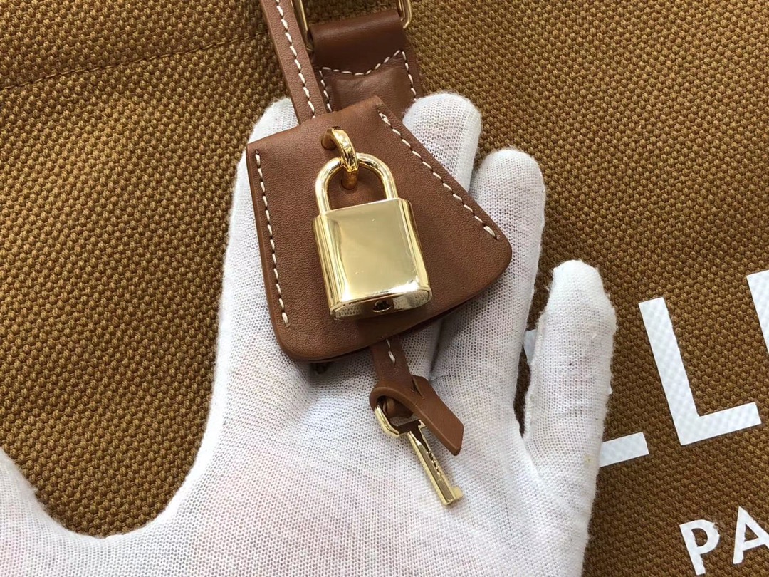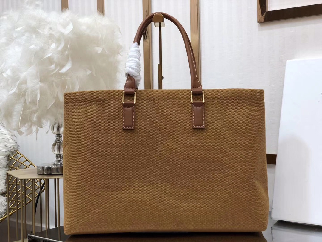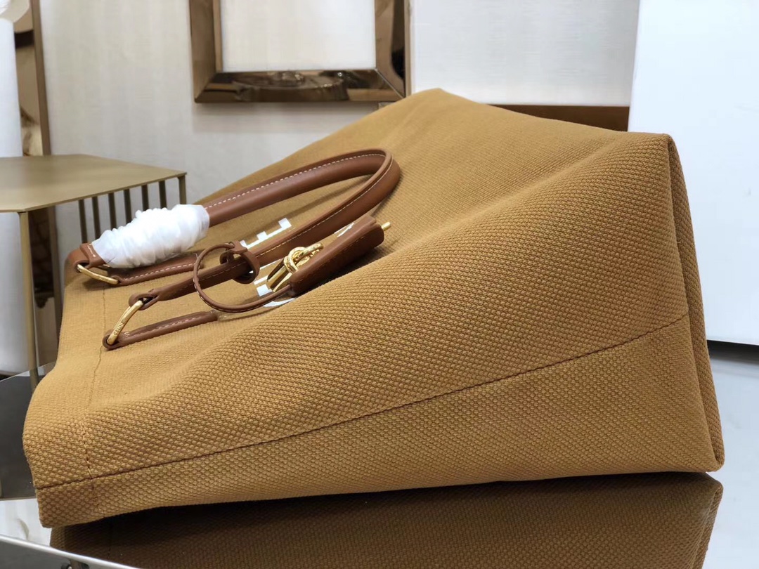The woven fabric perfect for summer paired with warm caramel brown calfskin. As always, simple and elegant, the silk-printed logo is particularly eye-catching. Like other shopping bags, although there is no zipper, there is a sufficiently large zippered inner pocket that can be locked, ensuring security. It has a large capacity, making it a great choice for short trips or daily commuting. Dimensions: 44/32/16 (190062)