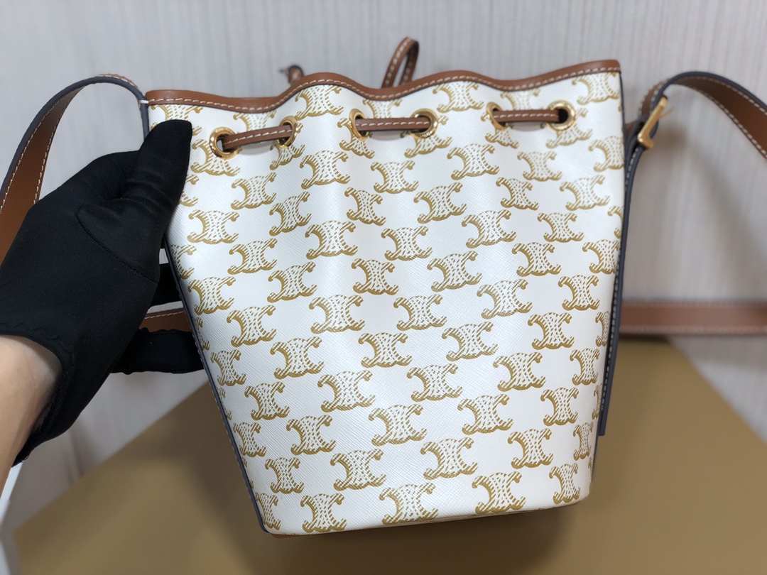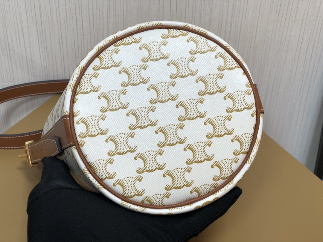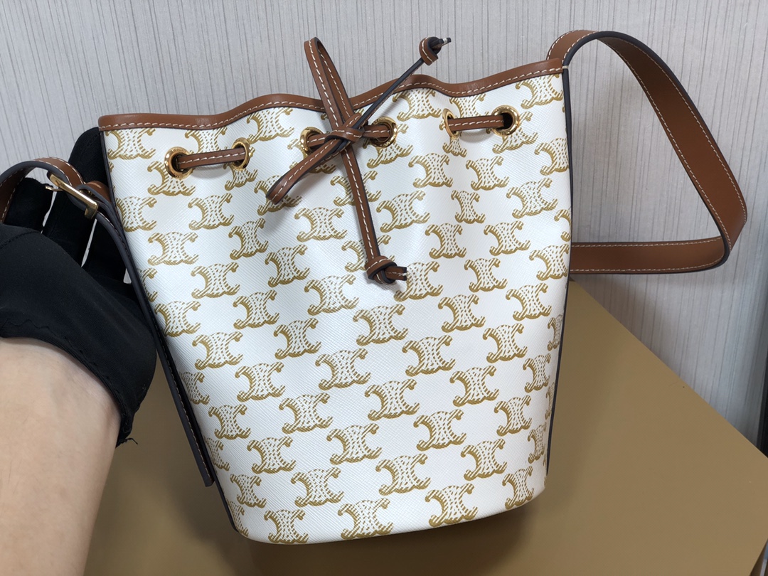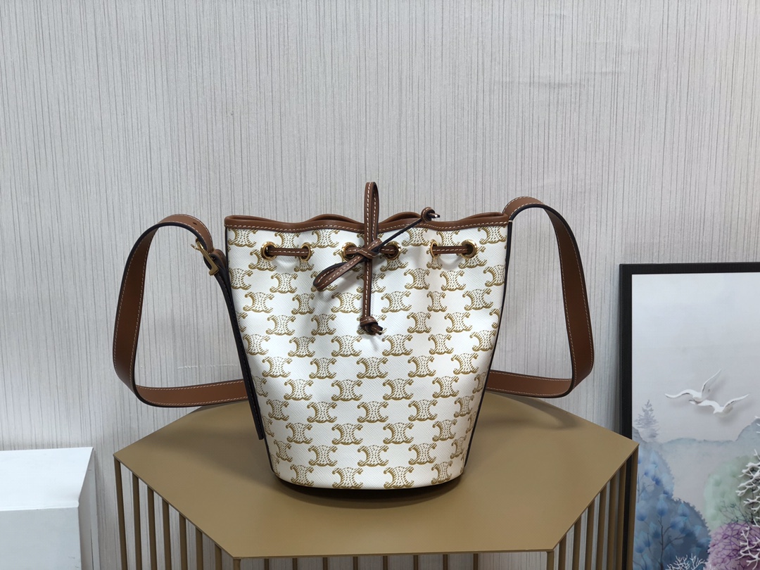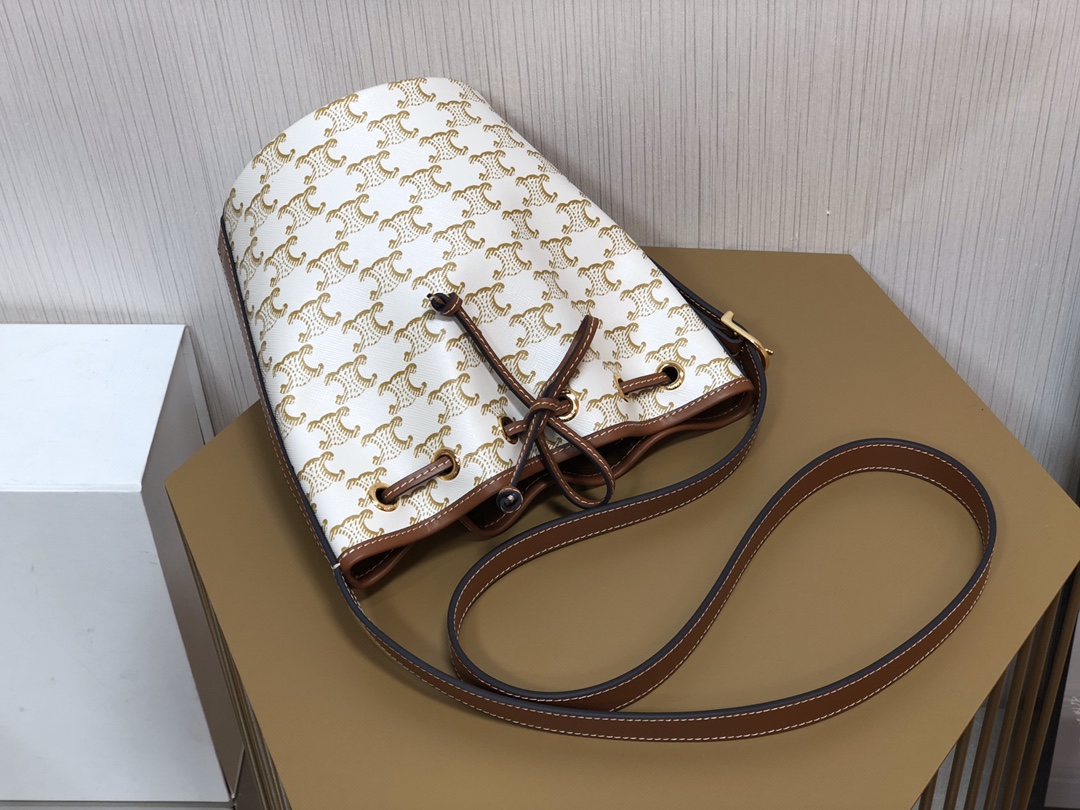 A perfect blend of aesthetics and practicality, fully meeting the trend of street-style hits. The highly popular bucket bag paired with the Arc de Triomphe print exudes a retro vibe. I've always loved CELINE's minimalist style—both vintage and fashionable. This lightweight and versatile bucket bag is incredibly spacious, and most importantly, extremely light. It doesn’t strain the shoulders even after long wear—perfect! TRIOMPHE embroidered fabric, edged with calf leather, lined with textile fabric, and featuring gold metal hardware. Can be worn crossbody or on the shoulder, with a drawstring leather strap. Includes one main compartment and an adjustable leather shoulder strap measuring 53cm.