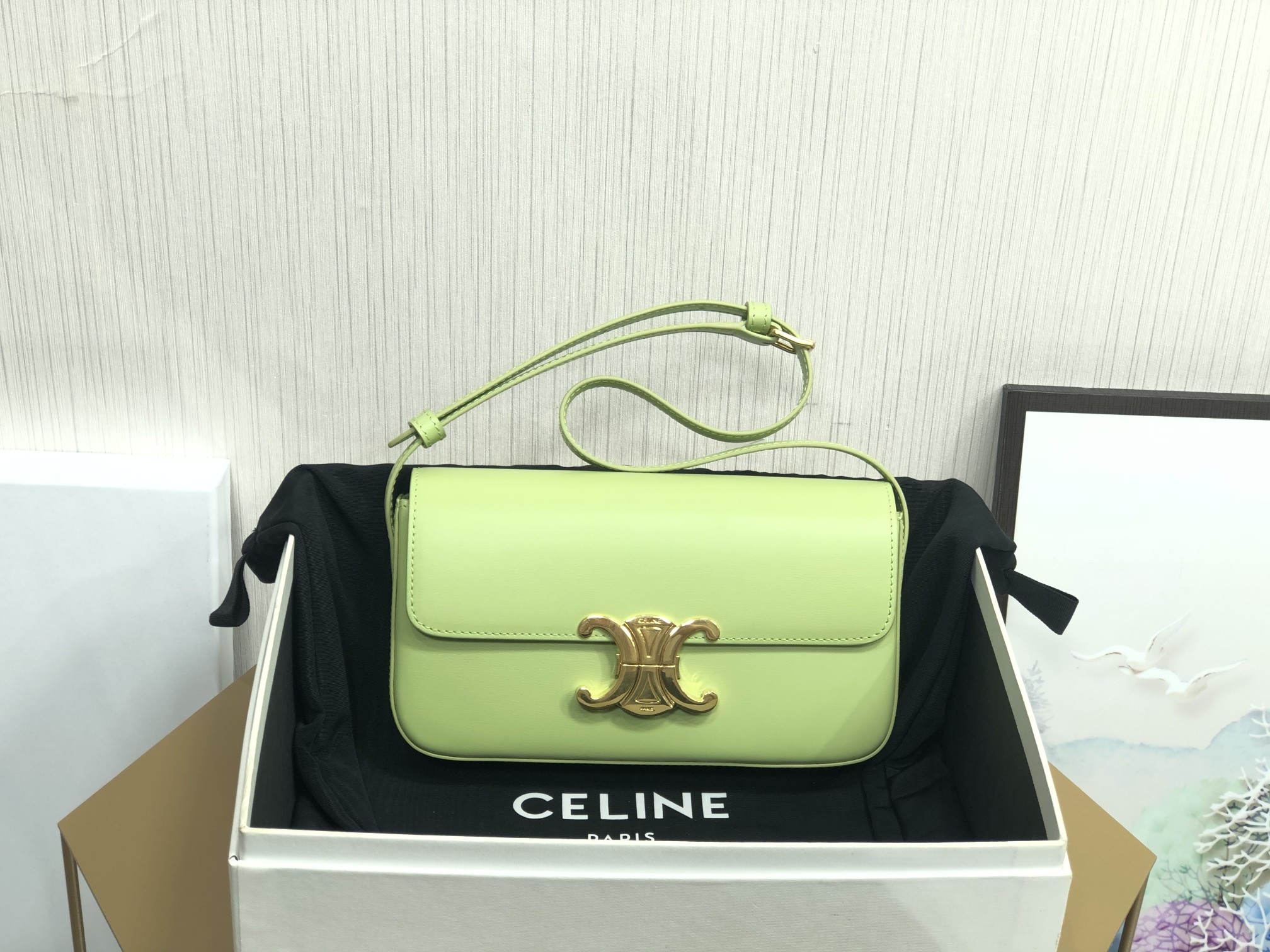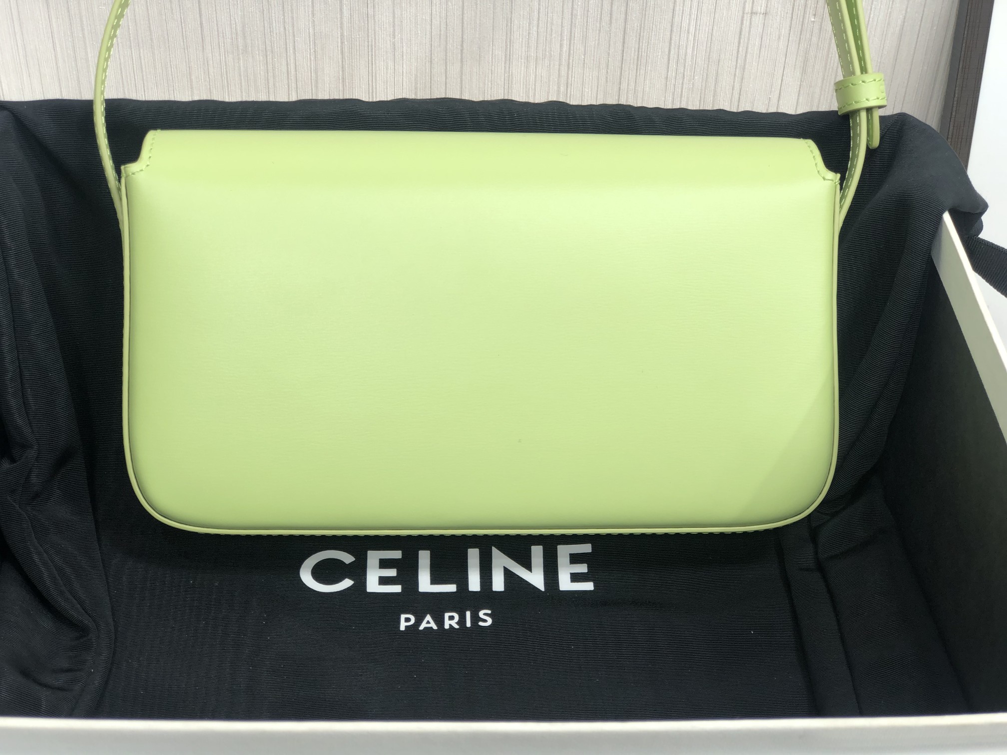 Material: Calfskin, lambskin leather lining. Shoulder carry, TRIOMPHE metal-feel clasp, interior flat pocket, adjustable leather shoulder strap length 20cm