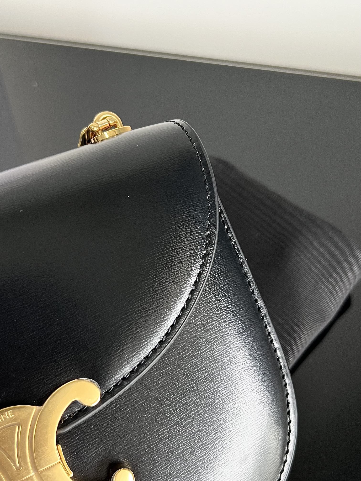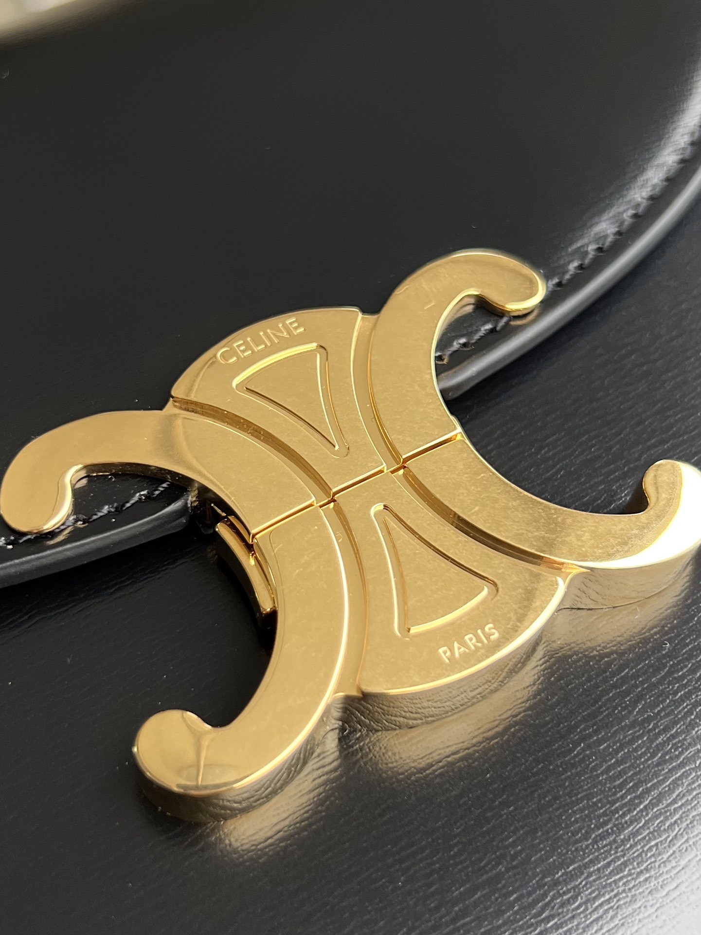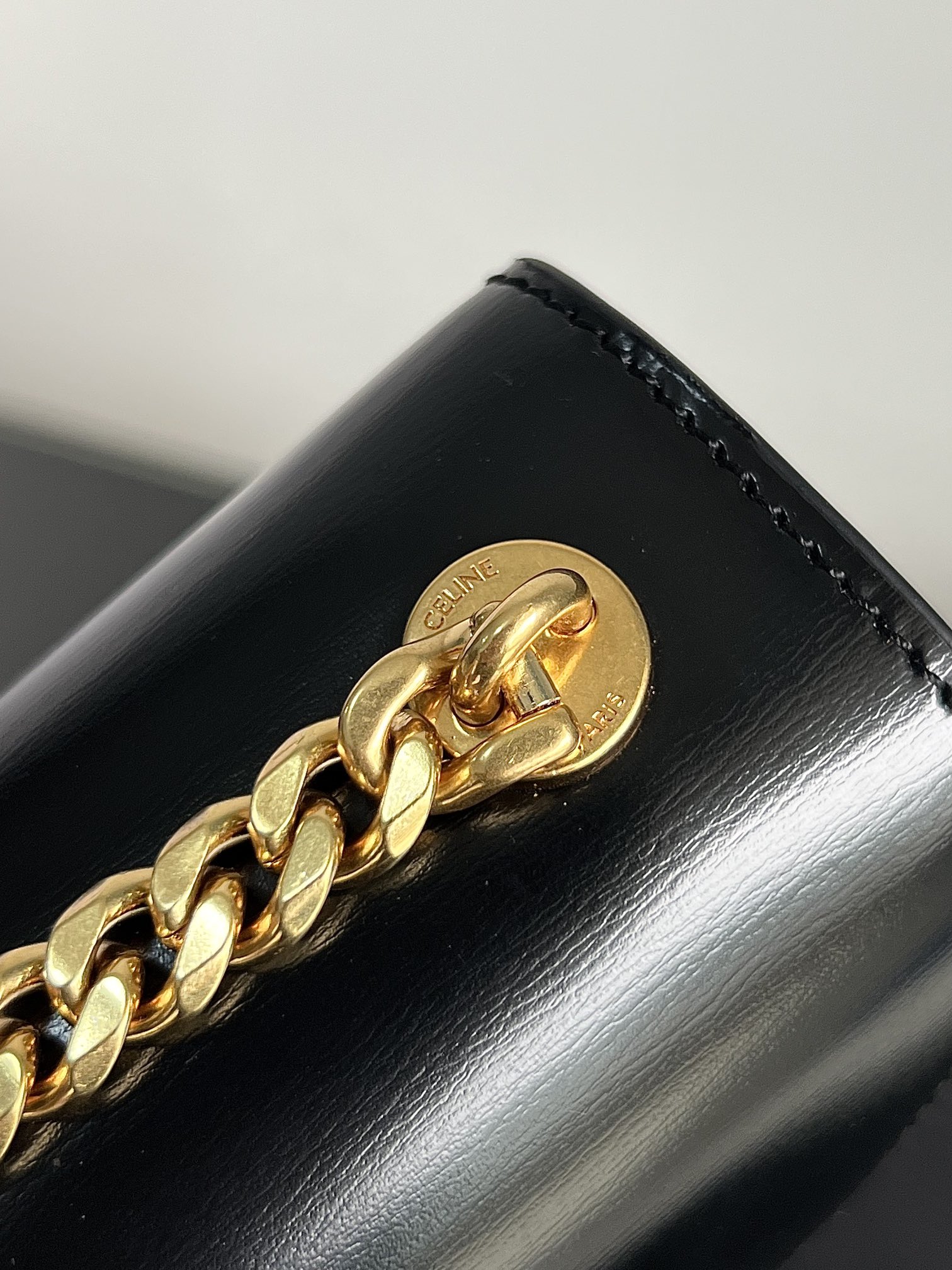 Original Title: CELINE Arc de Triomphe Chain Saddle BESACE CLEA Shiny Calf Leather Chain Bag, Dimensions: 18.5 X 14 X 6cm, Calf leather, Lambskin leather lining, Gold finish, Crossbody and shoulder carry, TRIOMPHE metal clasp, 3 interior compartments, 1 interior zippered pocket, 1 interior flat pocket