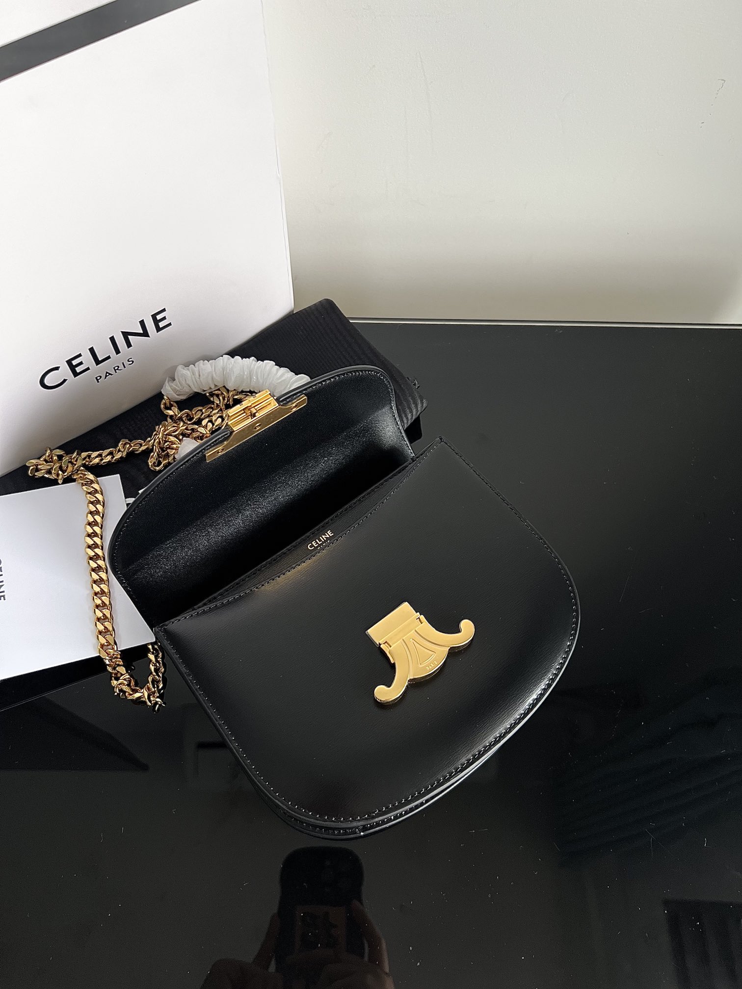 CELINE Arc de Triomphe Chain Saddle BESACE CLEA Shiny Calf Leather Chain Bag, Dimensions: 18.5 X 14 X 6cm, Calf leather, Lambskin leather lining, Gold finish, Crossbody and shoulder carry, TRIOMPHE metal clasp, 3 interior compartments, 1 interior zippered pocket, 1 interior flat pocket