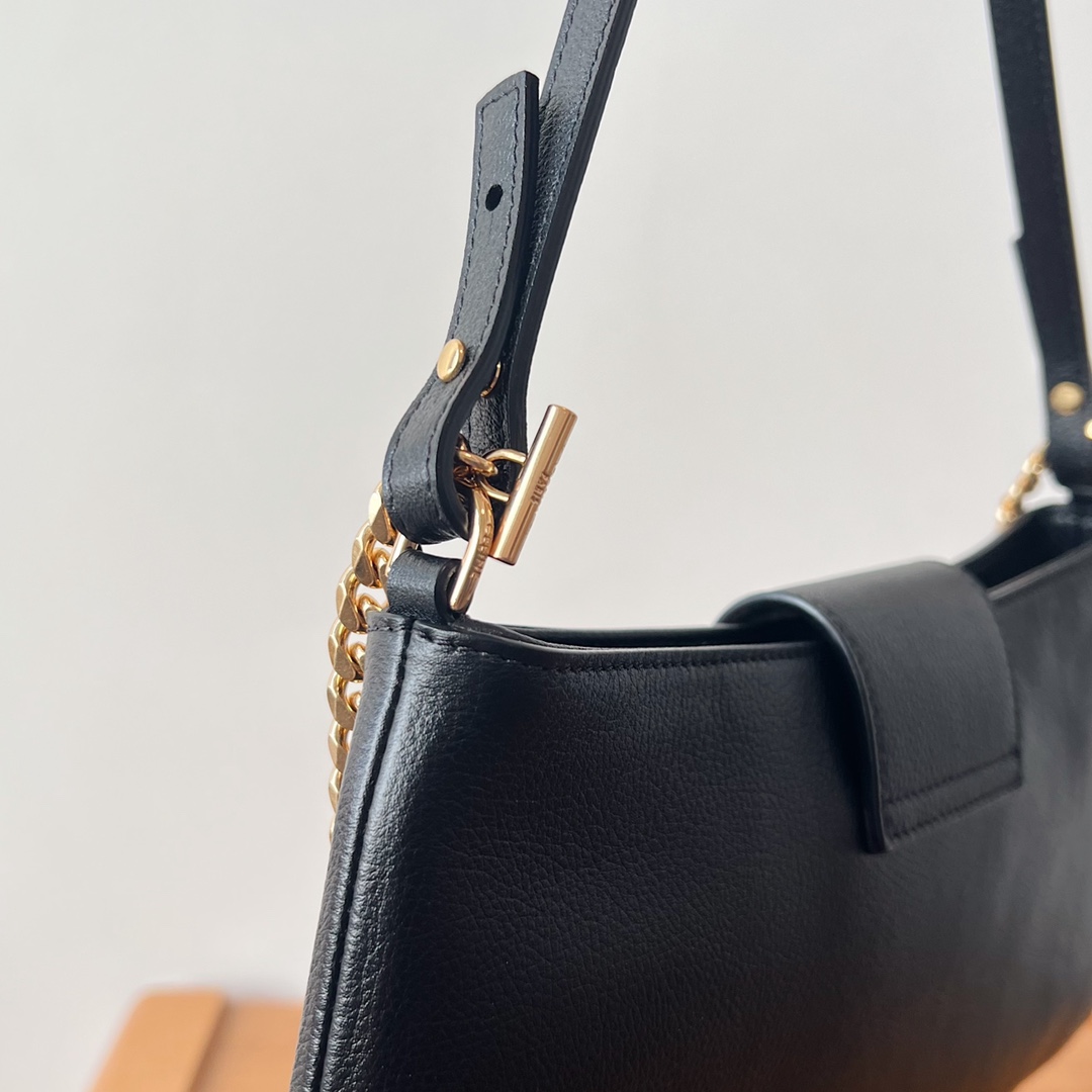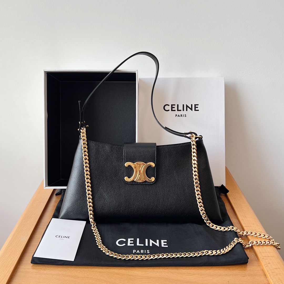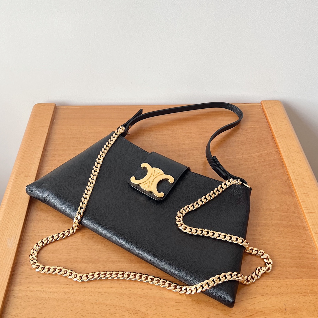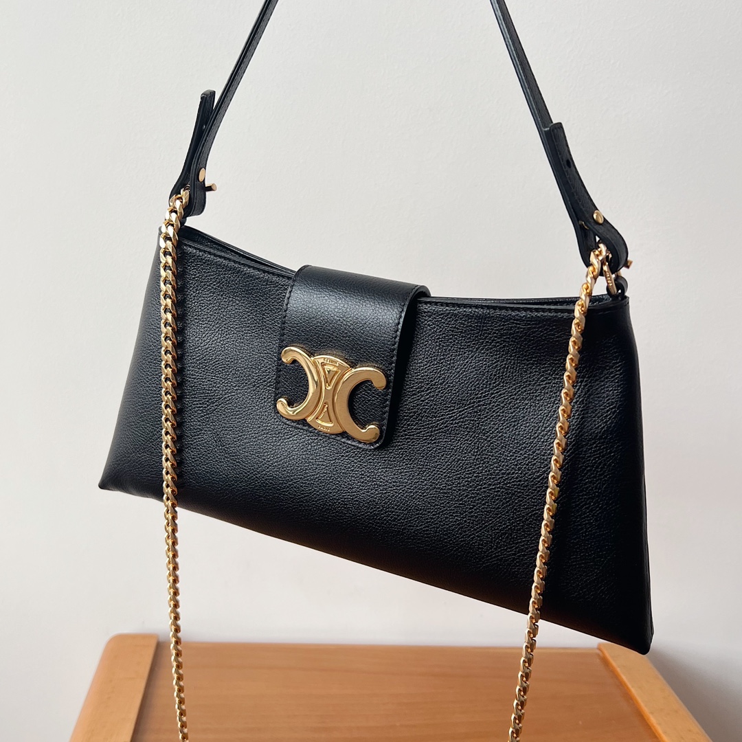 CELINE new model new bag trapezoid design, leather flap, equipped with TRIOMPHE magnetic buckle, zipper closure, clean and neat shape, strong sense of lines. Calfskin feels very soft, underarm bag appearance retro super fashionable 2 kinds of shoulder straps + leather shoulder strap or chain shoulder strap! Can be worn crossbody or underarm, retro full leather design as always versatile, really super nice, full aura, simply too eye-catching, little cuties quickly close your eyes and buy ✅✅