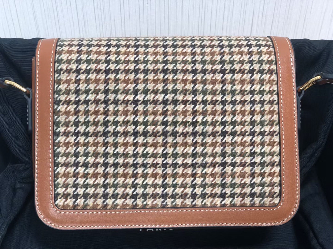Houndstooth canvas combined with cowhide, lined with lambskin. Can be carried on the shoulder, crossbody, or handheld. Comes with an adjustable strap.