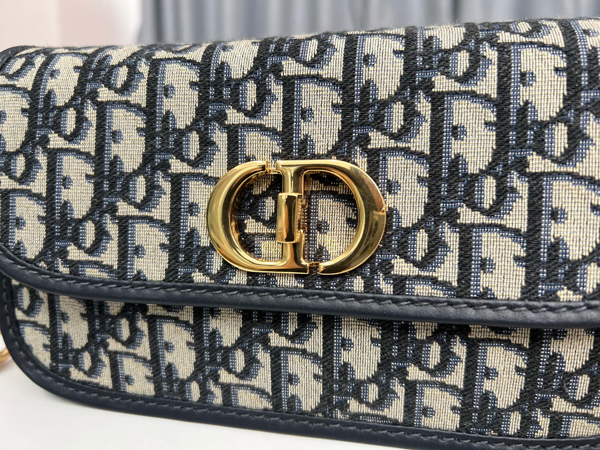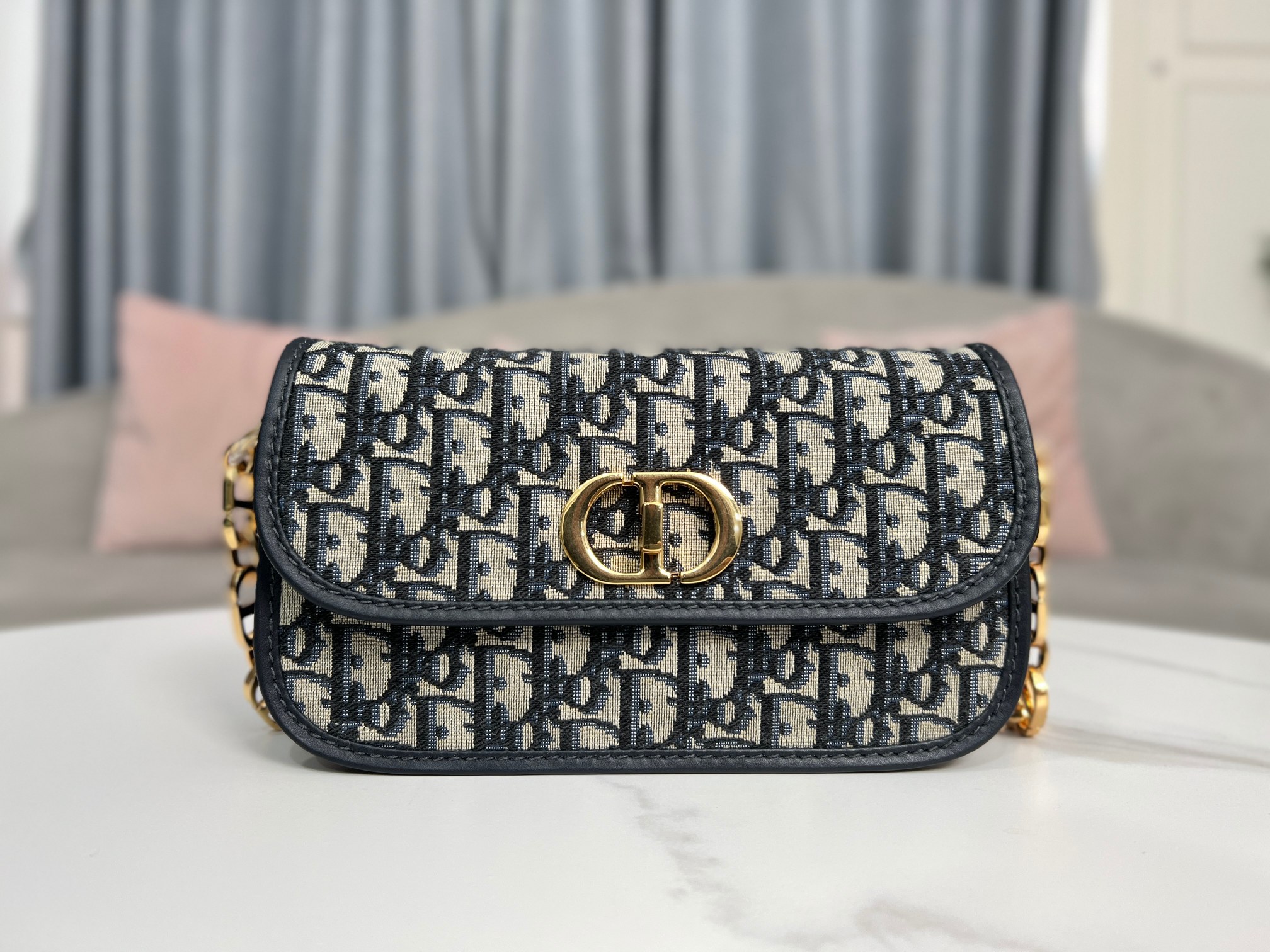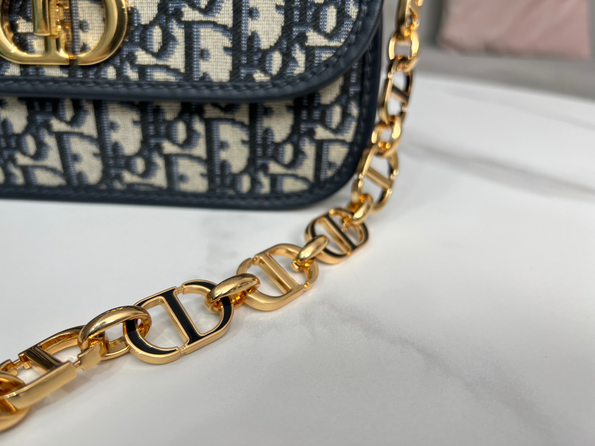 This 30 Montaigne Avenue handbag features an elegant design that elevates this classic collection. Meticulously crafted from blue Oblique printed fabric, it has a refined rounded flap and is adorned with an antique gold-finish metal CD clasp, inspired by the seal on Christian Dior perfume bottles. The back features an embossed 30 Montaigne logo, paired with a classic chain composed of alternating gold-finish metal and enamel links in a leather-matching tone. The pleated design offers ample space and a sophisticated silhouette, allowing it to be carried by hand, on the shoulder, or cross-body.