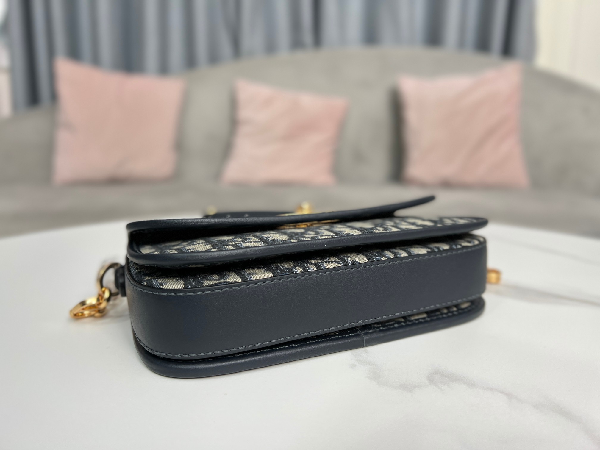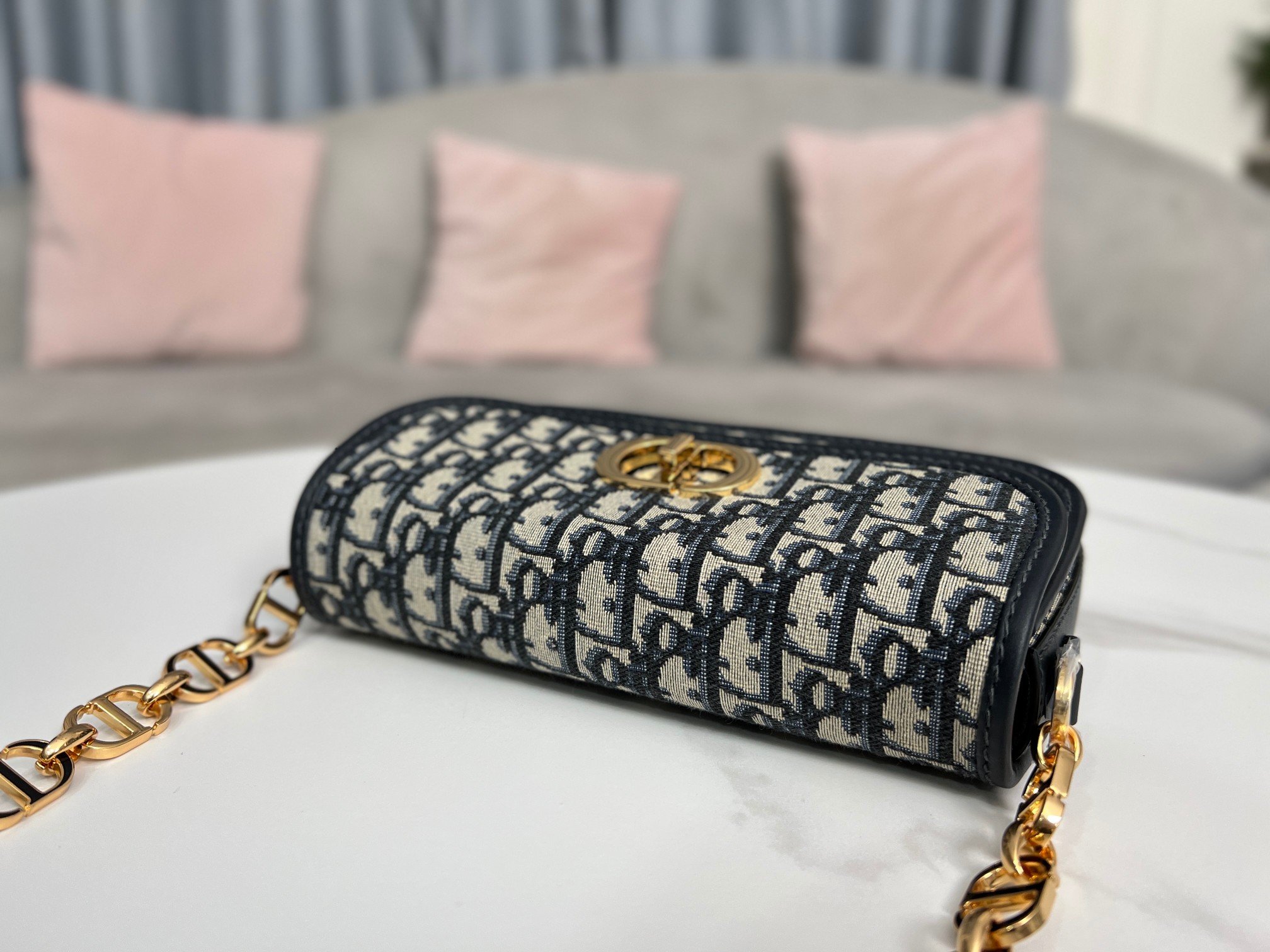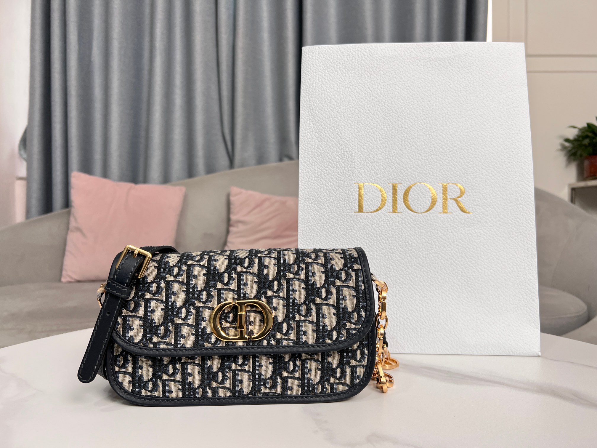 This 30 Montaigne Avenue handbag features an elegant design that elevates this classic collection. Meticulously crafted from blue Oblique printed fabric, it has a refined rounded flap and is adorned with an antique gold-finish metal CD clasp, inspired by the seal on Christian Dior perfume bottles. The back features an embossed 30 Montaigne logo, paired with a classic chain composed of alternating gold-finish metal and enamel links in a leather-matching tone. The pleated design offers ample space and a sophisticated silhouette, allowing it to be carried by hand, on the shoulder, or cross-body.