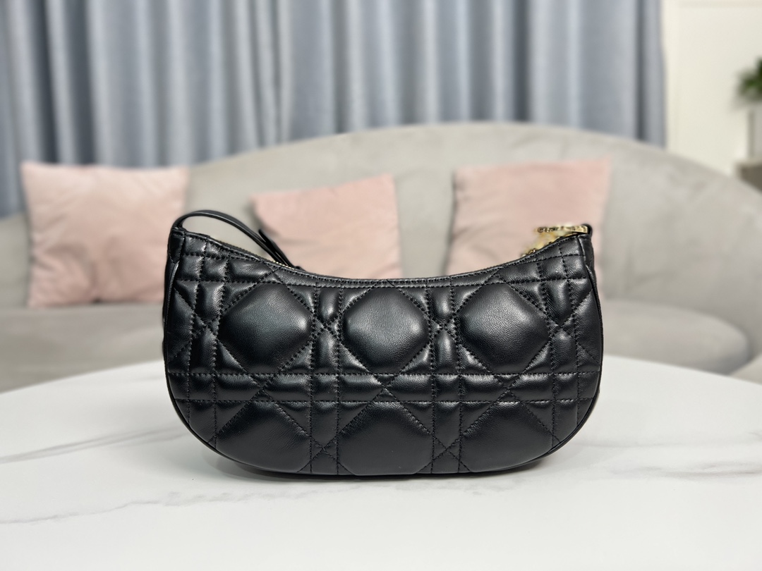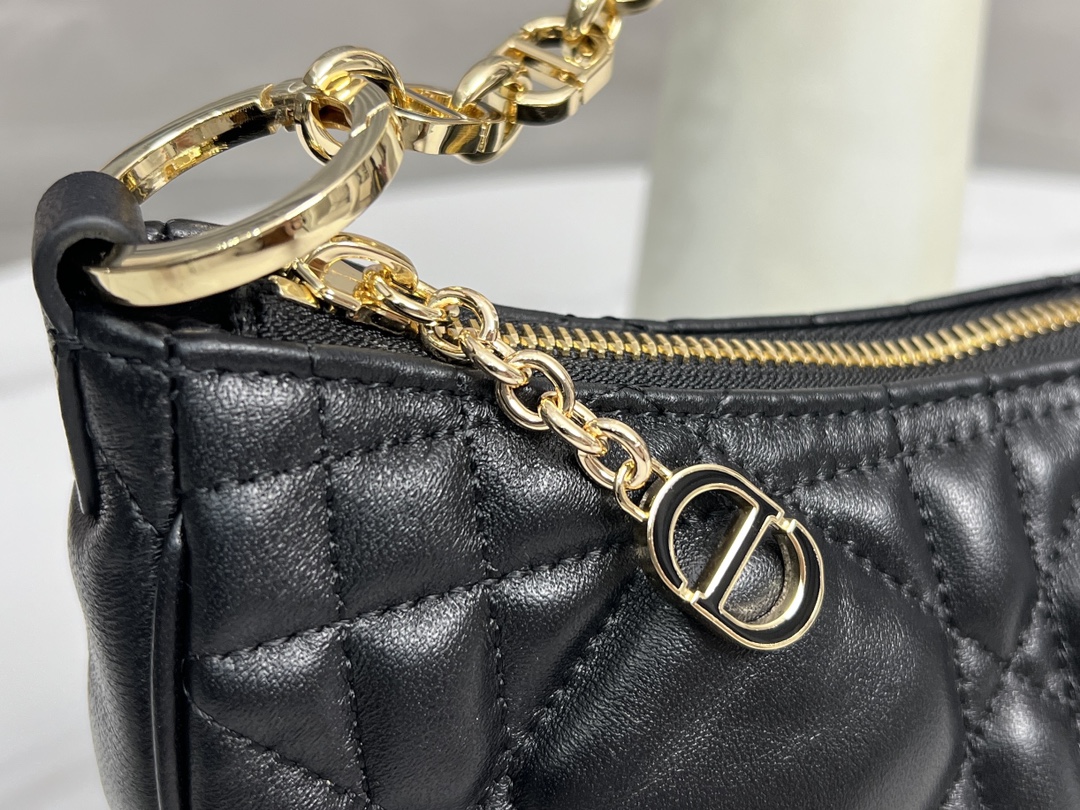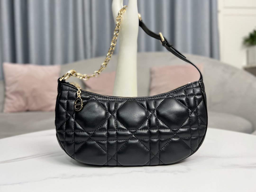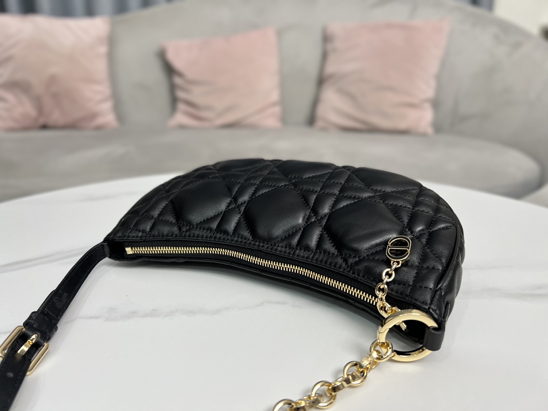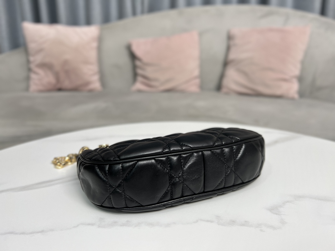 This CD Lounge handbag is a new arrival for Summer 2023, showcasing Dior's modern aesthetic and haute couture style. Meticulously crafted from black lambskin, it features oversized cannage stitching for an elevated look. The classic chain is combined with leather, alternately adorned with gold-finish metal and enamel links in a matching tone. Its foldable design allows for shoulder or hand carry.