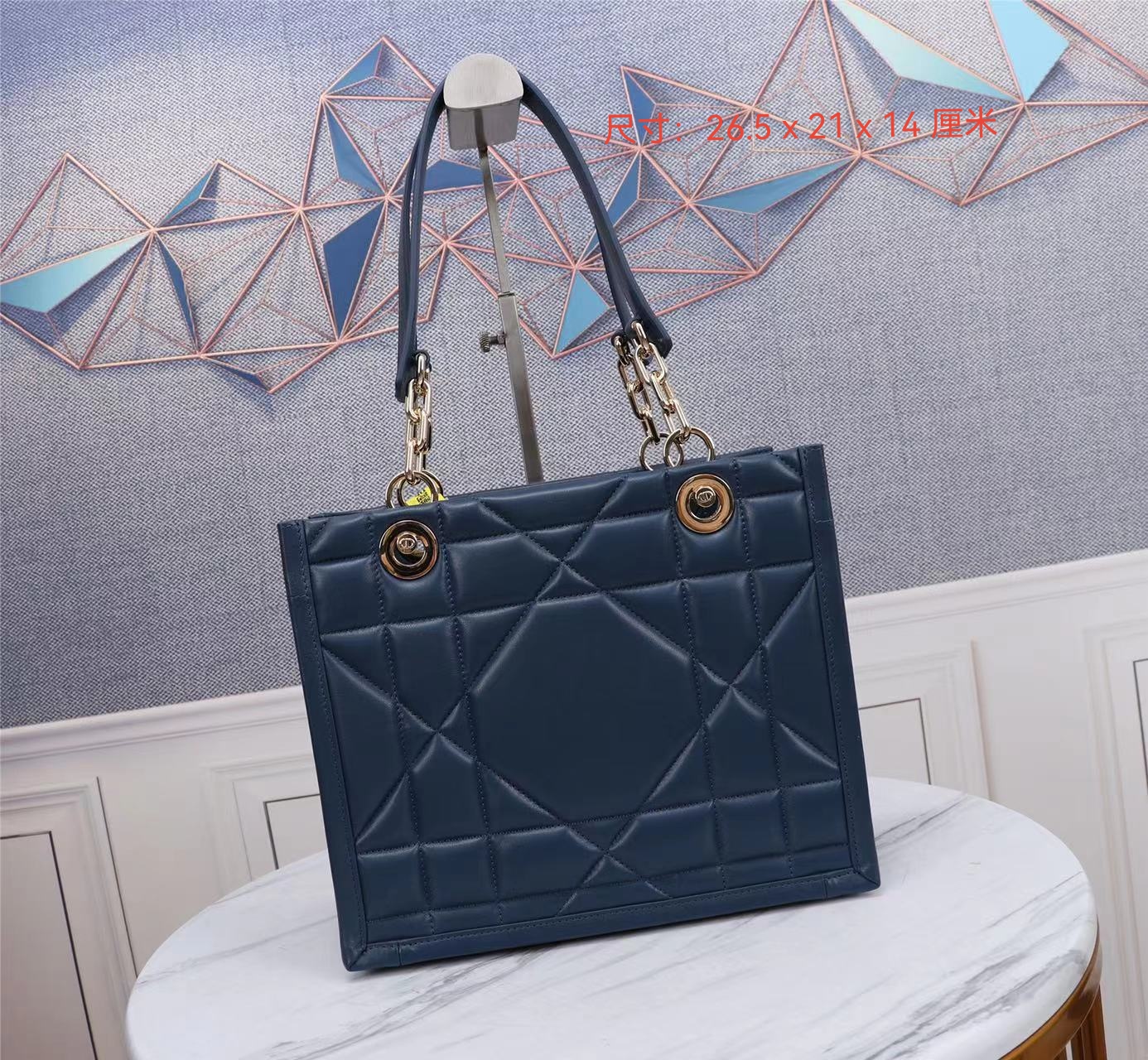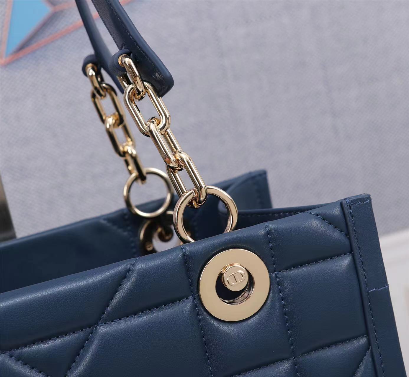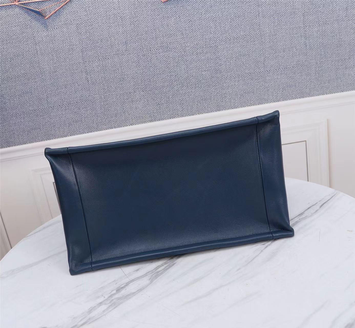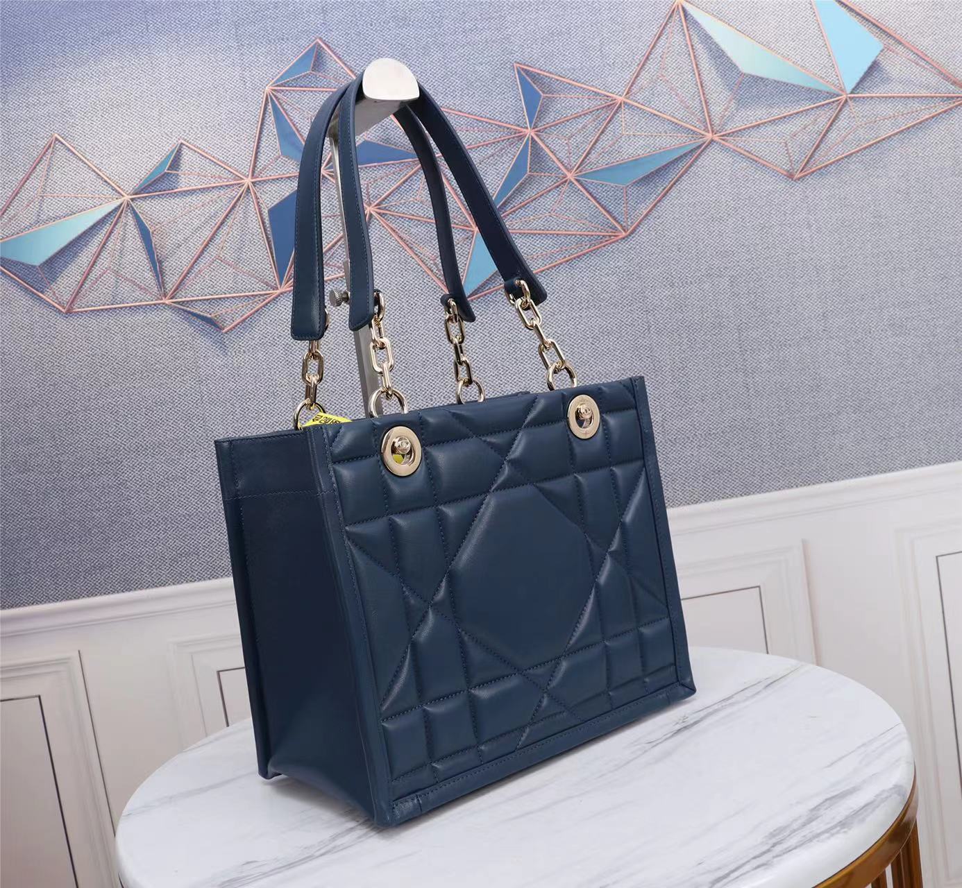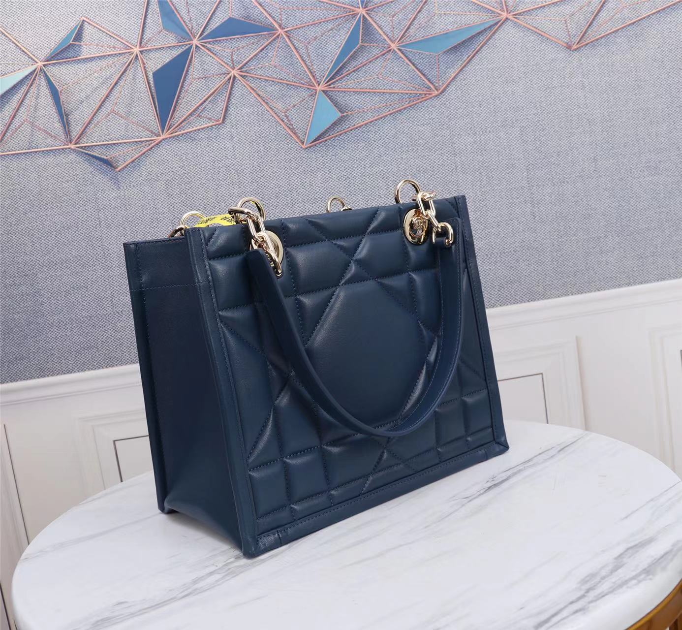 This Dior Essential bag is a newly launched key item from Dior, making a stunning debut in the Fall/Winter 2022 ready-to-wear collection show, showcasing a practical design with modern elegance. Meticulously crafted from deep navy blue satin-finished calfskin, adorned with an architectural Cannage pattern, it offers a fresh interpretation of Dior's iconic motif. The spacious interior features three patch pockets and one zippered pocket, accommodating various daily essentials. The small style comes with a leather and light gold-finished metal chain top handle, allowing for shoulder or hand carry, making it an ideal everyday companion.