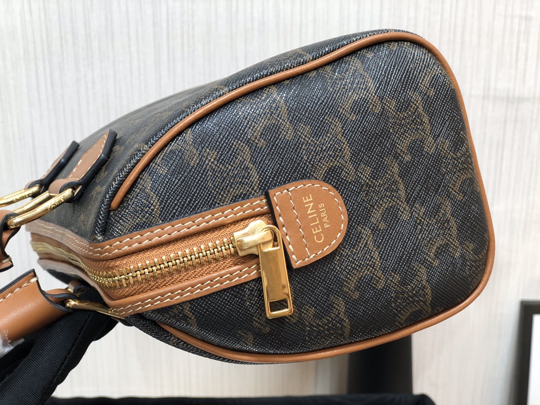 TRIOMPHE CANVAS signature print, calfskin trim, fabric lining, zipper closure, 1 main compartment, inside zippered pocket. Leather handle length 8cm