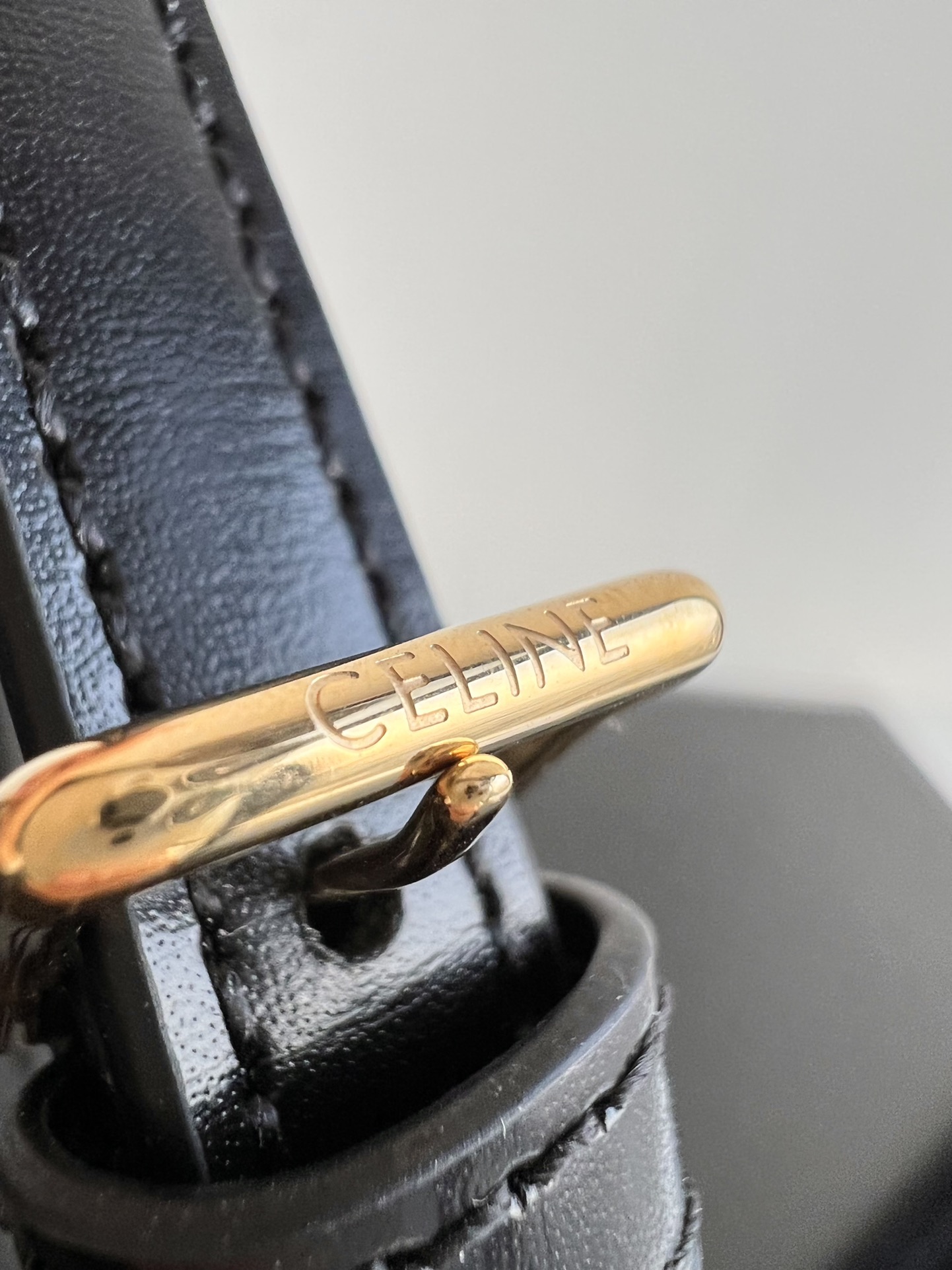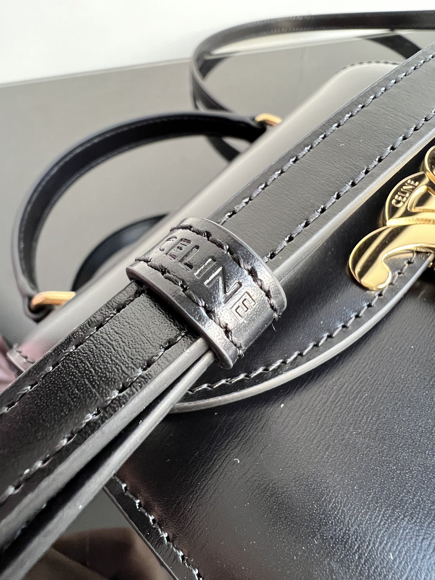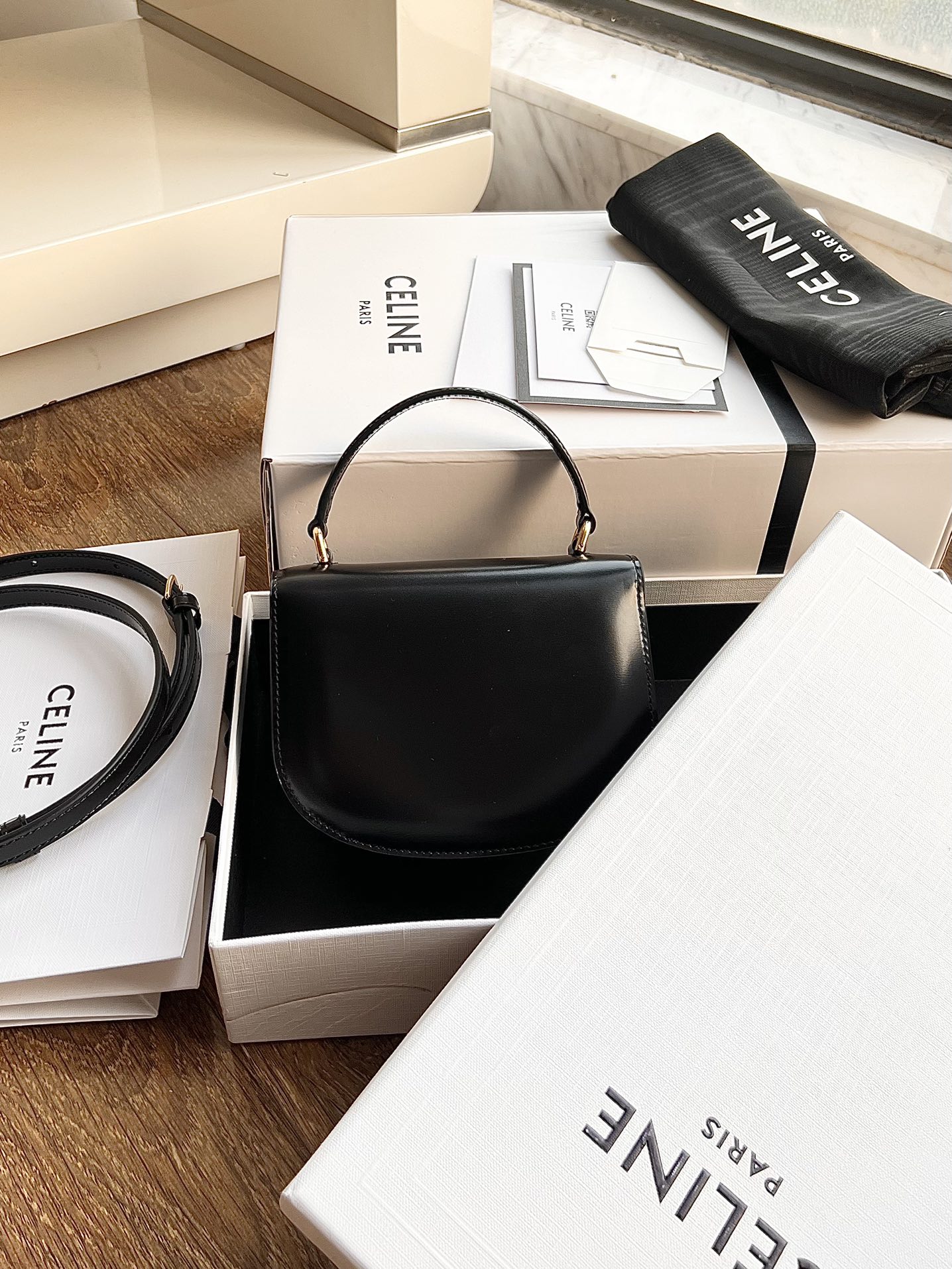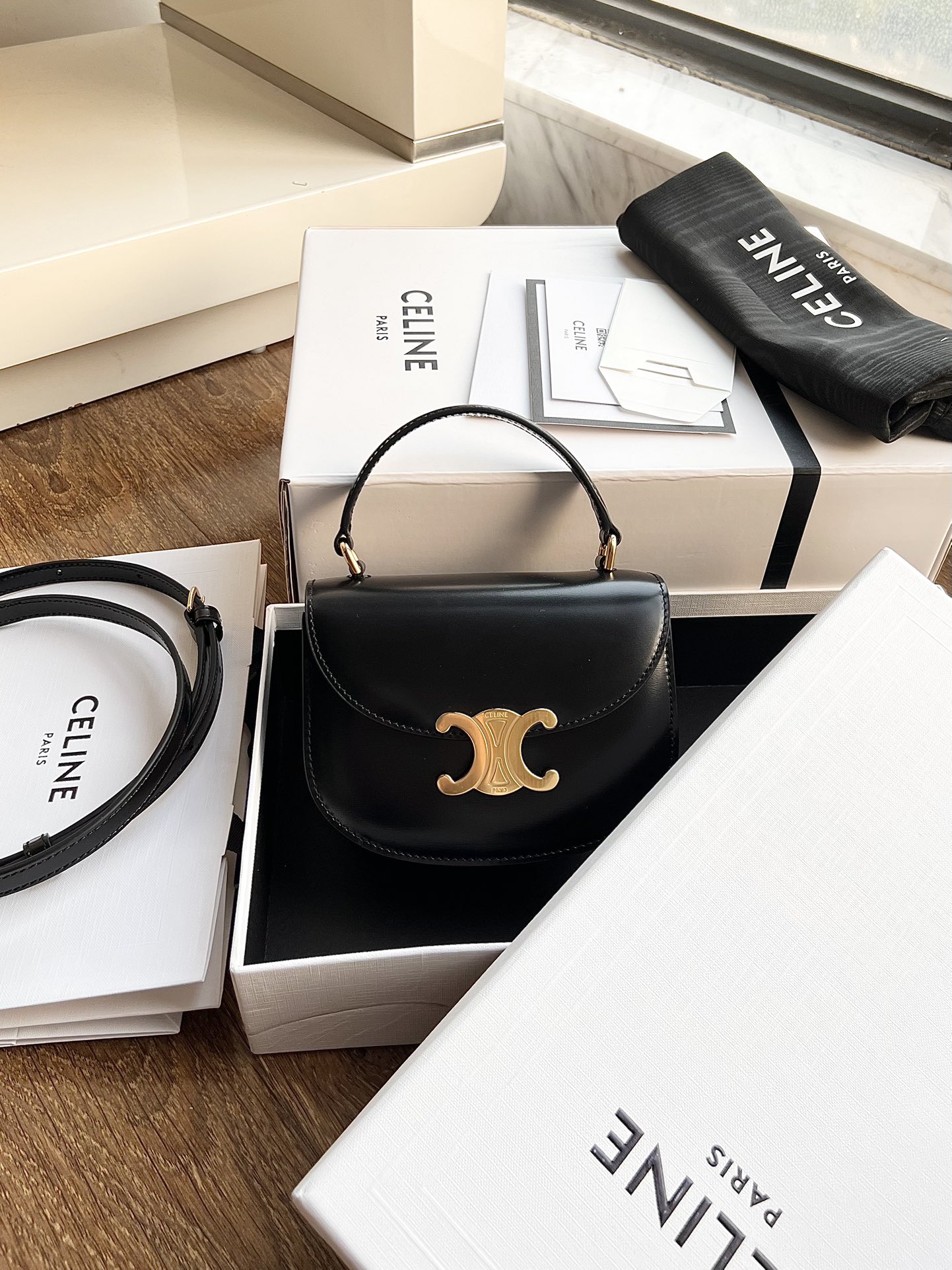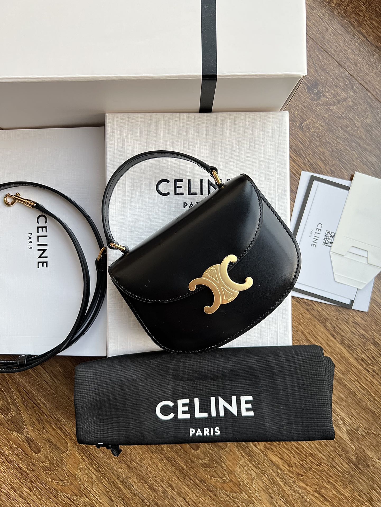 CELINE BESACE TRIOMPHE Mini Shiny Calfskin Bag, Triomphe Handheld Saddle, Dimensions: 15.5 X 11.5 X 5 cm. This style cannot fit larger smartphone models like PLUS. Can be worn crossbody, handheld, or on the shoulder. TRIOMPHE metal snap closure. 1 main compartment, inner flat pocket. Adjustable and detachable leather strap. [Original leather + full steel hardware] Market top-grade product, comes with full set of packaging as shown in pictures.
