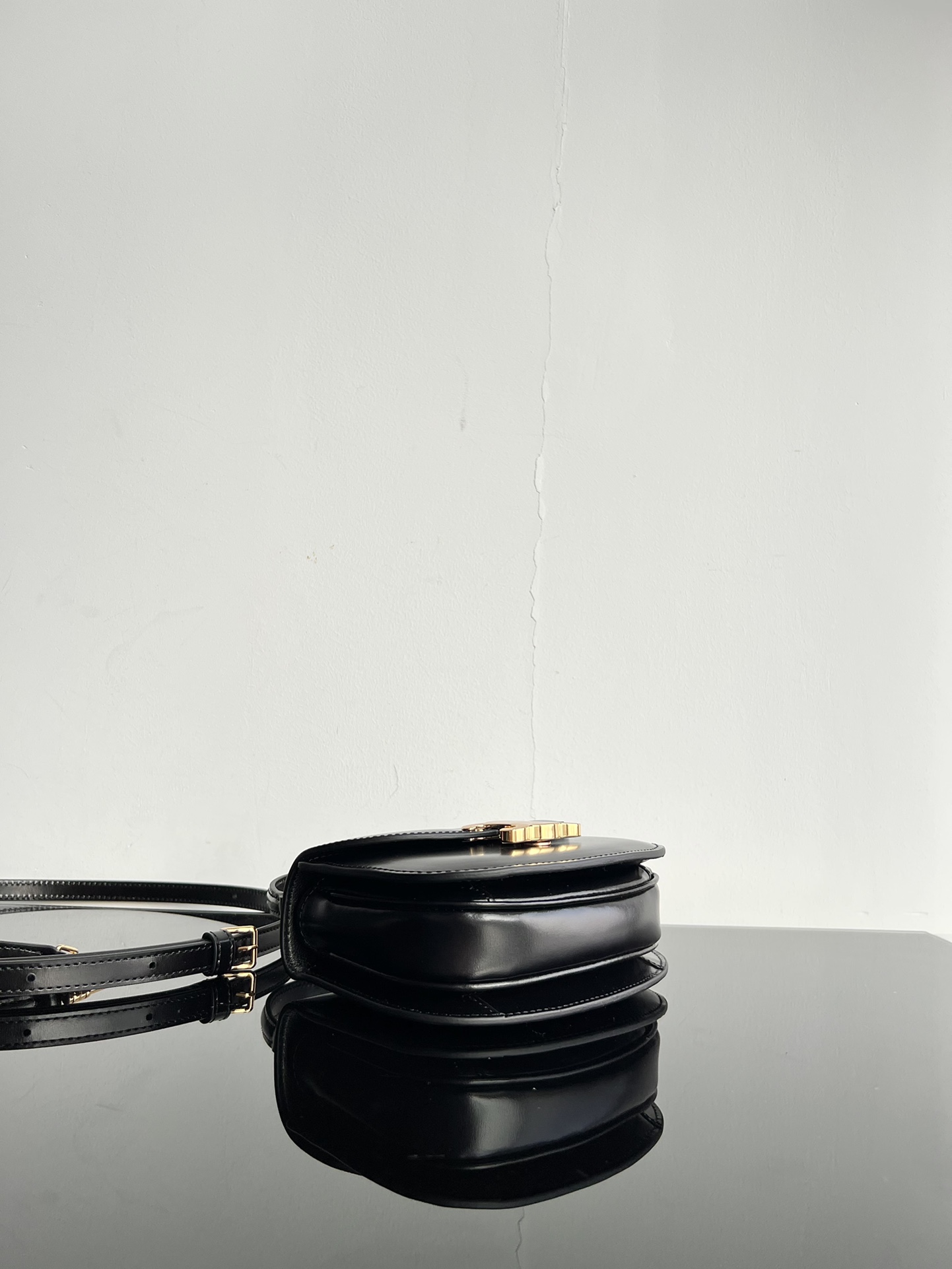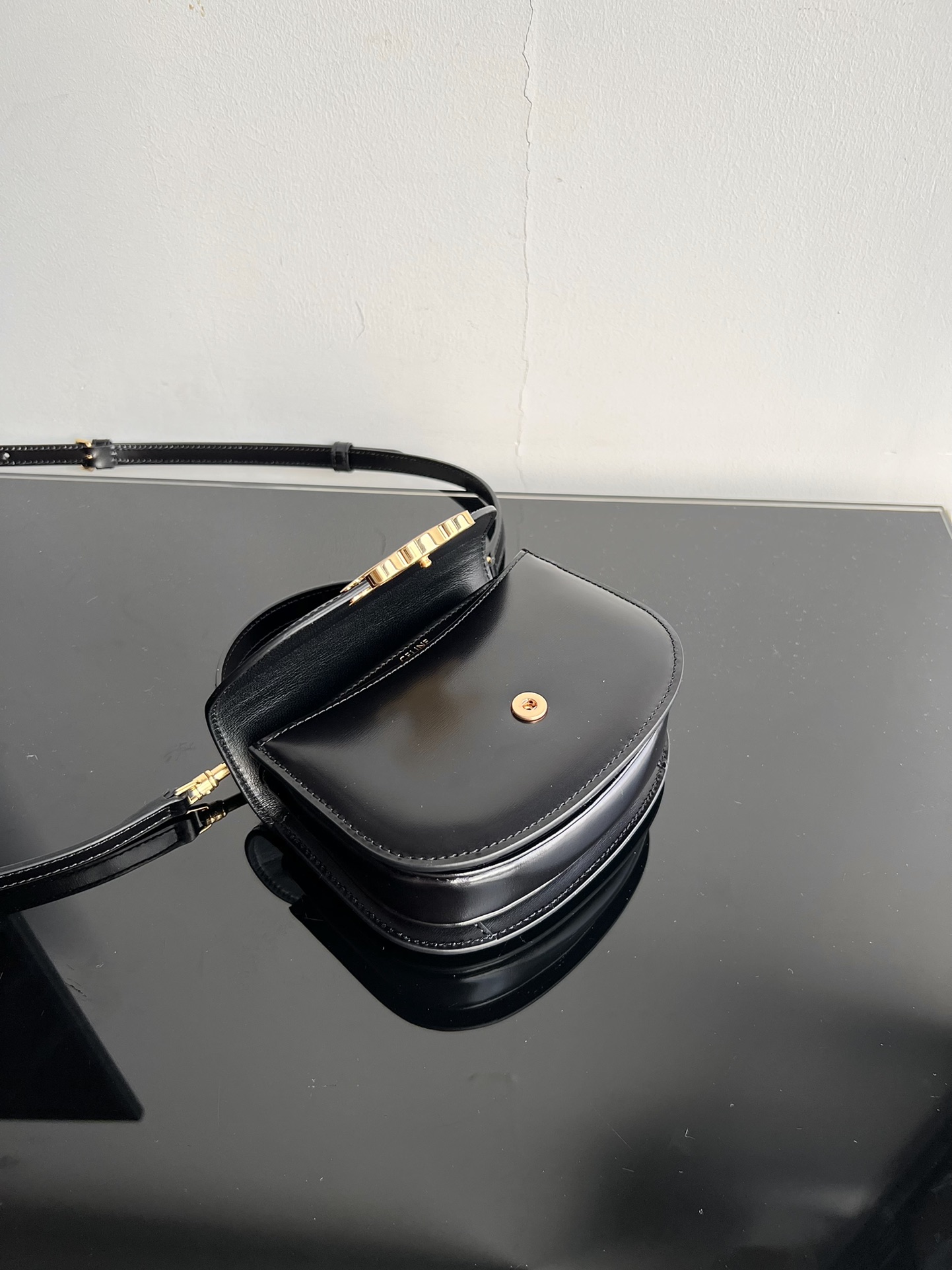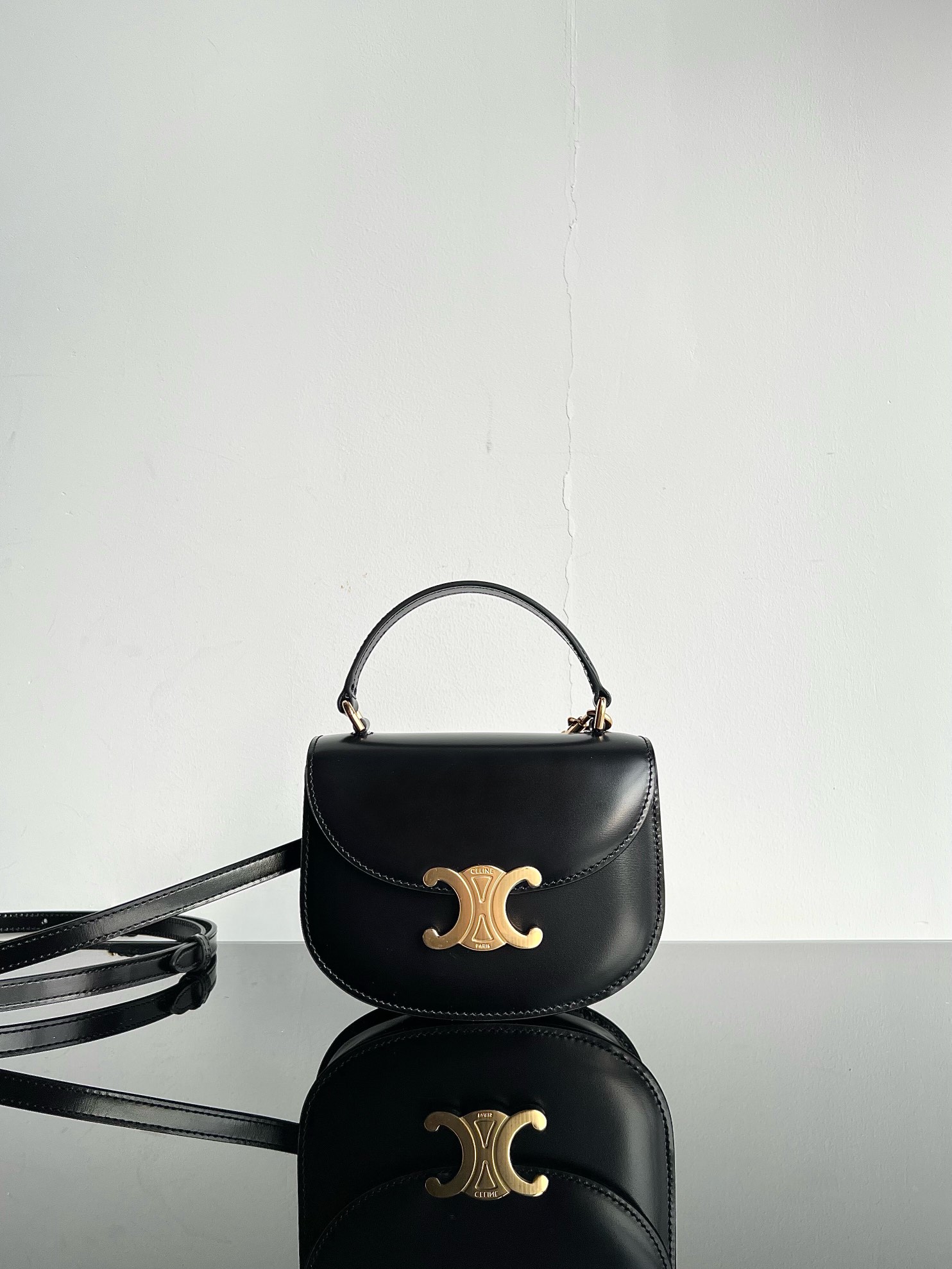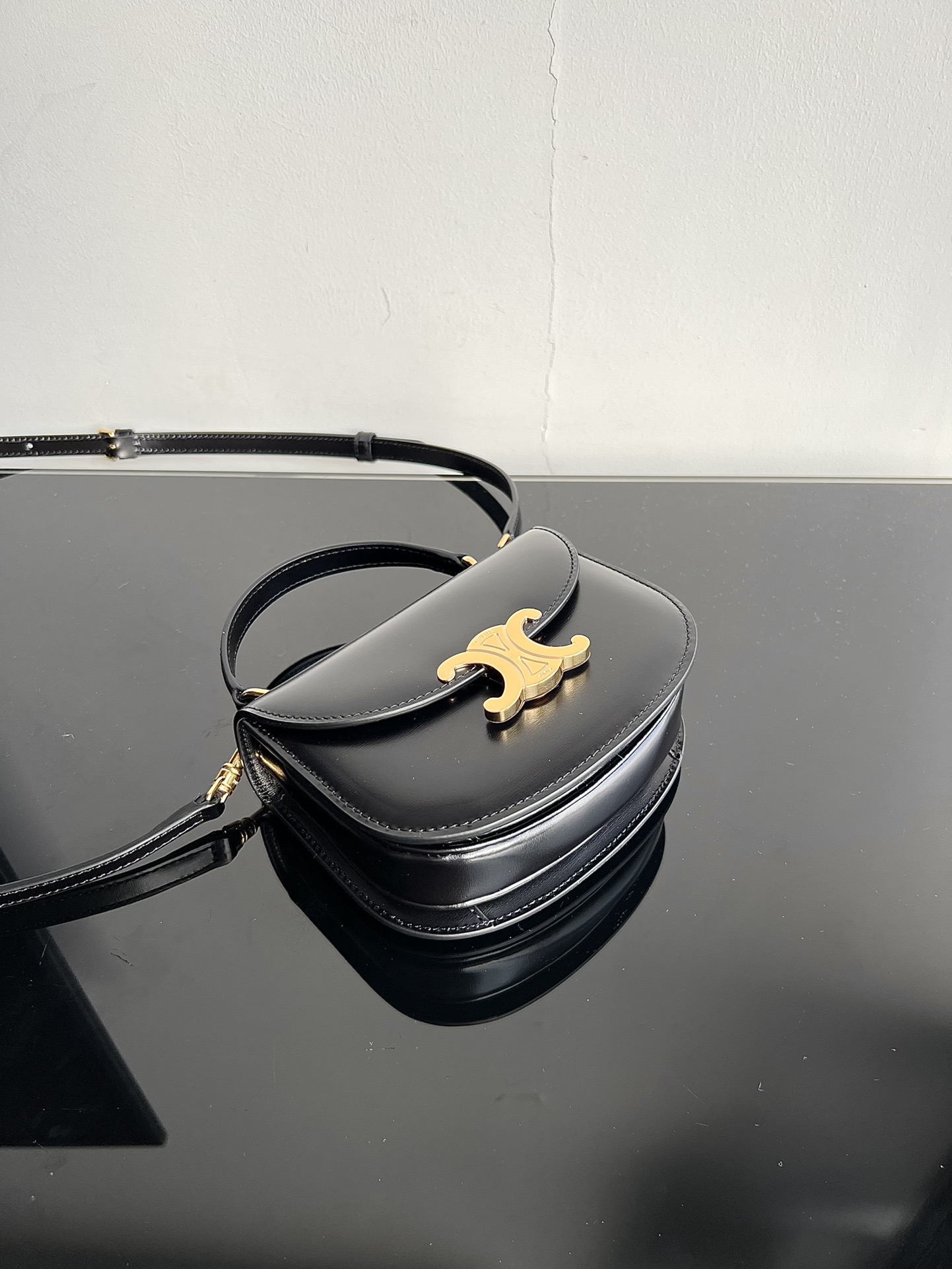 CELINE BESACE TRIOMPHE Mini Shiny Calfskin Handbag, Triomphe Handheld Saddle, Dimensions: 15.5 X 11.5 X 5 cm, This model cannot fit PLUS or other larger smartphone models, Can be cross-body, handheld, and shoulder-carried, TRIOMPHE metal snap closure, 1 main compartment, inner flat pocket, Adjustable and detachable leather strap [Original leather + Full steel hardware] Market top-grade product, Comes with full set of packaging as shown in the picture