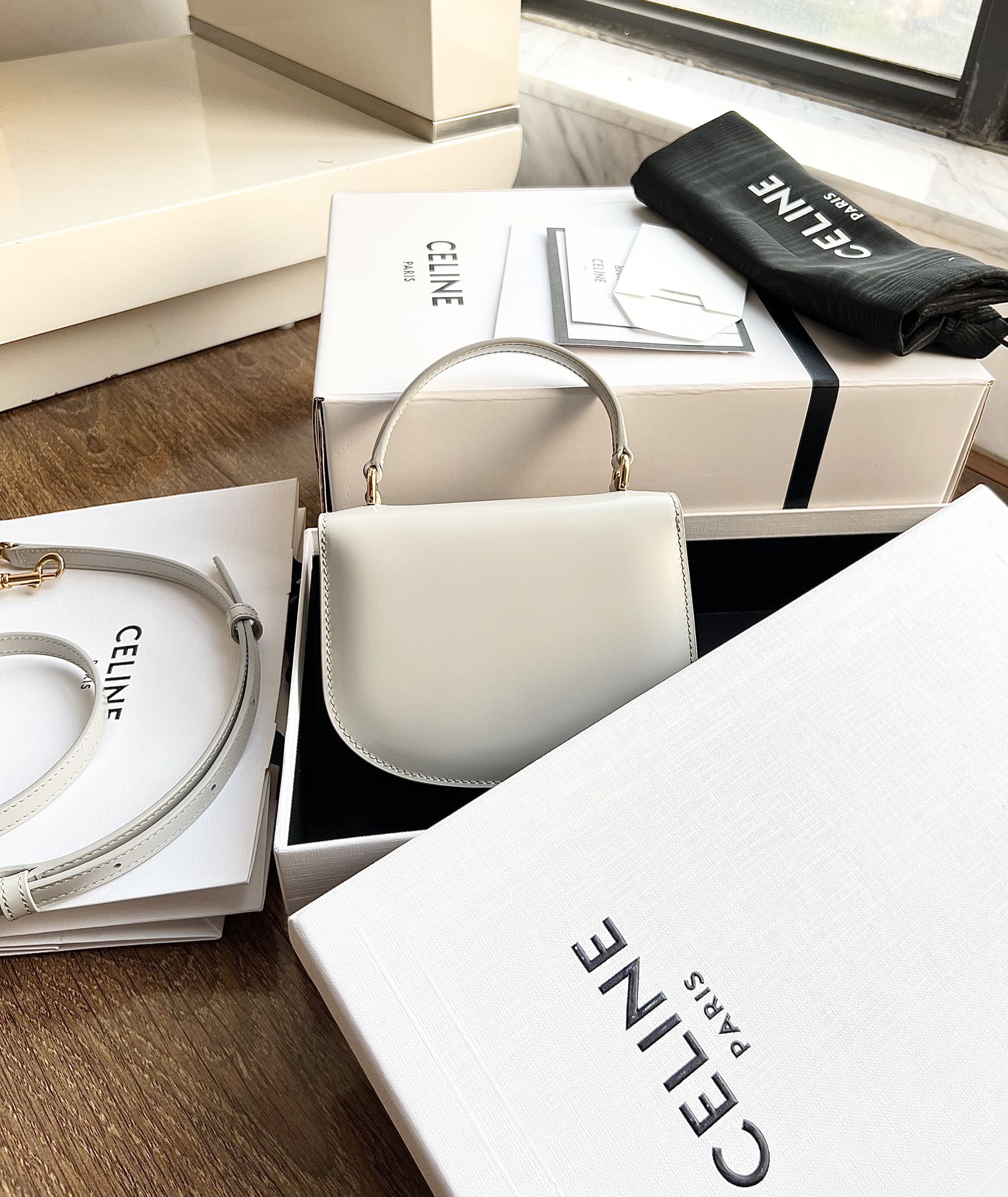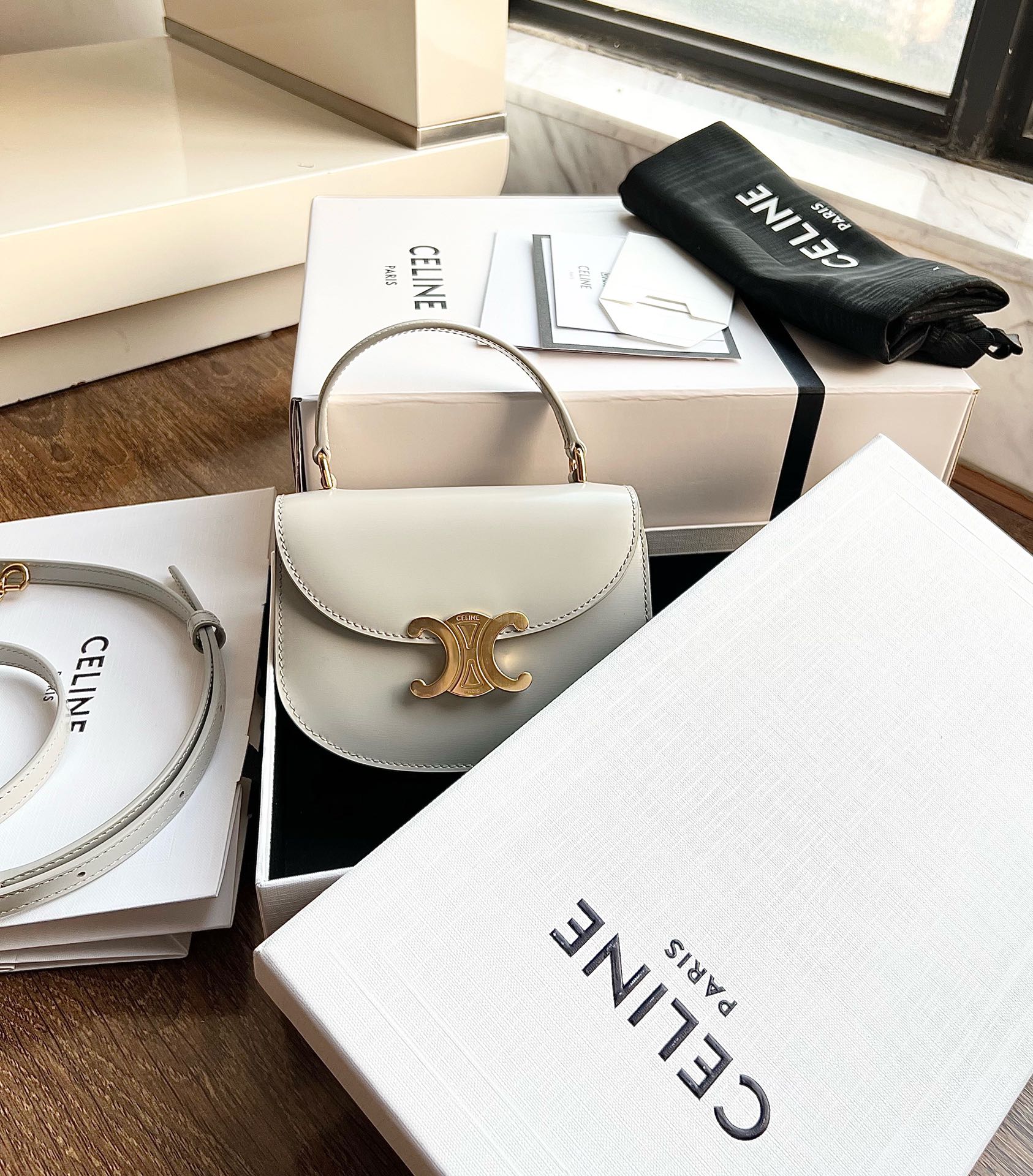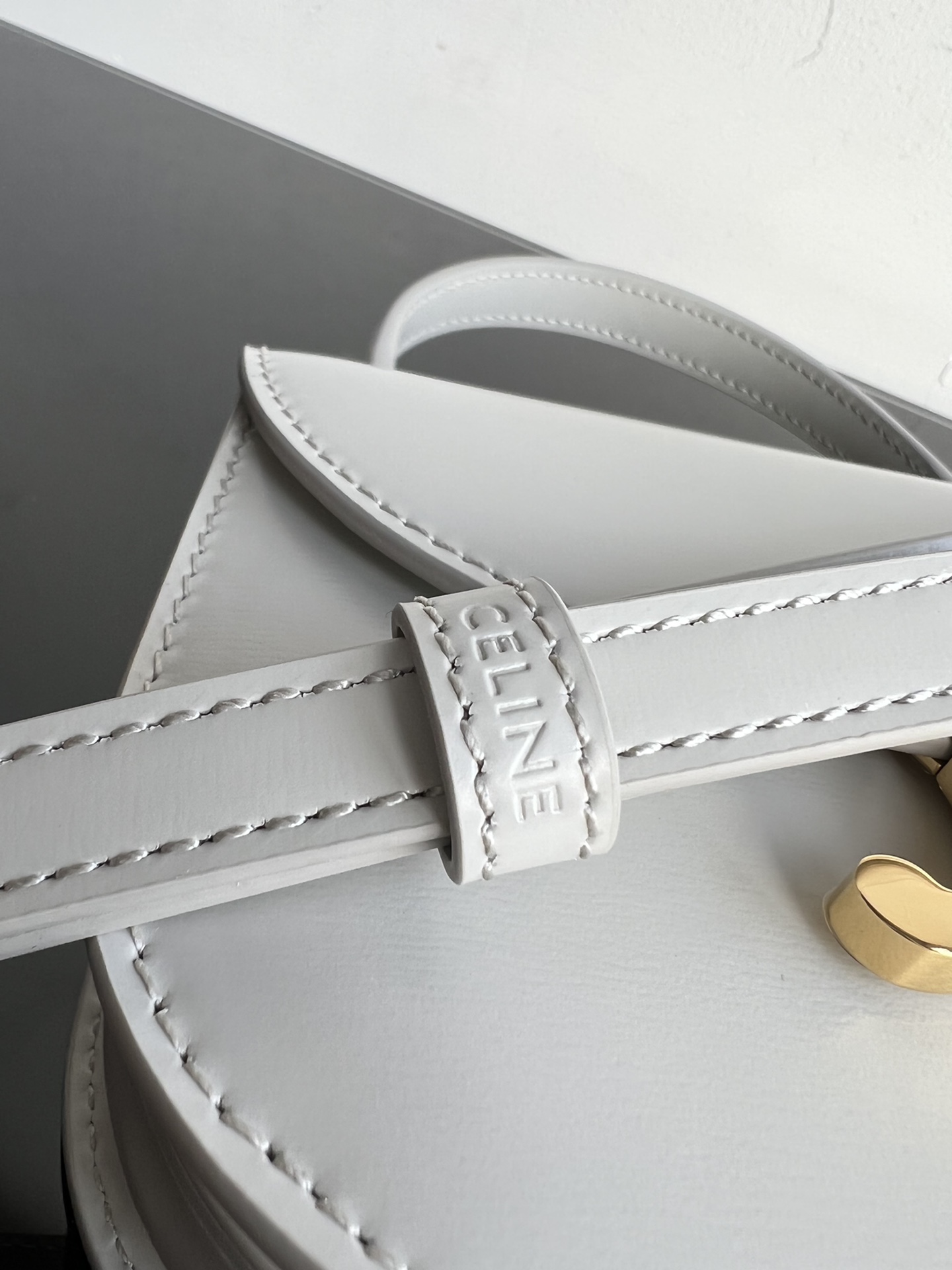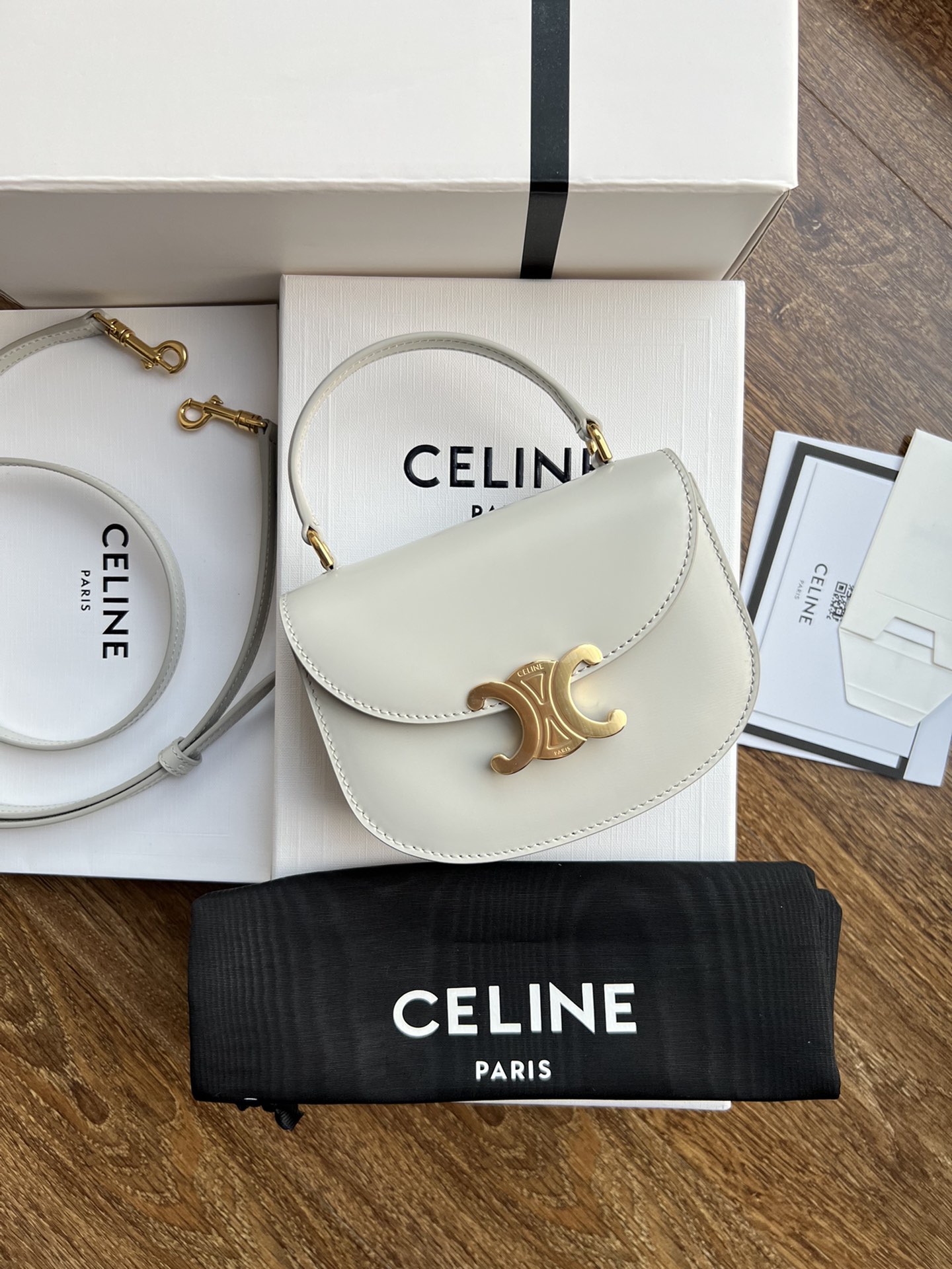 CELINE BESACE TRIOMPHE Mini Glossy Calfskin Handbag, Triumph Arch Handheld Saddle, Dimensions: 15.5 X 11.5 X 5 cm, This model cannot accommodate PLUS or other larger smartphone models, Can be worn cross-body, handheld, or on the shoulder, TRIOMPHE metal snap closure, 1 main compartment, inner flat pocket, adjustable and detachable leather strap [Original leather + full steel hardware] Market top-grade product, comes with full set of packaging as shown in pictures