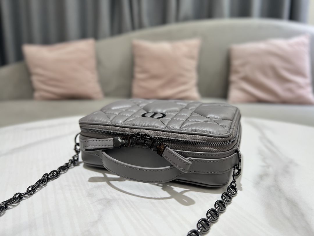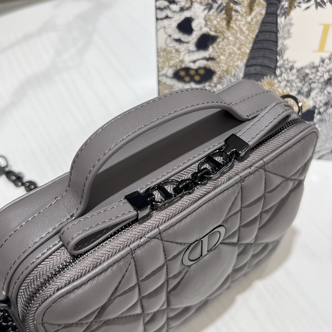 This Dior Caro box chain bag is a new season item, meticulously designed by Maria Grazia Chiuri, showcasing a fashionable style. Crafted from gray calfskin, it features a unique quilted oversized cannage pattern and a spacious compartment with three card slots to hold various daily essentials. The detachable chain strap is adorned with a leather strip for a comfortable adjustable effect, allowing it to be worn on the shoulder or cross-body, and it comes with a handle for easy carrying.