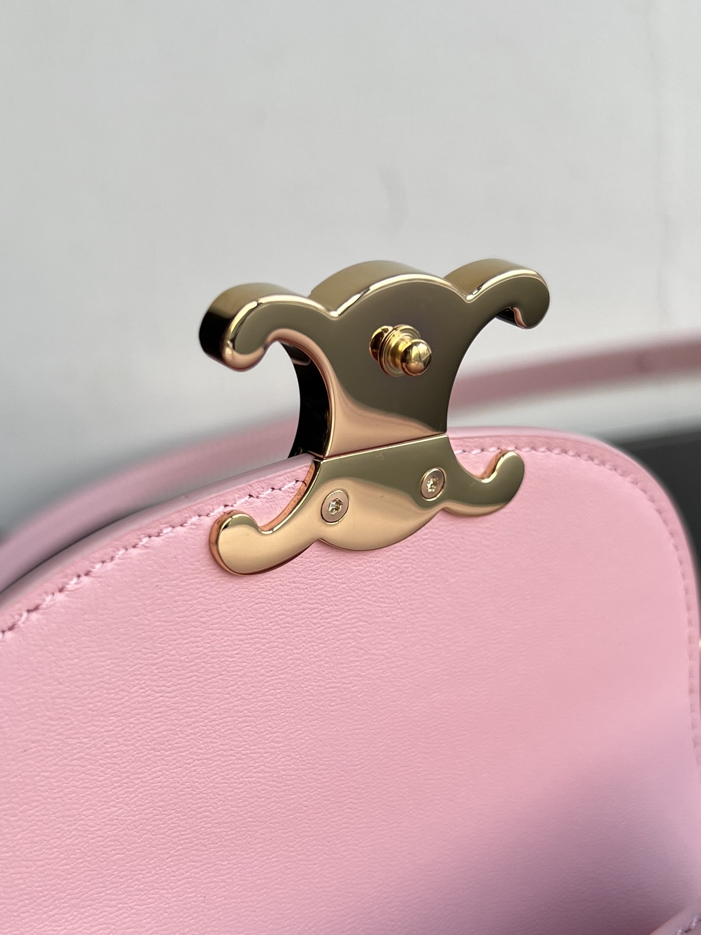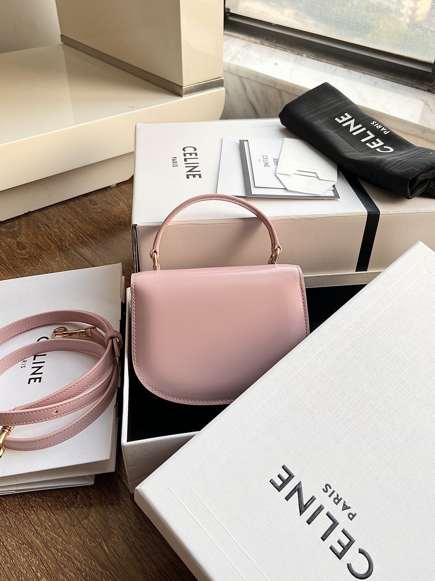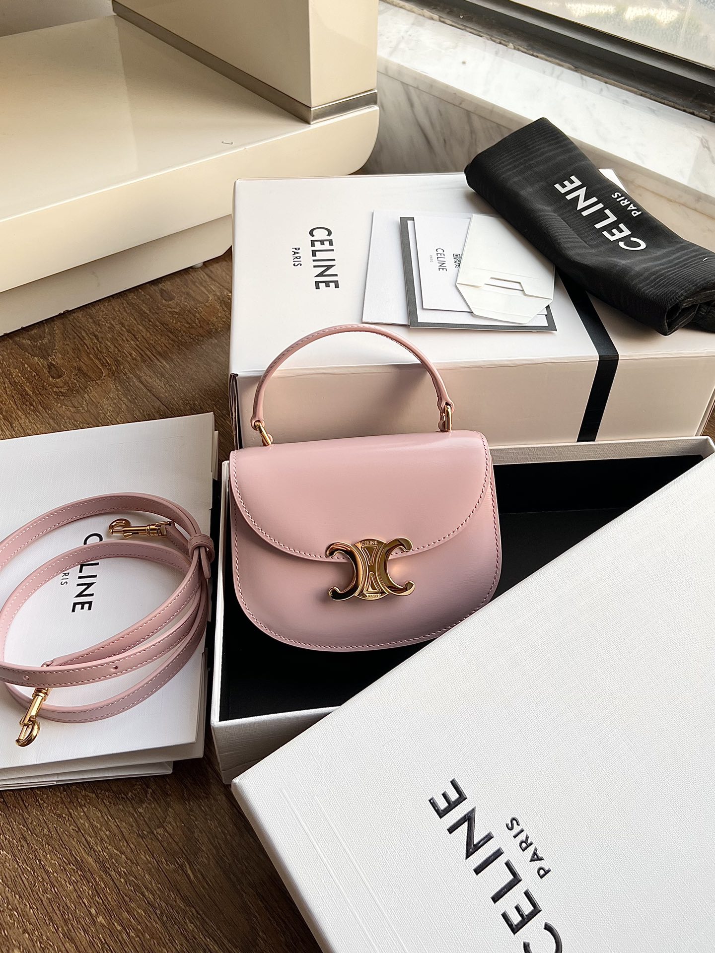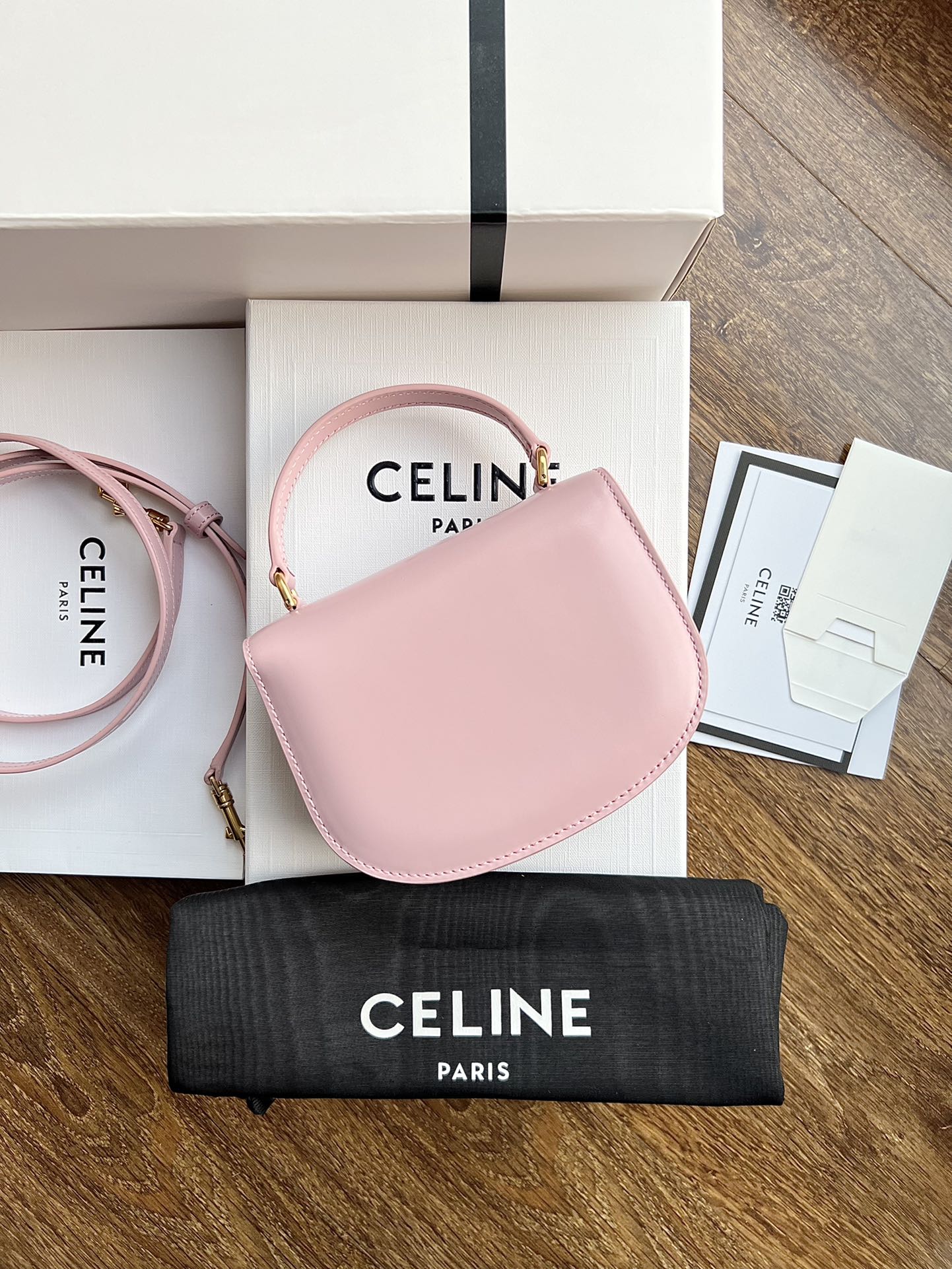 CELINE BESACE TRIOMPHE Mini Shiny Calfskin Handbag, Triumph Arch Saddle Bag, Dimensions: 15.5 X 11.5 X 5 cm. This model cannot accommodate larger smartphones such as PLUS. Can be worn crossbody, carried by hand, or on the shoulder. TRIOMPHE metal snap closure. 1 main compartment, inner flat pocket. Adjustable and detachable leather strap. [Original leather + full steel hardware] Top market quality, comes with full set of packaging as shown in pictures.