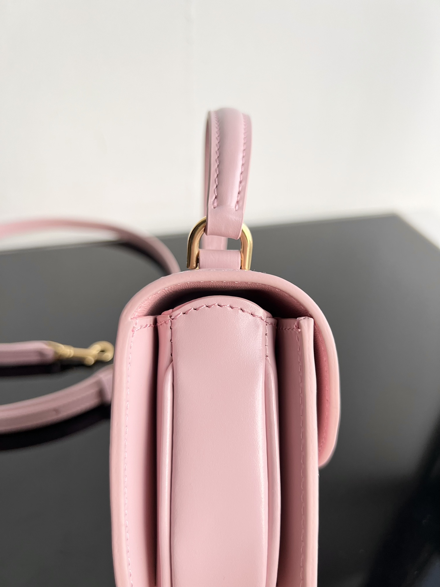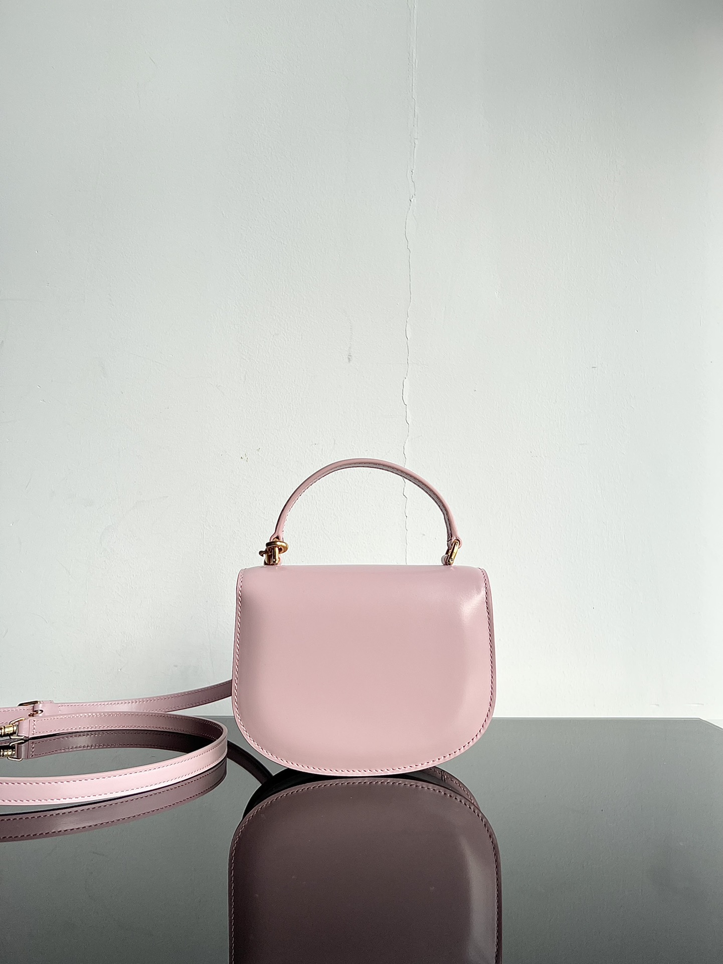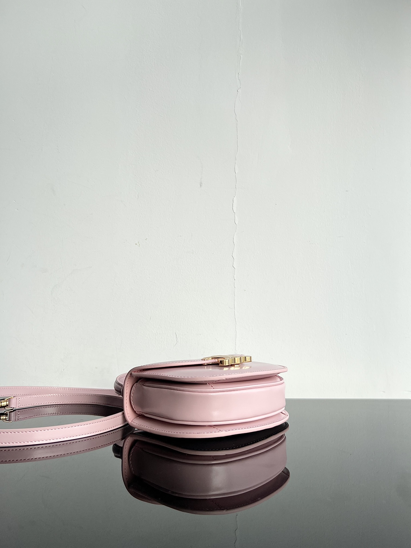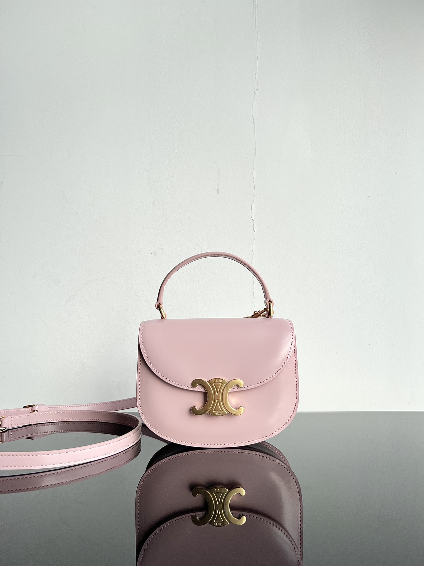 CELINE BESACE TRIOMPHE Mini Glossy Calfskin Handbag, Triomphe Handheld Saddle Bag. Dimensions: 15.5 X 11.5 X 5 cm. This style cannot accommodate larger smartphone models such as PLUS. Can be worn crossbody, handheld, or on the shoulder. TRIOMPHE metal snap closure. 1 main compartment, inner flat pocket. Adjustable and detachable leather strap [Original leather + full steel hardware]