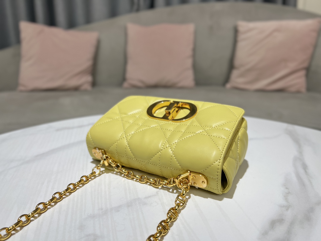 This Dior Caro bag combines elegant temperament with a modern style. Meticulously crafted from light yellow calfskin, it features original oversized quilted Cannage stitching, creating a unique look. The flap is adorned with a vintage gold-finished metal knob-style "CD" clasp, inspired by the seal of a Christian Dior perfume bottle. The medium style comes with a detachable "CD" link strap, allowing it to be carried by hand or on the shoulder. It can also be replaced with Dior's embroidered wide strap to embellish everyday looks or add a touch of brilliance to evening wear.